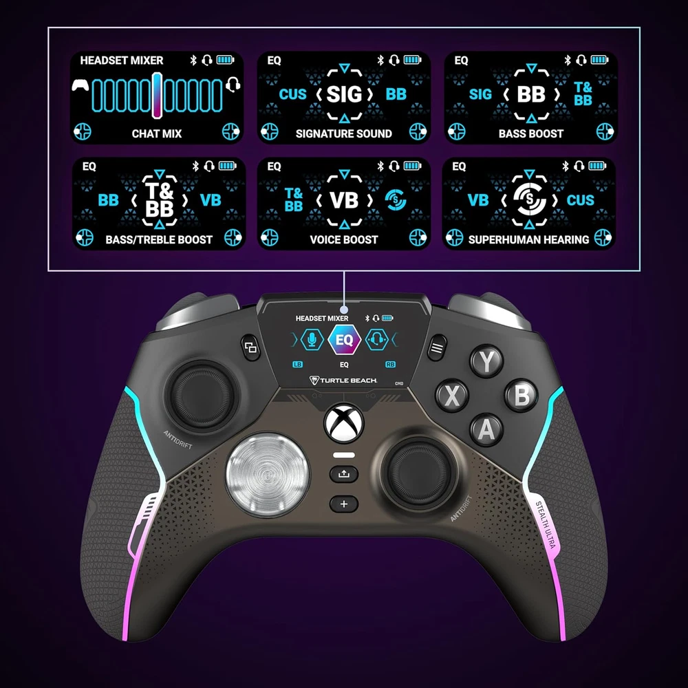 Store New Arrivals Add to Favorite View Feedback Contact Turtle Beach Stealth Ultra High-Performance Wireless Gaming Controller Licensed for Xbox Series X|S, Xbox One, Windows PC & Android – LED Dashboard, Charge Dock, RGB Lighting, 30-Hr Battery, Bluetooth Description Item model number TBS-0710-05 Language Japanese Type of item Accessory Product Dimensions 6.3 x 2.53 x 4.72 inches; 13.28 ounces Country of Origin China Item Weight 13.3 ounces Edition Stealth Ultra Wireless Batteries 1 Lithium Polymer batteries required. (included) Color Black Release date December 15, 2023 Manufacturer Turtle Beach Keep your controller and wireless transmitter updated with the latest firmware, available in the Control Center 2 app for Xbox & PC Patented, On-Board Social Media Notifications Hall-Effect Thumbsticks for Long-Lasting, Smooth Control Tactile Microswitch Buttons for Faster, More Reliable Response Adjustable Trigger Stops Four Mappable Quick-Action Buttons + Pro-Aim Focus Mode Bluetooth Connectivity with Companion App Advanced Audio Tuning with Superhuman Hearing Intelligent RGB Lighting System Durable, Hard-Shell Case with Charge-Through Capability Lag-Free Wireless & Bluetooth The Turtle Beach Stealth Ultra wireless smart game controller with charge dock delivers premium performance through the best possible components and customization options for gamers who demand the best. Lag-free wireless connection lets you reliably connect to Xbox Series X|S & Xbox One consoles, Windows 10 & 11 PCs and built-in Bluetooth connectivity gives you even more flexibility for direct connection to PC, Mobiles Devices & Smart TVs with Bluetooth. Advanced Customization The innovative full-color Connected Command Display dashboard keeps you connected while you’re gaming and offers extensive settings adjustments accessible right on the dashboard. A patented feature, only available on Stealth Ultra, you can receive social media notifications from your phone directly on the Command Display That means no more glancing away from the game to pick up your phone to check notifications, Stealth Ultra keeps them all front and center so you don’t miss a moment of action. Also available in the Command Display dashboard, you can access on-the-fly adjustment for 10 on-board profiles for different game genres or character loadouts. Additionally, you can adjust key controller performance aspects, like button mapping, thumbstick response, dead zones, and vibration intensity. Make the Stealth Ultra your own, with 16.8 million different RGB colors, so you can set your preference for aesthetics, notifications, and low battery warnings. And for added convenience, these features and more are all adjustable in the Control Center 2 companion app for Xbox, Windows PC, Android & iOS devices. Faster, More Reliable Controls Designed for longevity and reliable performance, the Stealth Ultra features premium materials throughout. Tactile microswitches rated at a 5 million click life cycle are used in the D-Pad, ABXY cluster, mappable buttons, and bumper buttons for reliable, faster response with every click. The AntiDrift thumbsticks use non-contact hall effect sensors to enhance accuracy and improve durability, and two additional sets of thumbcaps are included for added customization & tactile preference. The trigger stops are adjustable for short hair triggers in action or FPS games, to full travel distance for fine adjustment of throttle and brake in racing games. Plus, four mappable quick-action buttons let you configure your exact control preferences depending on the types of games you play. Long-Lasting Battery & Quick Recharging The low-profile charge dock gives your controller a convenient place to rest and charge when it’s not in use. Select between Full, Balanced & Eco power modes, plus a custom mode to toggle certain features or aesthetics on/off based on your preferences. To maximum battery life, select Eco mode, turn off vibration and without a connected headset you can play up to 30 hours. If you’re looking for a full-featured experience with audio features, or if you play in short sessions, switch over to full power mode for up to 7 hours of battery life. Plus, with high-speed charging over USB 3.0, you can get back to 100% charge in under 2 hours. The dock also has a built-in USB port so you can plug the wireless transmitter into the dock and only take up one USB port on your Xbox or PC. Designed for wireless use on Xbox consoles, Windows 10 & 11 PCs, and Smart TVs, the Stealth Ultra also comes with a 10ft / 3m USB cable so you have the option to play-and-charge. High-Performance, Lag-Free Wireless Technology Our proprietary, lag-free 2.4 GHz wireless connection and built-in Bluetooth technology gives you the freedom to play without a wired connection. 30-Hour Battery Life & Rapid Charge Dock Play for up to 30-hours with three adjustable power modes & settings, and recharge in just two hours using the low-profile charge dock. Connected Command Display Our full-color Connected Command Display dashboard keeps you connected while you’re gaming with social media notifications, and settings adjustments available right on the dashboard. Patented, On-Board Social Notifications Receive social notifications from your phone for all your favorite social media platforms on the Command Display dashboard to keep you in the loop while gaming. AntiDrift Thumbsticks Contactless, hall effect thumbsticks use internal magnets instead of full contact analog-style sticks to provide high-resolution, smooth control without drift. Plus, two sets of additional Thumbcaps are included for tactile preference. Precise, Microswitch Buttons Short travel tactile microswitches, rated at 5 million clicks are used for the D-Pad, ABXY cluster, mappable buttons and bumper buttons for faster, more reliable response and longer life. Adjustable Trigger Stops Modify the throw distance of the triggers on-the-fly to suit the games you play. Shorter hair trig