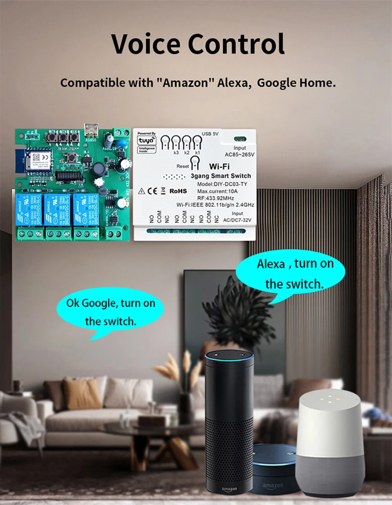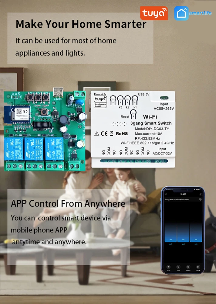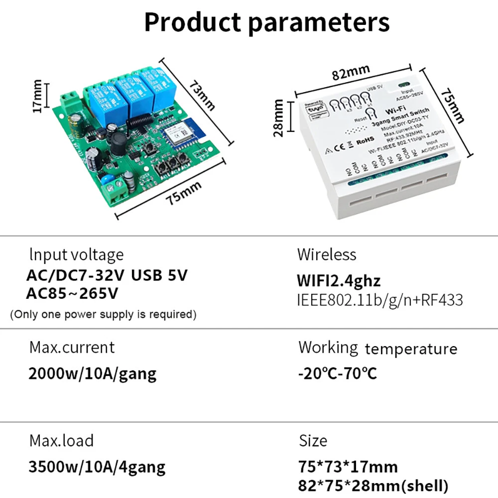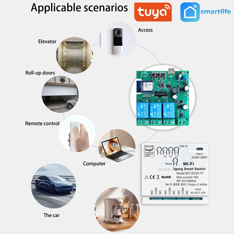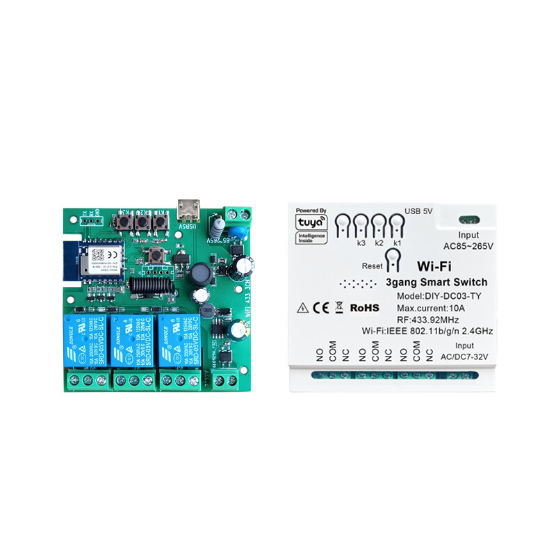 Product Description If you have any questions, please contact customer service first, do not open disputes easily, thank you! Features: This 3 gang smart switch work with tuya app and smartlife APP This relay module is also support Alexa and google home . This relay module has inching, self-locking, interlocking, timing, countdown function. This relay module still has RF 433 function,Only 433Mhz learning code remotes are supported. This relay module is available for Entrance guard,Elevator,Roll-up doors ,Computer, Car, Light ,Garage door,etc... Specifications: Input voltage :AC/DC 7-32V , AC 85-250V, Micro USB 5V input.(only one power supply is required) Max current : 2200W/10Agang. Max load:3500W/10A/3gang. WiFi standard : WiFi 2.4 ghz b/n/g. Radio frequency: 433MHz If you need voice control, you can match the voice audio, such as Alexa, etc. . Package Includes: 1pc*Switch About Us We accept all payments authorized by eBay. powered by