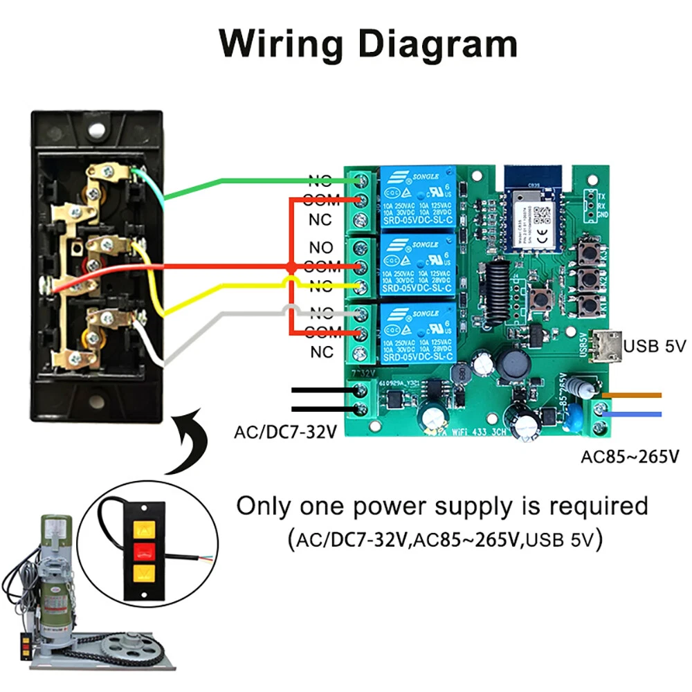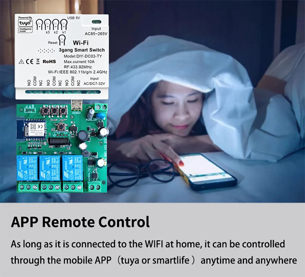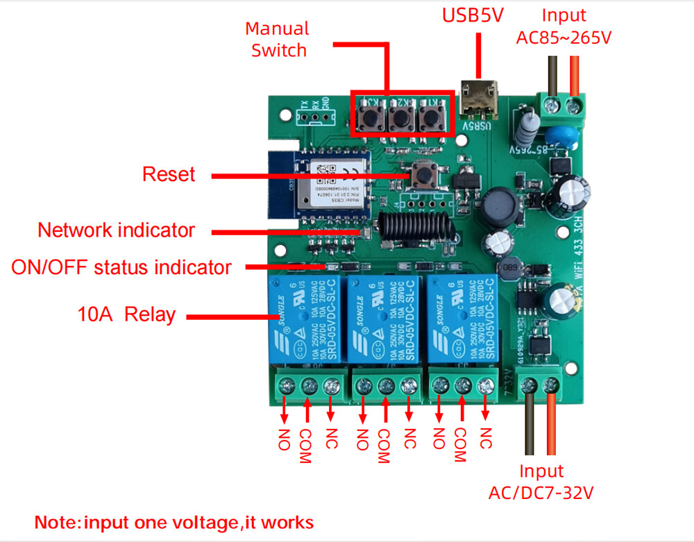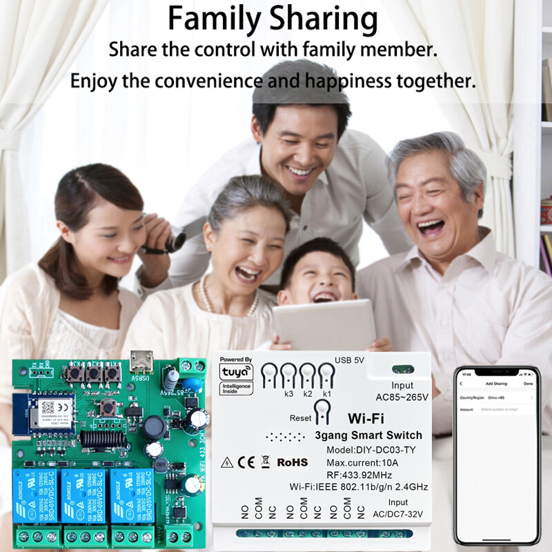 Product Description If you have any questions, please contact customer service first, do not open disputes easily, thank you! Features: This 3 gang smart switch work with tuya app and smartlife APP This relay module is also support Alexa and google home . This relay module has inching, self-locking, interlocking, timing, countdown function. This relay module still has RF 433 function,Only 433Mhz learning code remotes are supported. This relay module is available for Entrance guard,Elevator,Roll-up doors ,Computer, Car, Light ,Garage door,etc... Specifications: Input voltage :AC/DC 7-32V , AC 85-250V, Micro USB 5V input.(only one power supply is required) Max current : 2200W/10Agang. Max load:3500W/10A/3gang. WiFi standard : WiFi 2.4 ghz b/n/g. Radio frequency: 433MHz If you need voice control, you can match the voice audio, such as Alexa, etc. . Package Includes: 1pc*Switch About Us We accept all payments authorized by eBay. powered by