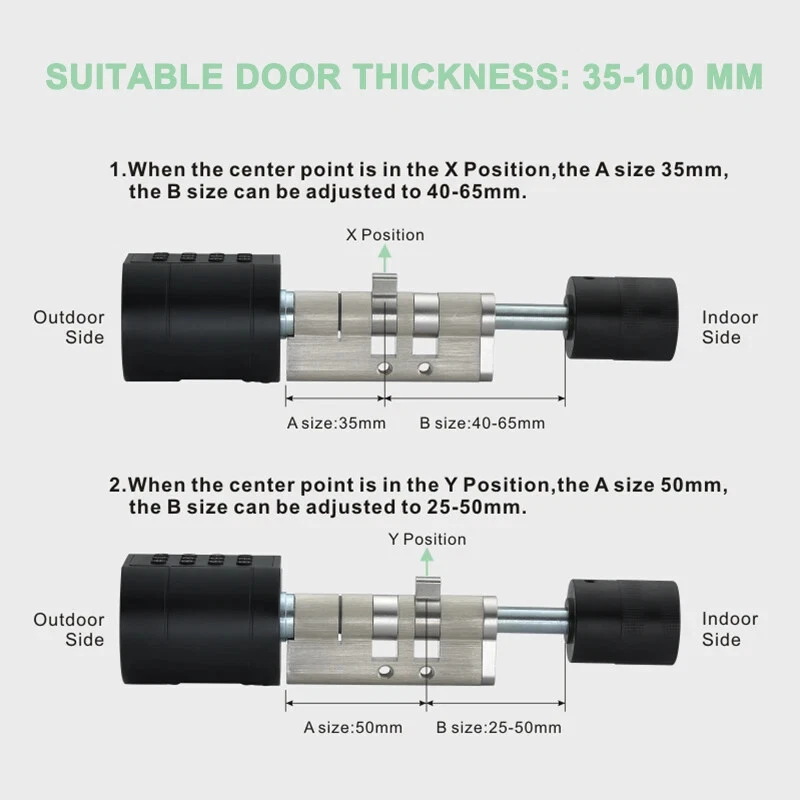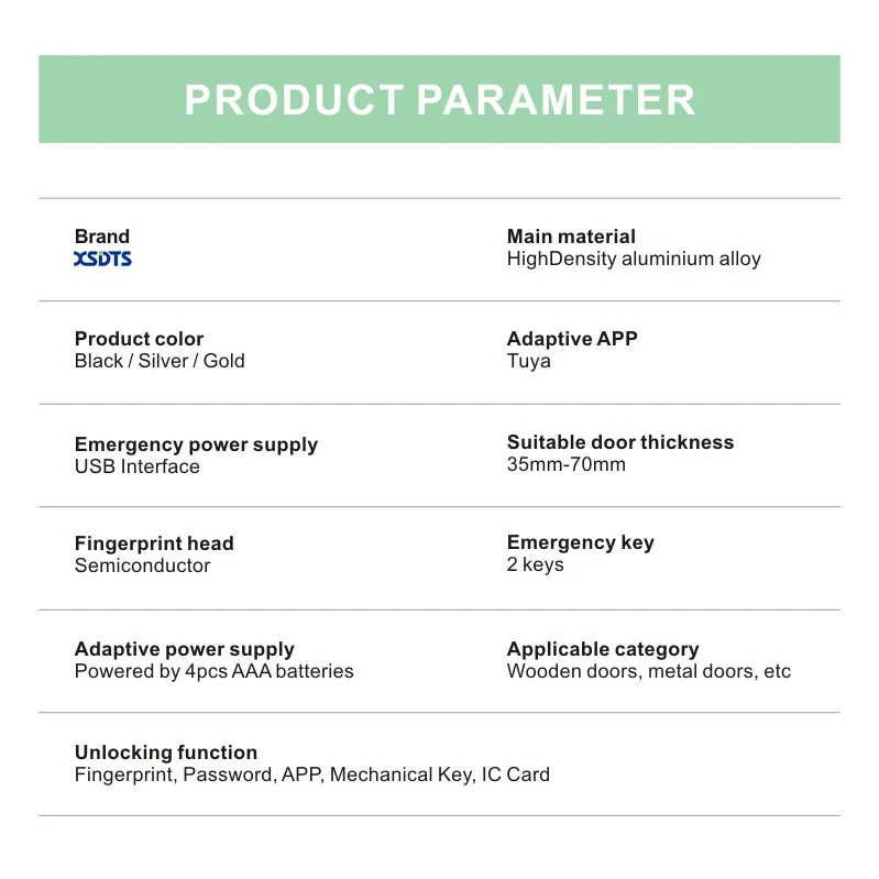 Features 1. Multiple methods of unlocking Tuya App,Bluetooth, fingerprint, card, mechanical key unlock; easy to use it whether children or older. Never worry forget to bring the key. 2.APP remote control This keyless entry door lock allows you to check the visitor records on Tuya APP Lock, see which visitor at what time unlocked the door, enhance the security level of your home. When the door lock and gateway are used together, the APP can be used to remotely control the unlocking. 3. With G2 gateway Works with Smart Alexa or Google Home, smart home combined with the Gateway provides the most convenient experience by simply asking your smart speaker Alexa to lock or unlock our lock. For iOS and Android phone, If add a gateway G2 can connect to wifi, and work with Alexa and Google Assistant (Noted: Only USA/Canada/UK/Australia/France/ltaly/Brazil/India can support the Alexa and only the English country support the Google Assistant.) 4. Mechanical keys and emergency power supply (USB) can be used when the door lock is out of power 5. Easy to install and use Only 3 minutes to diy install without breaking the door or changing the door body and no professional installer required; 6. Suitable for most doors Adjustable length cylinder lock, 99% of world doors to compliance; easy replacement of existing lock cylinder. Different door thickness of accessories are not the same,please contact our salesman when placing an order