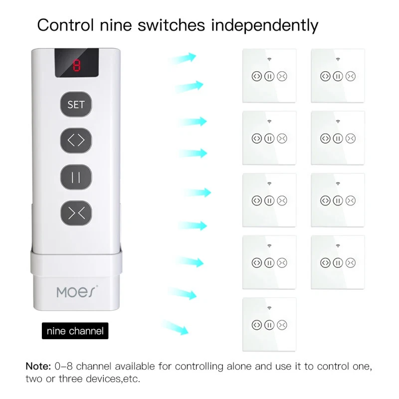 Tuya Smart Life WiFi RF433 Blind Switch with Remote Electric Roller Shutter Sunscreen Home Alexa Smart Home Description: 100% Brand New and High Quality! Yet2169-s28 is a remote transmitting RF signal with a frequency of 433.92MHz and modulation mode of OOK.This product has a display window of 8-segment digital tube, which can display a of 9 channels from 0 to 8.Different channels can be freely switched by pressing the button, and different actions can be performed when the receiver receives different code values. 1. Channel setting nbsp; a. Press 'set', digital tube flashes for setup mode. . Press '<>' in setup mode, channel increases. When the channel value increases to 8, press the key again to start increasing from 0 c.Press '><' in setup mode, channel value decreases. When the channel value decreases to , press the key again to start decreasing from 8. d. Press 'set' in setup made, the digital tube stops flashing for exiting setup mode 2. Transmit code Press any key among '<>' '=' '><' non-setup mode, then remote starts to transmit signal, the red indicator in the right corner flashes fast to indicate it is transmitting. Release the key to stop transmitting and the digital tube stops lighting. 1.9 Channel RF433 frequency remote is designed for separately controlling our switch and switch module in a much easier way with its maximum controllable quantity of nine;easily achieve another control to the whole house curtains without interference after successfully paired,especially suitable for the old. 2.Extremely simple matching way supported for simple use.You need to pair the three button(up,down,stop) by to the switch or switch module for correct control.With the new added set button for easy channel settings. 3.Encoding 1527 required for the remote.No codes available for this control system,Please confirm before buying 4.Battery powered:23A*12V battery required for this remote with long time standby.(Battery is included in the package) Specifications: Working voltage:DC12V Working temperature:-20℃ - +60℃ Encoding mode: Imitation learning code Working frequency: 433.92MHz Working current: ≤16mA Number of channel :9 Package Included: 1*remote control