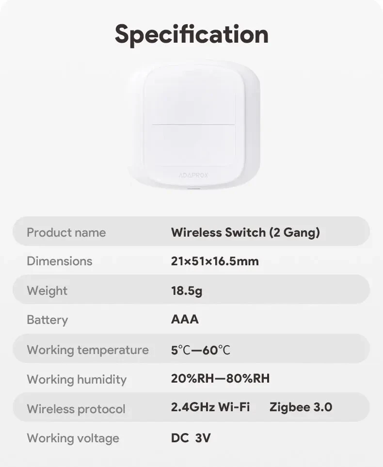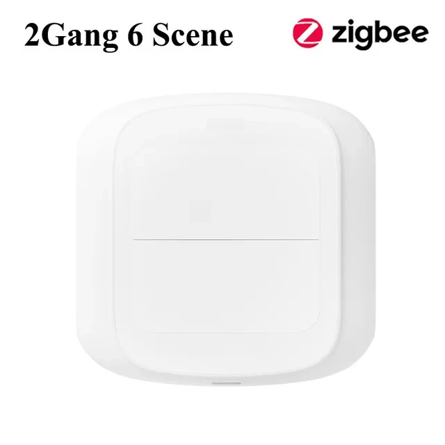 Tuya Smart WiFi/Zigbee Switch Push Button Switch 2Gang 6 Scene Wireless Smart Home Remote Controller Automation Scenario Switch NOT:Zigbee version switches support three actions:click,double click, and long click.WiFi version switches only support two actions:click and long click.WiFi version not double click . You can set your customized actions for each of them. HIGHLIGHT: 【Multiple keys】Each key supports three key events: one click, double click, and long press. Each trigger can be bound to a different set of operations. 【Intelligent linkage】The wireless double key switch can link the intelligent appliances at home to enable/disable the intelligent appliances at home with one key. 【High precision connection】Wireless double key connection has high precision and wide range. 【Ultra-low power】Wireless dual-key switch has low power consumption and long battery life. 【Easy installation】Wireless double key switch can be attached to the wall or can be directly held for use. Specifications Product Name: Wireless Switch(2 Gang) Dismensions: 21*51*16.5mm Weight: 18.5g Battery: AAA Working Temperature: 5℃-60℃ Wireless Protocol: 2.4Ghz WiFi Zigbee 3.0 Working Humidity: 20%RH-80%RH Working Voltage:DC 3V Package Included: 1*switch ,1*manual