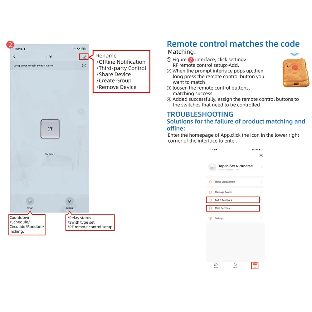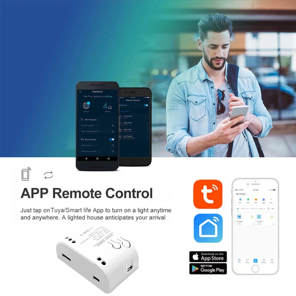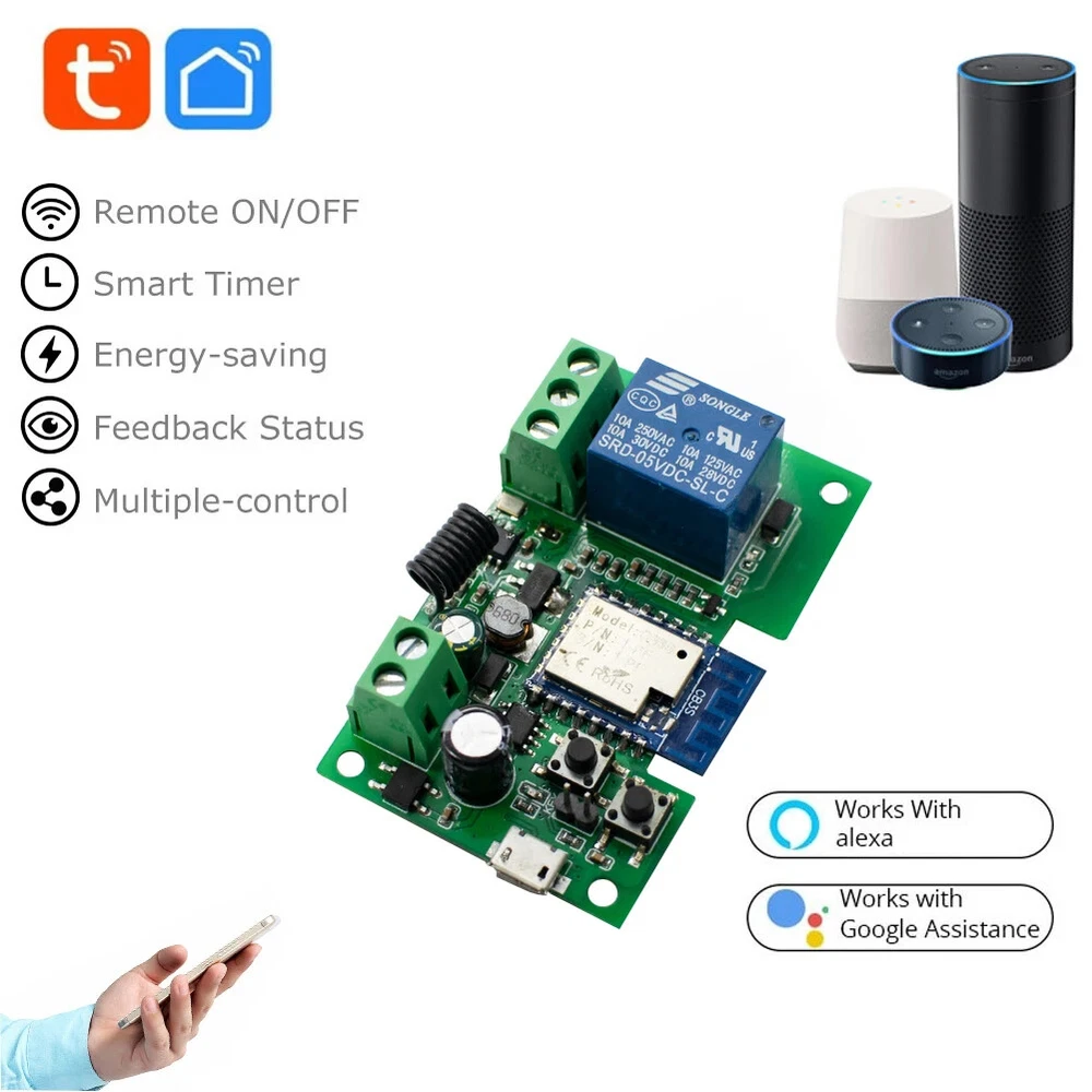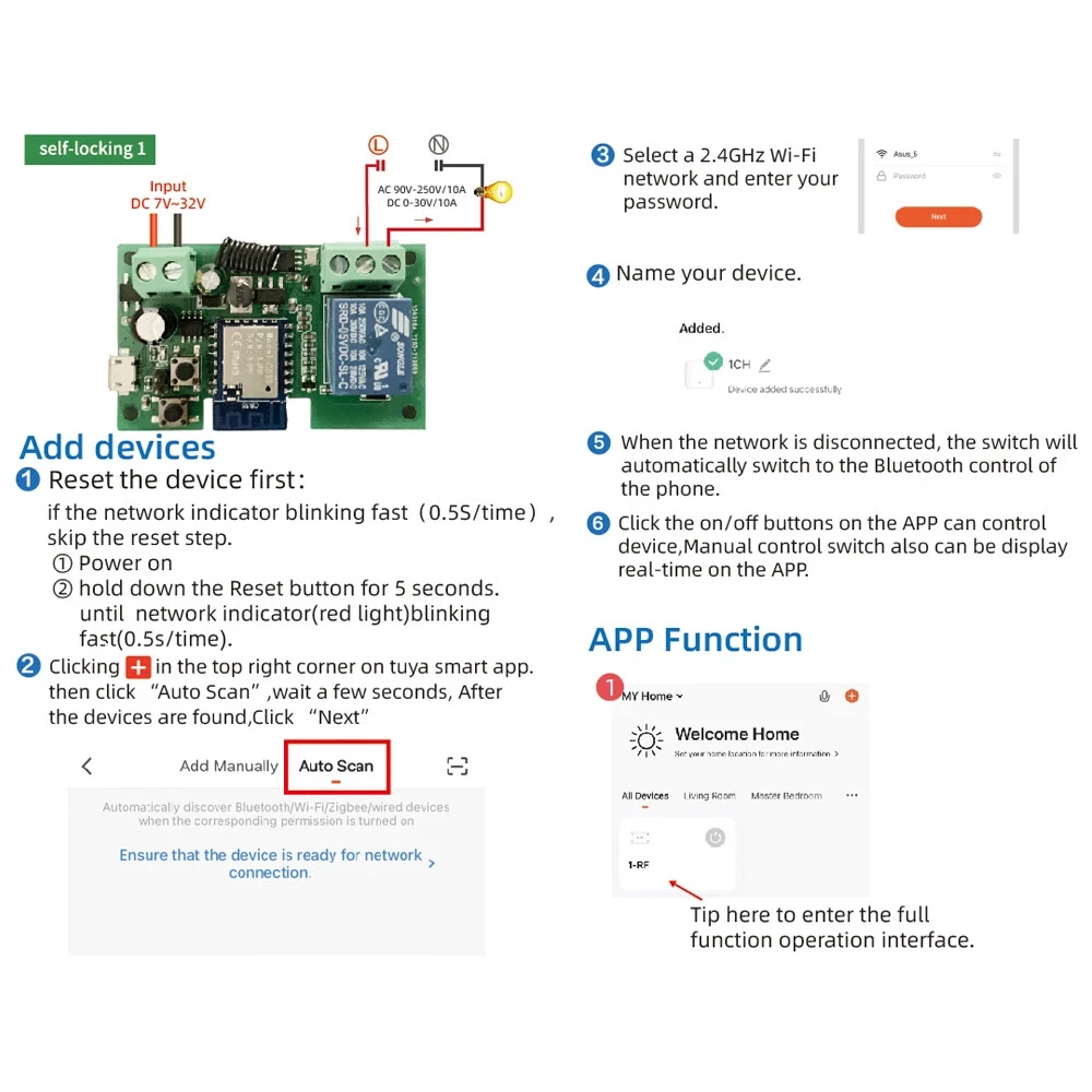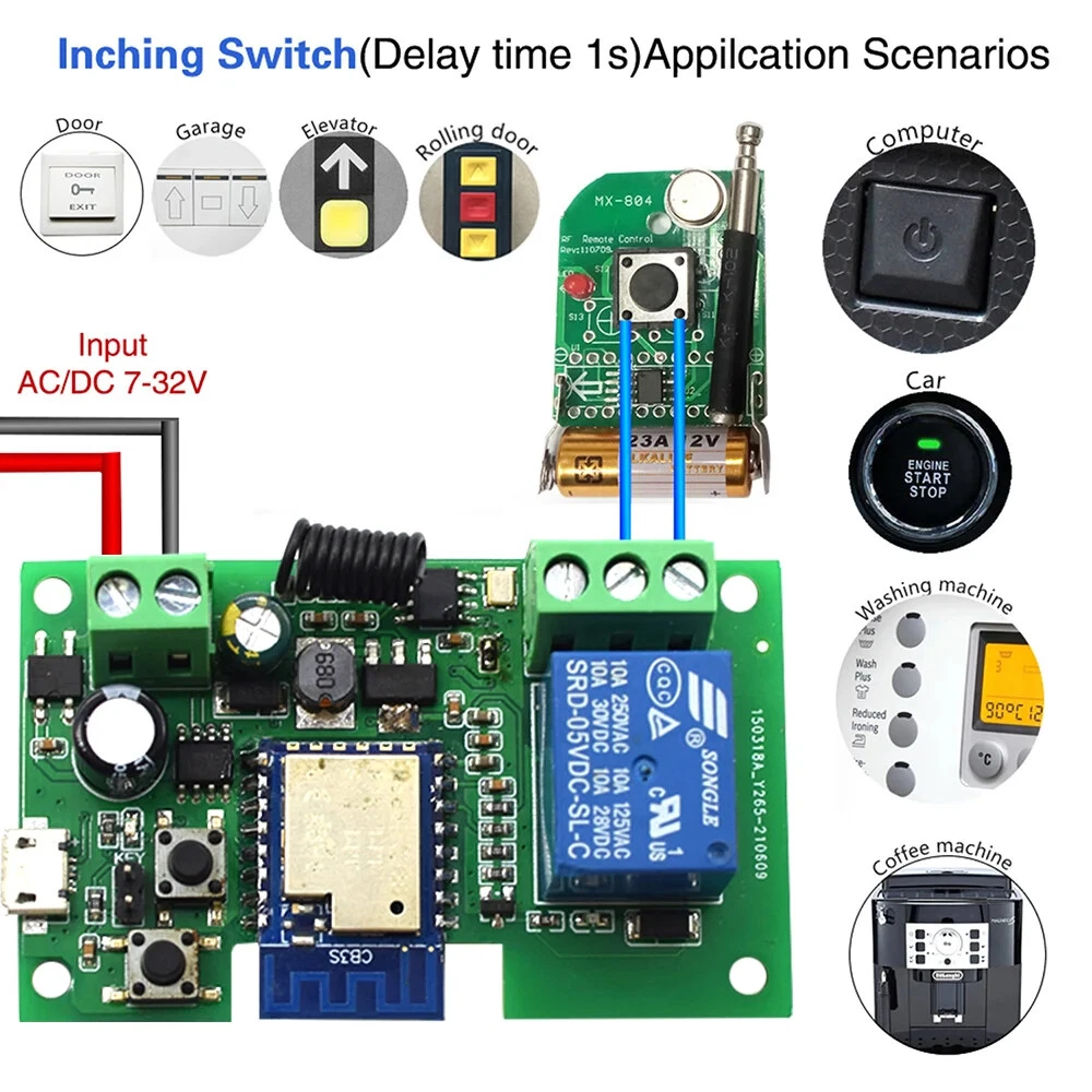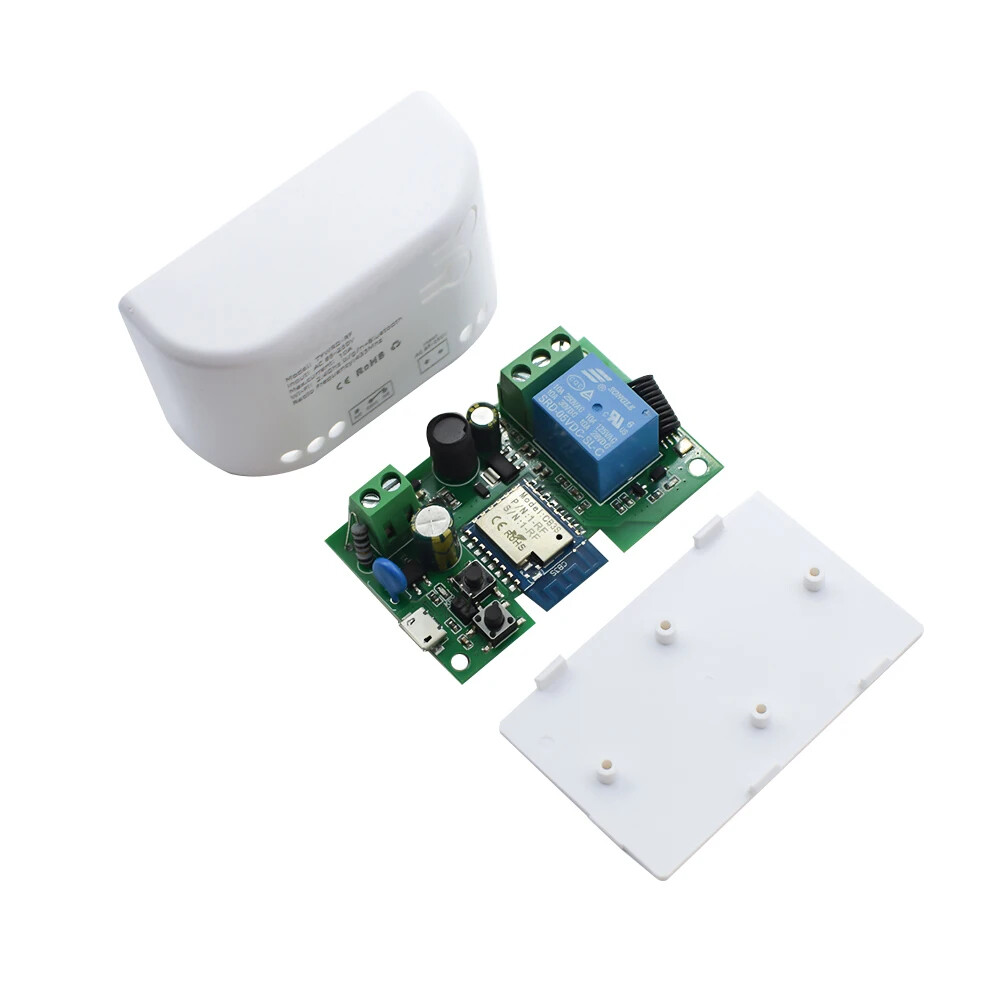 Product Application Area Factory \ Farm\ Office\ Instrument\ Ventilation \ Pump \ Motor \ Remote control garage door \ Remote control house door \ Remote control Lamp \ Remote control curtains \ Remote control Gate and other remote control device Tuya smart Jog Inching/ Self-locking WIFI Wireless Smart Home Switch Remote Control with Amazon Alexa This product is a wireless switch supports inching /self-locking mode. Users can add the device to the APP Smart life in order to remotely control connected home appliances or devices. In self-locking mode, customers can remotely turn on/off connected devices immediately. When in inching mode, customers can have two wiring ways to select, and you can set the inching time in APP . WIFi control model, no need to program. No matter where you are, you only need to download a APP to connect the wifi and control the cloud. RF mode , you can control the board with RF 433 remote controller. Only supports 433mhz learning code remotes. Features: *Supports WiFi network. Supports numerous WiFi smart switches on one smart phone. *Supports status tracking: device status timely provided to the Tuya / Smart life. *Supports remotely turn on or off connected appliances, for example light, electric kettle, electric rice cooker, electric curtain, etc. *Supports max 8 enabled scheduled/countdown/loop timers for each device. *Voice Control: Compatible with "Amazon" Alexa, for Google Home/Nest. Supported Functions Include: *Remote turn on/off. *Timing schedules. *Device sharing. *Group management. *Works with Amazon Echo, Echo Dot, Amazon Tap. *Works with Google Home. *Compatible with Amazon Alexa. Specifications: Supports to control different voltage ranges USB port power supply more convenient Relay lifespan: ≥one million times Working mode: inching / self-locking Wireless Standard: 2.4GHz, 802.11 b/g/n Mobile App: Tuya / Smart life on Android/IOS Application: access control, turn on PC, garage door, etc. Computer application: Remote control computer boot. Operating temperature: -40 degrees to +70 degrees. Operating Humidity 40%-80% RH. Default inching Function: Press the open relay by mobile phone, then cut off the pull-on imediately, you can set the inching time in APP , it has the timing-share function at the same time. Self-locking when press the inching and locking button with the light on. Press open relay to pull-on, press close relay to cut off. lnching Switch(Delay time 1s)Appilcation Scenarios Work For Door,Garage,Elevator,Rolling door,Computer,Car,Washing machine,Coffee machine etc. Self-locking Switch Application Scenarios Work For Light,Fan,Refrigerator,AC contactor,Water pump,Humidifier,Security sensor etc. Multiple control methods to enjoy smart life. APP Remote control, Voice control, 433 RF Remote Control. 1 Channel Channels: 1. Input voltage : DC/AC 7-32V , Micro USB 5V input. Output: Signal output only, no voltage output. Max current : 2200W/10A. WiFi standard : WiFi 2.4 ghz b/n/g. Size : 72*45*30. The life of Relay Model is more than 1,000,00. 1 Channel Channels: 1. Input voltage : AC 85V-250V . Output: Signal output only, no voltage output. Max current : 2200W/10A. WiFi standard : WiFi 2.4 ghz b/n/g. Size : 72*45*30. The life of Relay Model is more than 1,000,00. 2 Channel Channels: 2. Input voltage : DC/AC 7-32V ,AC 85-250V,Micro USB 5V input. Output: Signal output only, no voltage output. Max current : 2200W/10A. WiFi standard : WiFi 2.4 ghz b/n/g. Size : 100*35*20mm The life of Relay Model is more than 1,000,00. Default inching Function: Press the open relay by mobile phone, then cut off the pull-on imediately, you can set the inching time in APP , it has the timing-share function at the same time. Self-locking when press the inching and locking button with the light on. Press open relay to pull-on, press close relay to cut off. 433MHz Remote Control: Operating voltage: (Without battery), Transmitting frequency: 433MHz Encoding Type: Learning code Transmission distance : 10-100M (Open field) Size: approx 101*40*15mm NOTE: The system can store for 20 pcs of remotes , if the remote get more than 20 pcs , the initial remote control will be lost .