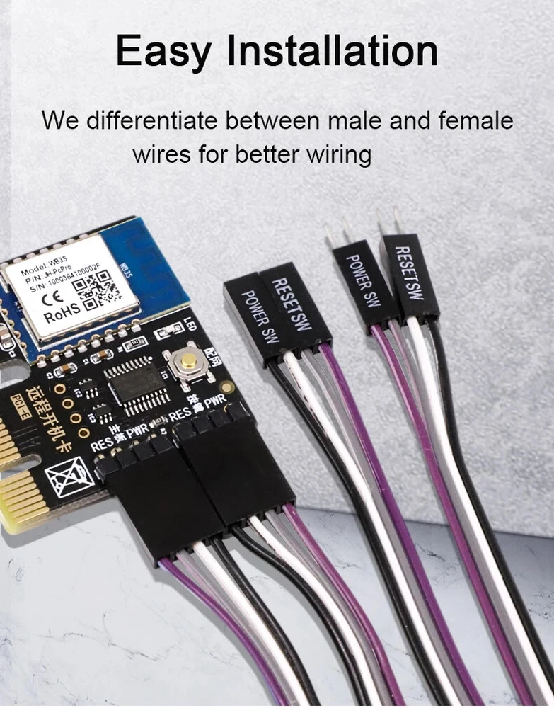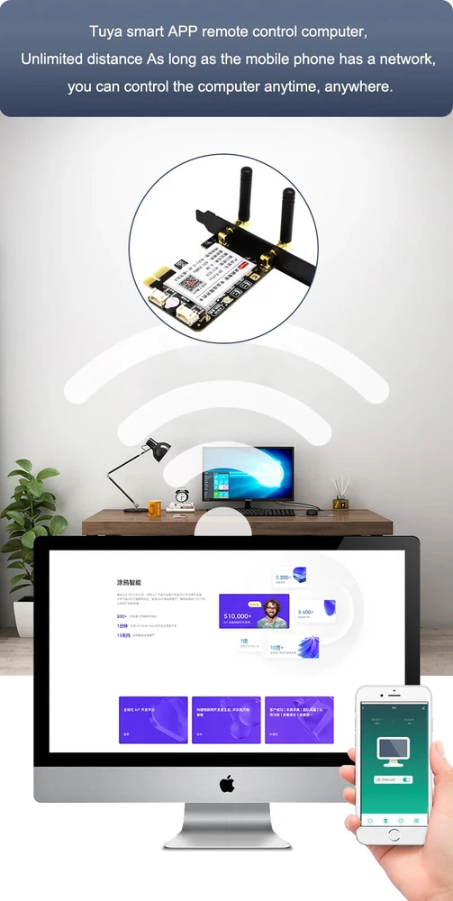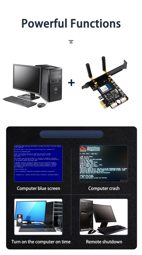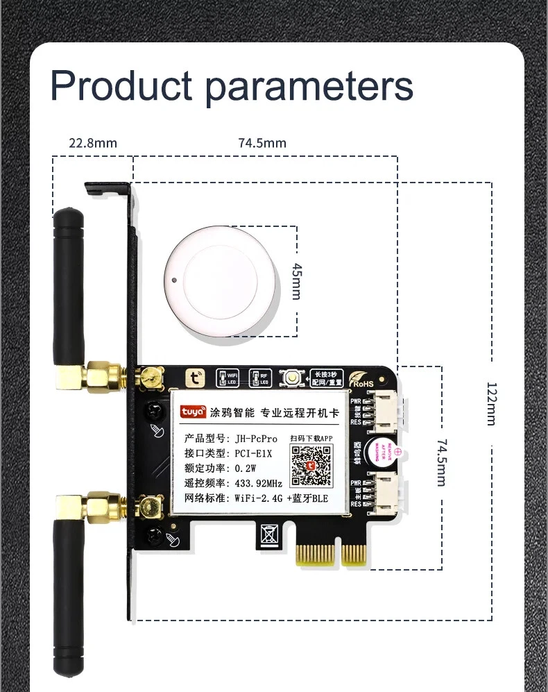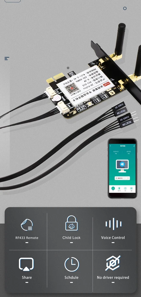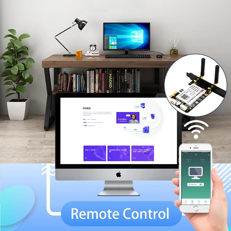 Note: it doesn't work with branded desktop computer,Like Apple,DELL and HP et. Wifi Switch for Desktop Computer 1. Easy Installation Standard PCIe port, work with most destop computer. Install to use, don't need any driver software. 2. App Remote Control Control your computer on Tuya App anytime any where. Always know the computer status on App. 3. Wifi+Bluetooth "Tuya MINI" and "Tuya PRO" Card support wifi and bluetooth connection. When wifi is disconnected, you can still control your PC on Tuya App through bluetooth connection, don't need any setup. 4. Voice Control Work with Alexa Echo, Google Home Assistant, Yandex Alice, easy to control your PC with simple voice command. 5. Timer and Schedule Set a timer to power on/off, or make a weekly schedule to power on/off the computer, automate your PC. 6. Reset And Force Reset Not only "Power on/off" function, it also support "Reset and Force Rest" function, avoid harm to your computer system. 7. Child Lock (only "Tuya PRO" support) Make the PC Button out of function, never worry about sudden shutdown caused by kids or mistaken touch, avoide important date loss. 8. 433RF Remote Control (only "Tuya PRO" support) Hard to reach the computer power button? The "Tuya PRO" card come with a 433 Remote Control, just put it on the table or anywhere you want. 9. Relay Status (only "Tuya PRO" support) You can set the computer to power on or keep power off status, when power up again after power failure. How to install? Step 1,find Power SW cable and Reset SW cable on mainboard,then pull out them. Step 2,fix APP remote computer module in free PCIE. Step 3,Insert the previously pulled out Power Sw and Reset Sw wires into the corresponding positions of the boot card, and insert the Power Sw and Reset Sw wires of the boot card into the corresponding positions of the motherboard. Remote Control You can download the"TeamViewer" software to transfer data at anytime and anywhere. ATTENTION: If the computer turn on automatically after it's turned off. Here are the solutions: 1. On computer, go to WINDOWS settings and "Power Options", change the option "When Press on Power button“ to "Shut Down". 2. On computer, go to WINDOWS settings and "Power Options", enable the option "turn on fast startup". 3. On computer, go to BIOS settings / Anvanced / APM Configuration, change the option "ErP Ready" to "Disabled" status. 4. If your computer use "Wake on Lan", please close it. If the computer turn on automatically after it's turned off It is because the PCIE card slot has no power and cannot supply power to our equipment. You only need to enter your computer’s “BIOS” setting and set the computer motherboard to remain powered when the computer is shut down to solve the problem. For example: (1). On computer, go to BIOS settings/Anvanced/APM Configuration, change the option "ErP Ready" to "Disabled" status and change the option “Power on by PCI-E” to “enabled”. Note: This is only the setting method for one of the mainboards. Due to too many types of computer mainboards, it is impossible to list them all. Regardless of the type of motherboard, the solution is to keep the motherboard powered after the computer is turned off. How to connect the 433 Remote Control with "Tuya PRO Card"? 1. In Tuya App, open the "RF study" function in device setting of the card. 2. Short Press on the Remote Control, connection succeeded. How to disconnect the 433 Remote Control with "Tuya PRO Card"? Long press the "Reset Button" on computer case, you will hear "di", "di", "di-di", "di-di-di", "di-di-di-di", release the button When hear "di-di-di-di", then all 433 Remote Control connection is deleted. Q&A 1. The manual power button on PC case can work or not after installing this card? Yes, the power button on PC case and App can be used at the same time. 2. Can I use the App to control PC when I'm out for vacation or bussiness? Yes, the app will work on 2/3/4G mobile network. You can control PC by app anywhere. 3. Can I control PC on App through bluetooth connection when wifi router is offline? Yes, when wifi is offline, just need to open the phone bluetooth, then you will be able to control the PC on App. 4. Can it support "Voice Control"? Yes, it support voice control through Alexa, Google Home and Alice. 5. Does it need a gateway or hub? No, it can be connected with wifi router directly. Don't need any gateway or hub. 6. Can it work with laptop? Do you have similar product for laptop? No, only for desktop computer. We don't have similar product for laptop for the moment. 7. What's the battery type of 433 Remote Control? Does battery include in package? Battery type: CR2032, 1pcs. the batteries are not included in the package due to shipping limits.