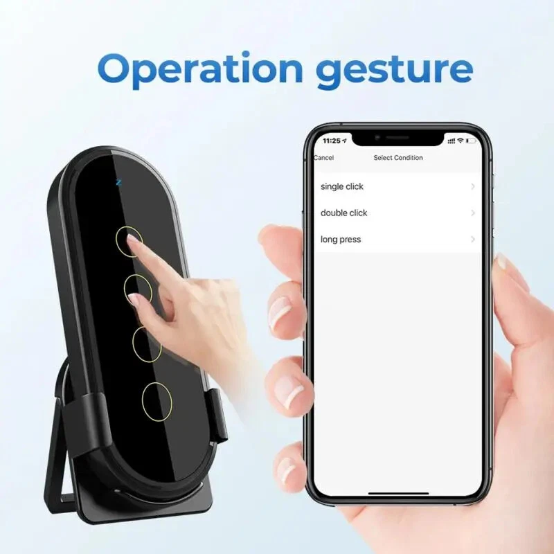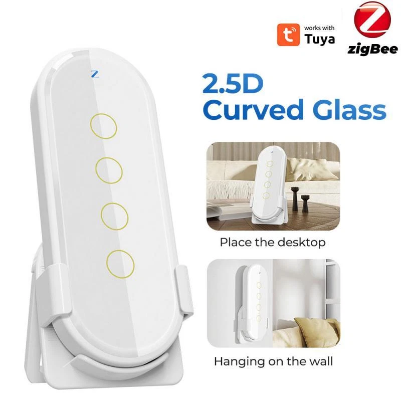 Tuya ZigBee Wireless Smart Switch 4 Gang Wireless Remote Control Touch Glass Panel Smart Home Suitable For Mulity RF433 Deveics Description: RF433 Switch: Modulation method: ASK Transmission frequency: 433,92 MHz Encoding method: Learning code EV 1527 Product size (per piece): 11.8 * 4.5cm Remote control battery: Cr2032 battery (including battery) Transmission distance: 30-50m (in open areas) Working voltage: DC 12V/27 ZigBee Switch: Battery: CR2032 battery (battery not included) Fluorescent: support Type: tuya zigbee Panel material: 2.5D tempered glass Remote control size:118*45*13.5mm Stand size: 62.5 * 50 * 23.2mm Specification: Features: RF433 Switch: DIY: The combination of remote control and wireless switch makes it more convenient and reasonable, with simple pairing and easy operation. It can turn various devices in the home into wireless remote control devices 2.5D high-definition tempered glass: In order to have a better feel, we have adopted higher cost curved tempered glass, which is more high-end. Fluorescent Function: The button will emit a faint light at night, indicating the position of each button. The faint light will not disturb the rest of family members Two fixation methods: It can be placed on the desktop freely or fixed to the wall with the built-in screws. Suitable for various application scenarios Long battery life: According to theoretical calculations, the CR2032 battery can be used for about 3 months (depending on the frequency of use) Control distance: 30~100M long distance (in open areas) Angle Adjustment: The bracket can be adjusted from 0 to 100 °, suitable for your optimal forehead angle 433MHz: Learning code (1527), with a transmission distance of 30-50m (in open spaces), brings you a new remote control experience and more convenience to your daily life. RF Pairing: Supports remote wireless control of your garage doors, electronic doors, appliances, and other remote control devices. (Only products with the same RF frequency are supported) Compact and Convenient: With a lightweight and compact design, the password key is very convenient for you to carry when going out. ZigBee Switch: 【Support zigbee wifi products】By APP setting, you can control zigbee or wifi products, including smart sockets, smart switches, smart bulbs, door magnets, temperature and humidity, etc. 【Three types of operation】Each button can be set to click, double click, long press function. 【Support a variety of function settings】Take the light bulb for example: you can set on or off, you can also set to adjust the brightness, you can also set to adjust the color. More functional operation, you can go to the APP settings 【2.5D HD Tempered Glass】 For better feel, we use the more expensive curved tempered glass, more high-end. 【Fluorescent function】The button will emit a faint bright light at night to indicate the location of each button, while the faint bright light will not disturb the rest of the family 【 Two fixing methods】Can be placed on the desktop at will or fixed on the wall using the screws that come with it. Suitable for various application scenarios 【Long battery life] using CR2032 batteries, after theoretical calculations can be used for about 3 months (specific and frequency of use has a relationship) 【Lanyard hole design】In order to prevent the remote control from being lost, it can be used with our Bluetooth anti-loss device to find the remote control more quickly (note that the anti-loss device needs to be purchased separately) 【Angle adjustment】The bracket can be adjusted from 0-100° to suit your best angle 【Share function】 share with family to control together 【Group function】 can close or open the group of devices together, more convenient Package Included: 1 set * (1 switch, 1 stand, 2 screws, 2 spiral tubes)
