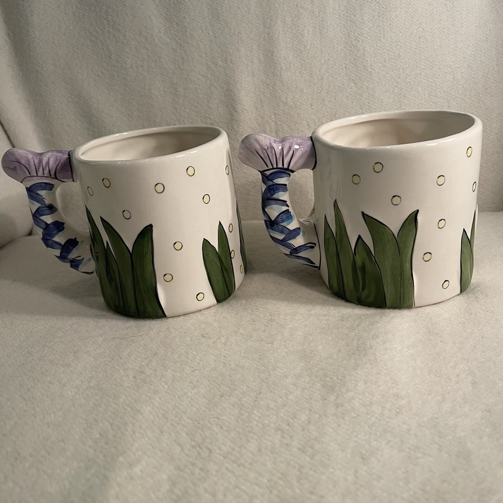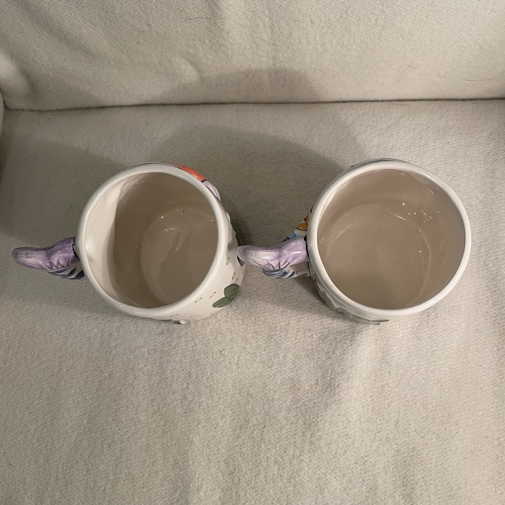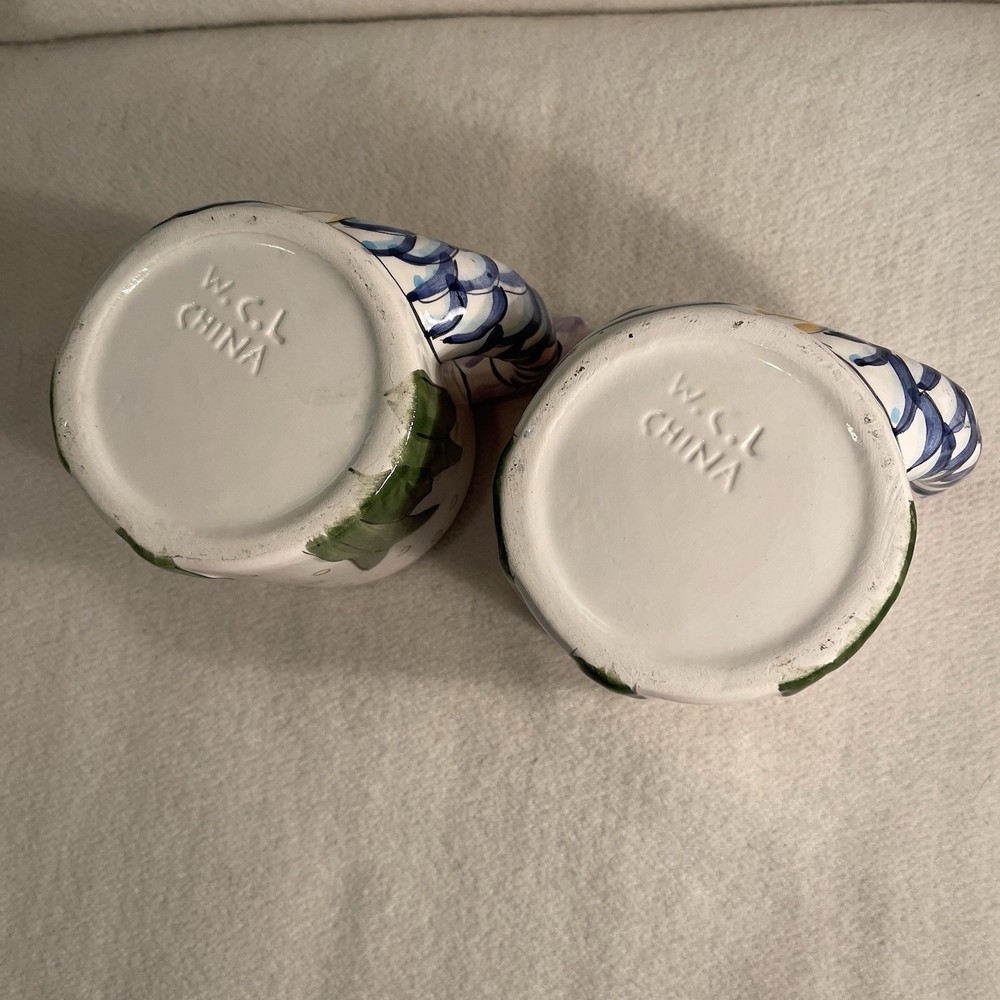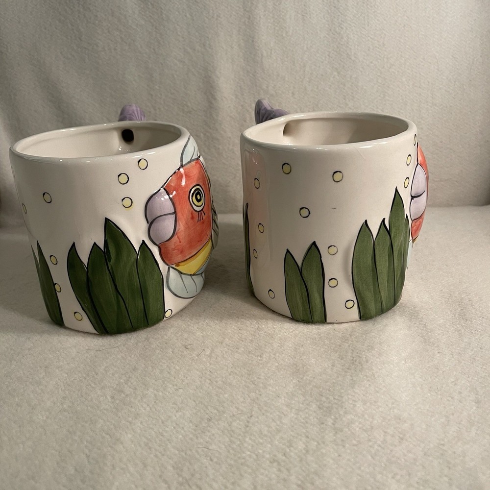 The product is a two-piece set of ceramic and porcelain mugs made by Pescada. The mugs were manufactured in 1995 and have a vintage style. They feature a contemporary design with an all-over pattern of fish and blue trim. The mugs are round and have a height and width of 3.75 inches each. They weigh a total of 1.4 lbs. The set is original and hand-painted, with an embossed design. The mugs are suitable for use on all occasions and are perfect for serving coffee or other beverages. Excellent condition. No chips or cracks.