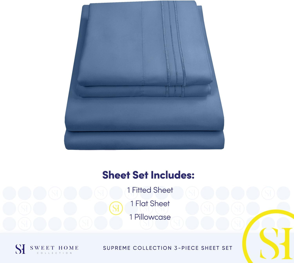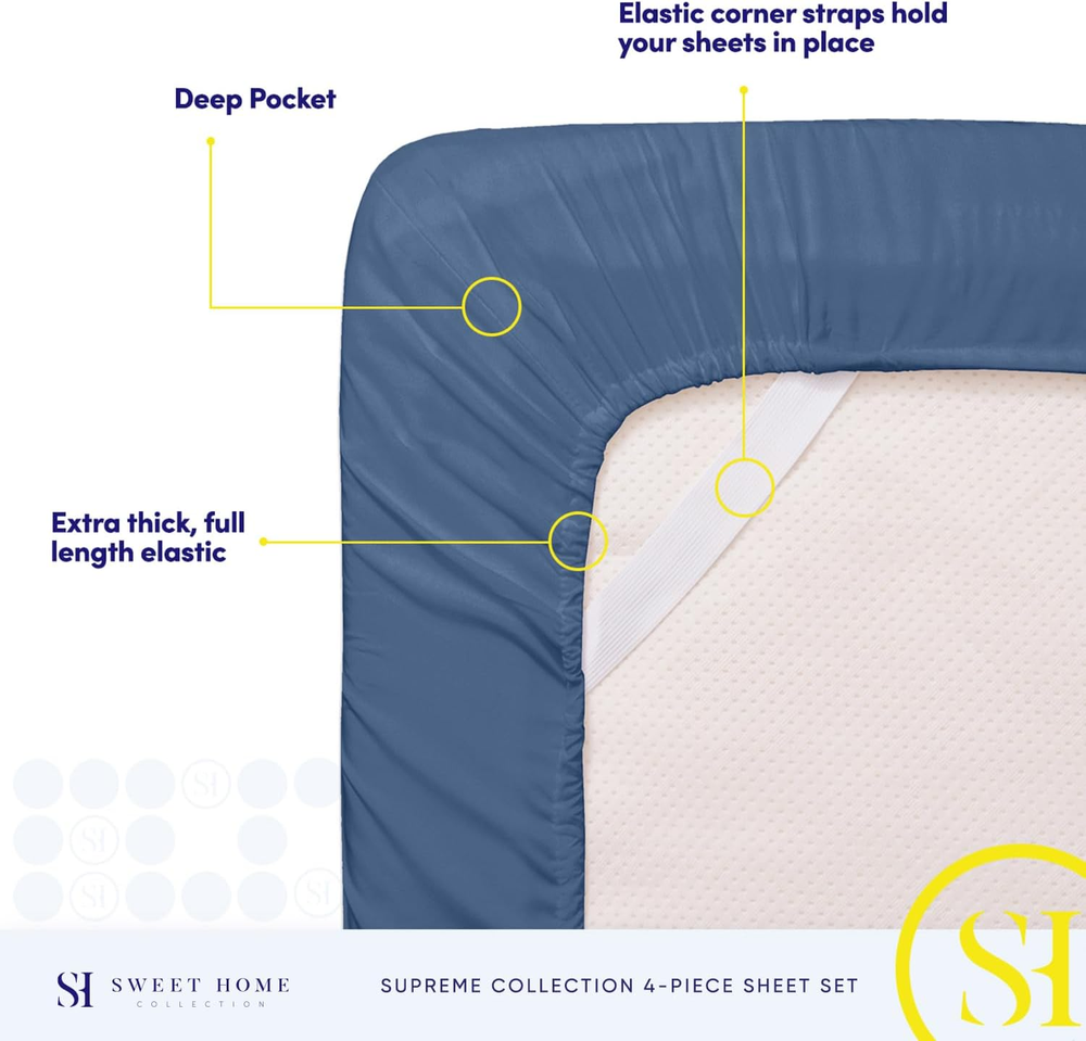 Microfiber ELASTIC CORNERS BUILT IN - What separates our bed sheets from the rest are the special elastic sheet straps built in. These elastic corners keep your fitted sheet secure to the bed and come on all of our sheets. LAY IN LUXURY – No more sleepless nights on uncomfortably itchy sheets! Sleep soundly on the softest 1800 Supreme Collection sheets. Be warned, though: You may never be an early bird again! SUPERB SHEET SET – Each luxurious set has 1 fitted, 1 flat sheet, and 1 pillowcase (NOTE: All other sizes include 2 pillowcases). Deep pockets, thick elastic, and BUILT IN SHEET STRAPS make your new soft sheets stay in place! STAY CLEANER, LONGER – Who has time to wash their sheets every few nights? When it’s time for a wash, machine wash cold, and tumble dry low. PERFECT FIT FOR ANY BED – Sleep soundly for years to come! Your deep pocket sheets are fade, shrink, and wrinkle resistant. We’ve got you (and your bed) covered. Good rest comes cheap! Cheap sheets are usually itchy, uncomfortable, and the enemy of good sleep. Not Sweet Home Collection’s luxury sheet set, though! Our brushed microfiber 1800 thread count sheets are cooling, comfortable, and luxurious at an affordable price! No more dreading lying down on scratchy sheets. These soft luxury bed sheets promise rest and relaxation so you get the shuteye you need to start every day fully charged. No matter what you sleep on, we have the sheets for you! Ill-fitting sheets make for an unsatisfying night’s sleep. Whatever size your mattress is, Sweet Home Collection has the perfectly fitted sheet set for you! Our sheet sets come in twin, twin XL, full, queen, king, and California king sizes to give everyone in the family a good night’s rest. Here are the measurements for the different bed sizes: Twin Sheets Flat: 66”x96” Fitted: 39”x75” Twin Bedding XL Flat: 102”x66” Fitted: 80”x39” Bedding Sets Full Flat: 81”x96” Fitted: 54”x75” Queen Sheets Flat: 92”x102” Fitted: 60”x80” RV Short Queen Bedding Flat: 90”x99” Fitted: 60”x75” King Bedding Flat: 102”x105” Fitted: 78”x80” Split King Size Bedding Flat: 108”x102” Fitted: 80”x39” each California King Sheets Flat: 102”x108” Fitted: 72”x84” *All of our sets come with 2 pillow cases, except the bed linens twin size, which comes with one. The king linens come with 20”x40” king sized pillow cases, while the rest comes with standard size 20”x30”. Fitted sheets that fit your needs! Don’t buy sheets in colors that put you to sleep! Choose from 40 color choices with Sweet Home Collection’s sheet sets. Whether you need deep pocket queen sheets to go along with your white bedding for your clean and crisp bedroom, or you need pink girls bedding, find it all with Sweet Home Collection! Our colors include: beige, black, brown, burgundy, camel, gray, lavender, light blue, mint, mocha, navy, olive, pink, purple, red, royal blue, rust, sage, silver, strawberry pink, taupe, white, and yellow. Sleep satisfied! We want you to get the best night’s sleep and the best customer service. If you don’t love your sheets on the first night you sleep on them, let us know, and we’ll help to make things right. There’s no need to sleep on it! Add Sweet Home Collection’s 1800 Thread Count Collection bed sheets to your cart today! Sweet dreams!