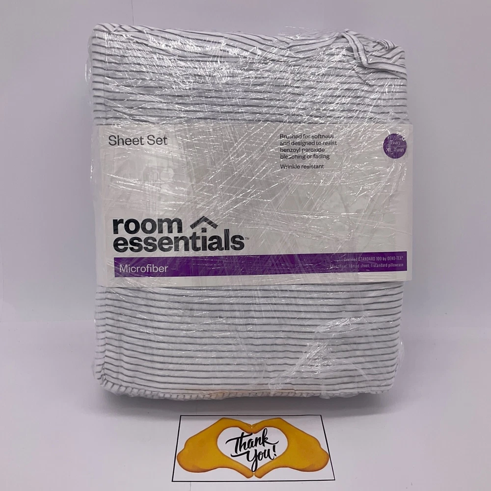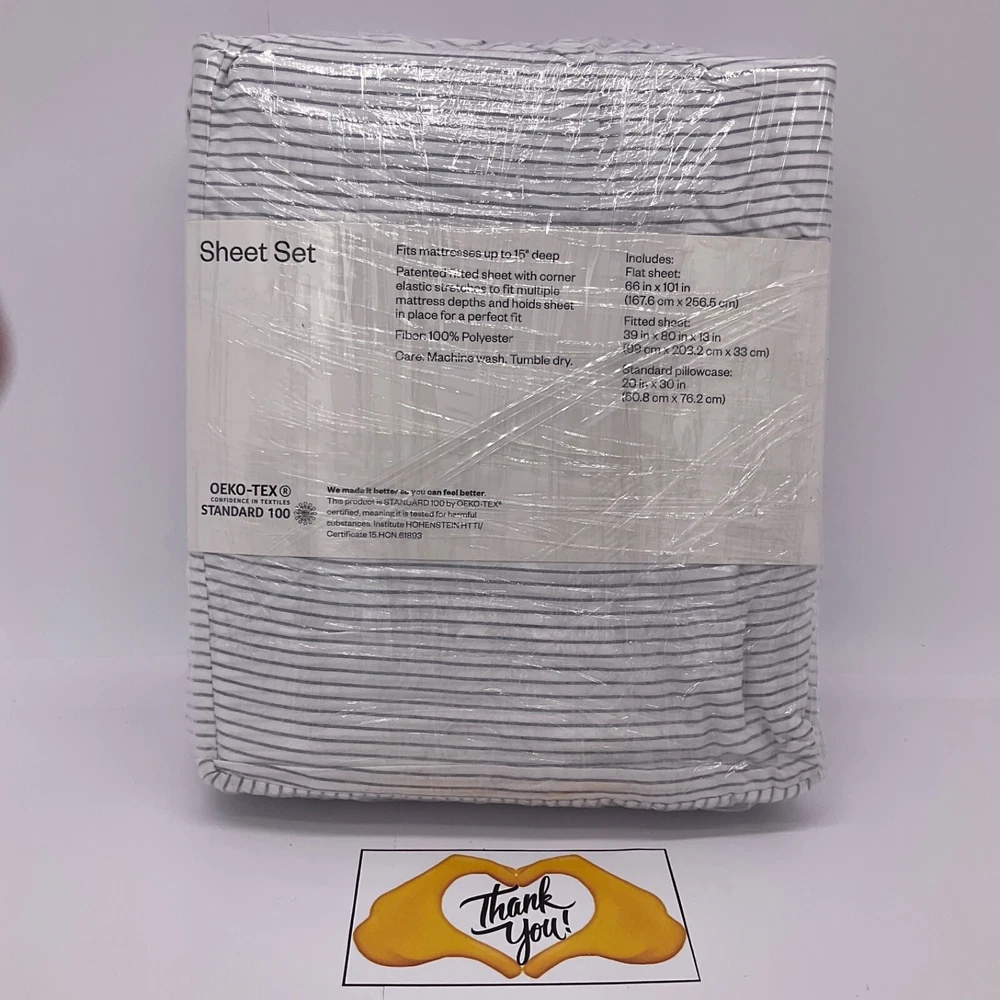 Twin / XL Microfiber Striped Sheet Set 3 Piece Bedding NEW Unopened White with Stripes Please see pictures and item specifics before purchasing. Fits Mattresses up to 15 inches deep. Fitted sheet has corner elastic that stretches to fit multiple mattress depths. 100% polyester microfiber. Machine wash. Tumble dry. Three-piece set includes flat sheet, fitted sheet, and a standard pillowcase. Smoke, free, Dog and parrot friendly home. I send offers to my listings watchers and I add items regularly, so be sure to check back often! Many Thanks_2_You for your interest!