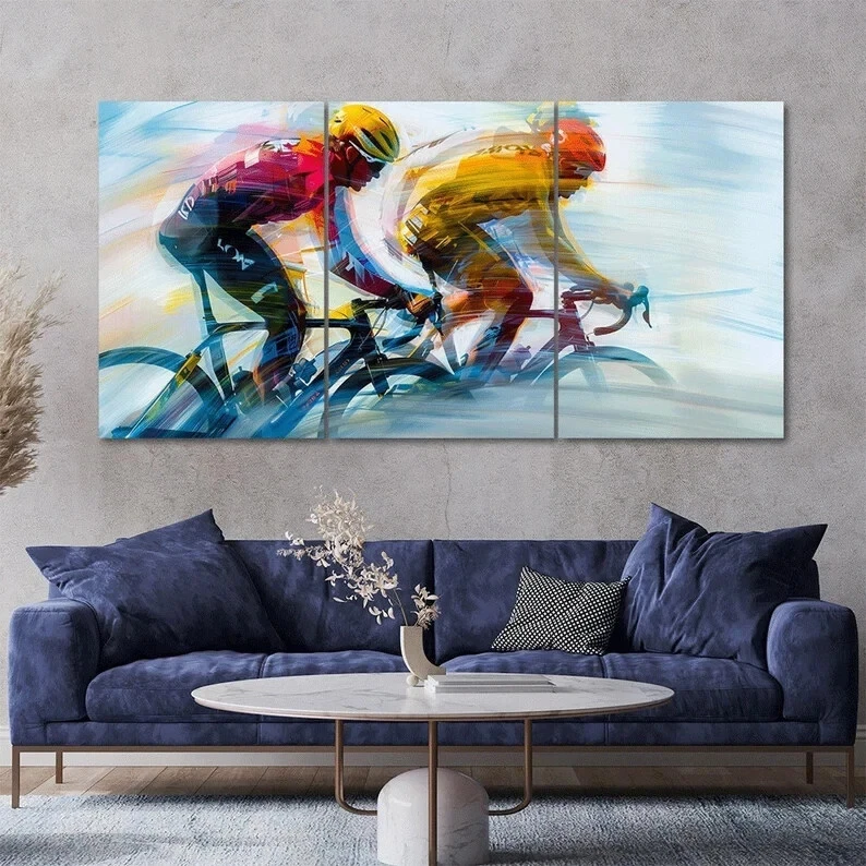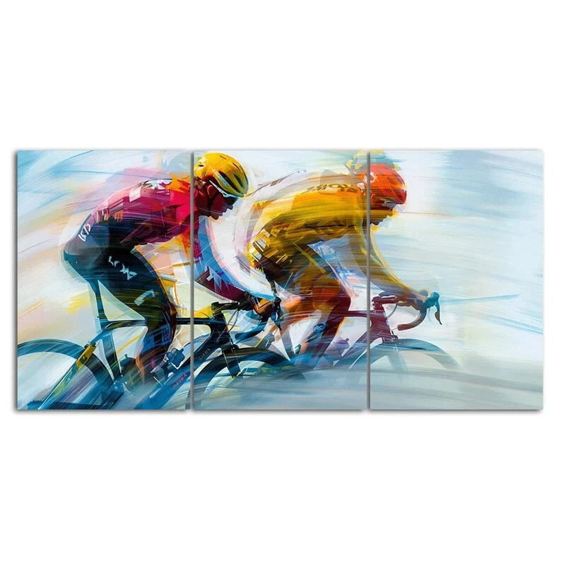 Two Cyclists Racing Sports Scene 3 Pcs Abstract Wall Art Unframed Modern Home