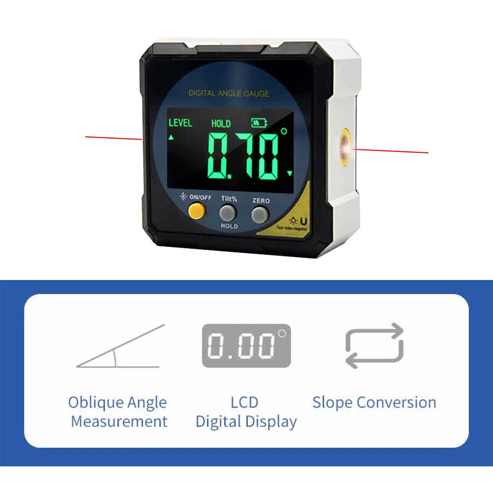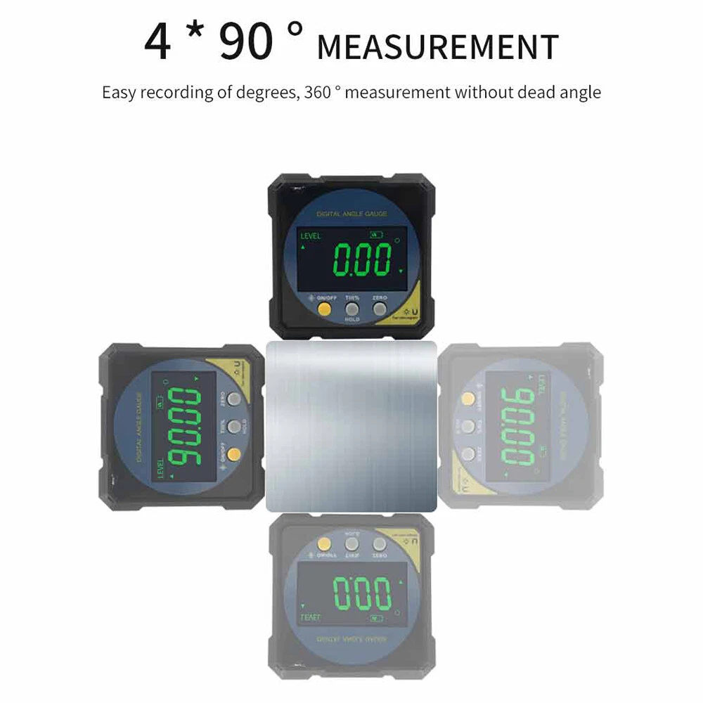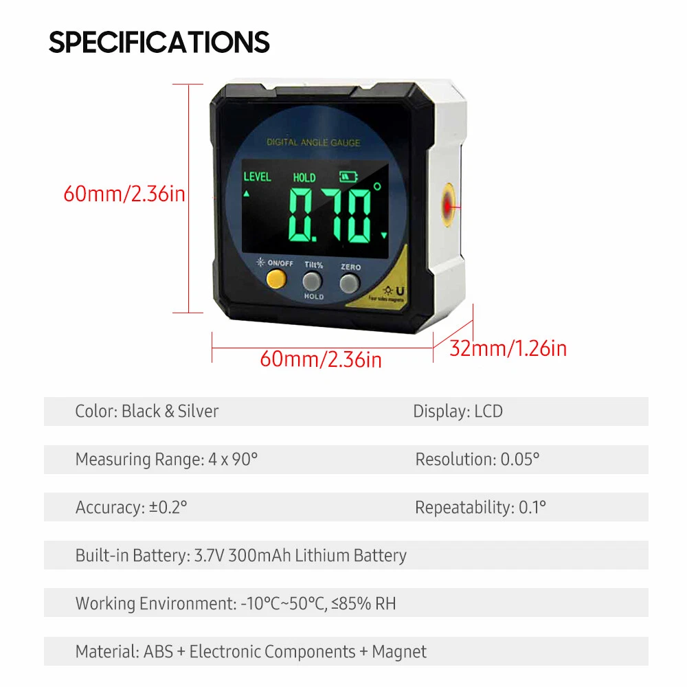 Electrical levelling instrument is a portable tool which can measure the tilt angle quickly and accurately. Features: With 4 x 90° measuring and 0.2° high accuracy, the two-sided digital inclinometer is designed for measure the tilt angle quickly and accurately. Relative/ absolute measurement interchange at any position; the absolute position has been factory-calibrated, the relative position can be set at any slope. 1.8-inch digital LCD screen, angle and slope readout conversion, data hold function, clear and intuitive. 3 minutes automatic shutdown function to save energy. 300mAh rechargeable ensures strong endurance; quickly recharge it via the type-C USB port. Built-in in 4 corners ensure the inclinometer and measured object are close fitting. size, lightweight and portable. Widely used in wood processing industry (especially in furniture manufacturing) for the accurate cutting of wood angle, auto industry for the accurate control of tire angle, machine industry for the accurate position of tool working angle as well as the rotation angle of large vehicle , and etc. Note: Size and color may be slightly different due to manual measurement and different conditions. Thanks for understanding. Specifications: Color: Black & Material: ABS + Electronic + Display: LCD Measuring : 4 x 90° Resolution: 0.05° Accuracy: ±0.2° Repeatability: 0.1° Built-in : 3.7V 300mAh Working Environment: -10℃~50℃, ≤85% RH Item Size: 60 * 60 * 32mm / 2.36 * 2.36 * 1.26in Item Weight: 112g / 3.95oz Package Size: 10.5 * 8.5 * 4.2cm / 4.13 * 3.35 * 1.65in Package Weight: 165g / 5.83oz Package List: E21415 1 * Digital Inclinometer 1 * Cloth Bag 1 * USB Cable (Type-C) 1 * User Manual (English)
