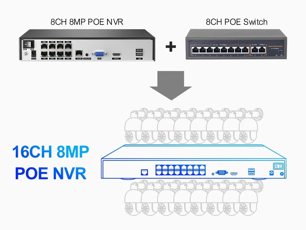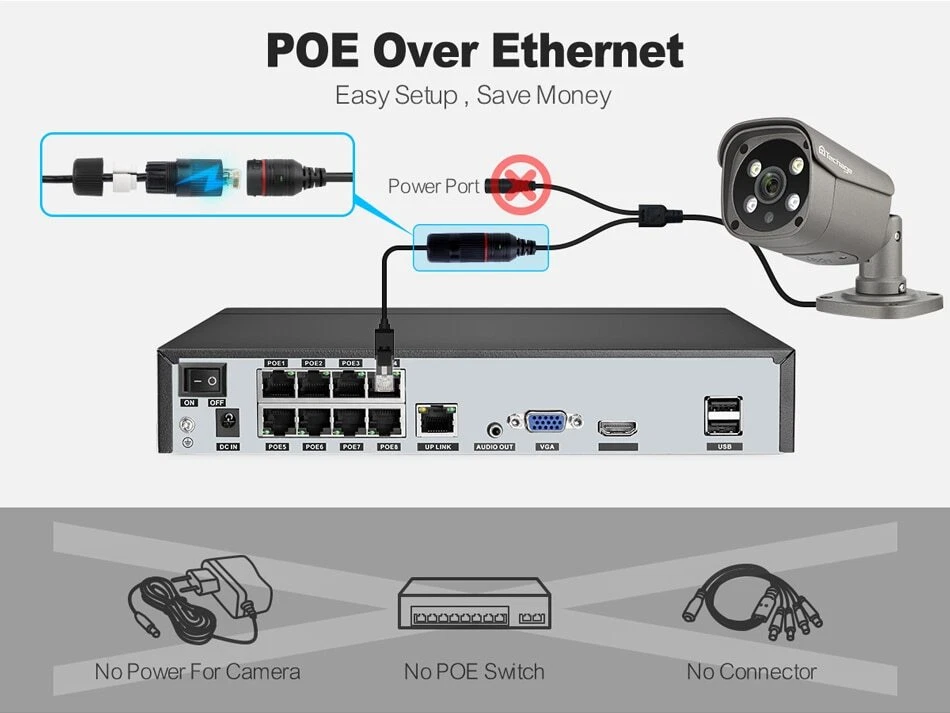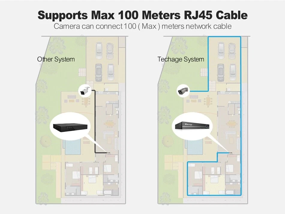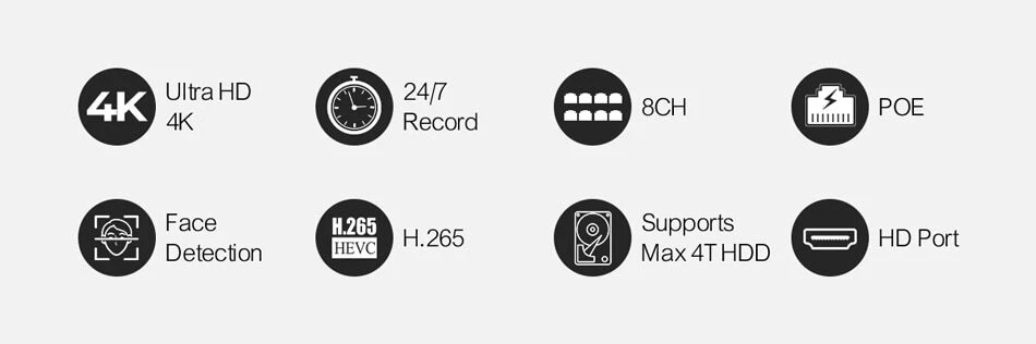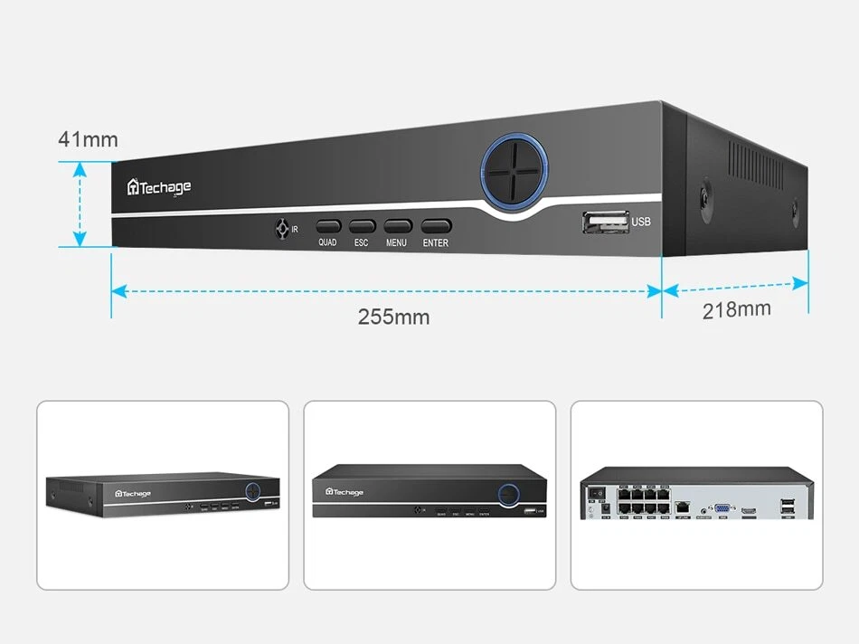 13V/15V Cameras or Cameras without ONVIF protocol cannot be connected for use Sopport Ultra HD 4K Display H.265 POE NVR H.265 More Clear , HD resolution offer you best image qualityin a lower bit rate. Save more storage space,can reduce 40%-50% file size,save your HDD storage space and reduce your purchase cost. H.265 only need a lower bandwidth,speed loading faster,play video more smoothly POE Advantage, Why Choose POE? Don't need extra power cables or adapters or switch.Plug And Play and easy setup. Save Money and Convenient,POE NVR = NVR + POE Switch Support be extended to 8CH/16CH NVR Our 8CH POE NVR Can be Extended to 16pcs POE Camera if use 8CH POE Switch Together 4CH POE NVR Can be Extended to 8pcs POE Camera if use 4CH POE Switch Together If you want to buy 4CH/8CH/16CH POE Switch, please click the picture Techage POE CCTV System Max support 100 meters transmission distance Our NVR Supports up to 14TB HDD Install and Connect it It can be quickly and easily setup by anyone. Instantly see live video using your computer, tablet, or phone from anywhere. Don't need extra power cables or adapters or switch. Support work with third-party cameras Advanced Human Detection Recording The humandetection recording function: when human is detected the NVR will save the footage into hard disk without missing any important events. E-mail Alerts NVR will send you mail automatically if there is any motion detected. Video With Smart Playback Smart playback available with customizable searching area, playback time is greatly reduced by speeding through unimportant videos. Remote Access Anytime, Anywhere Based on P2P (peer to peer) technology, support plug-and-play installation. Access the IP camera through its web interface via Internet Explorer, also comes with a free smartphone App (Android & iPhone) for remotely view from anywhere. Support iOS and Android Device Access. Scan QR-Code to login. Download free app in Apple App store / Google play. H.265 4K/8MP POE NVR(with Audio out) You can use this POE NVR connect Audio Camera! Support Audio Recording H.265 8CH 4K/8MP Support HD output VGA HD output Support ; access third party Support web, CMS, center platform management software MYEYE Support multiple network services (support DHCP, FTP, DNS, DDNS, NTP, UPNP, EMAIL, IP searches, Alarm Center, etc.) System resources :Simultaneous multi-channel real-time recording, playback, network operation, USB backup Display quality :4K/5MP/4MP/1080P Audio compression: G.711A Recording mode: Manual>Alarm>Dynamic Detection>Timing Record storage: HDD Backup mode : Network backup, USB hard disk, USB burner, SATA burner Network interface:8CH POE Port, the standard POE IEEE802.3af/at Protocol P2P Remote View: Support iOS, Android 20+ Languages Available: Russian, English, Italian, Portuguses, Spanish, French, German etc 8CH POE NVR can support 8CH 1080P / 8CH 5MP / 8CH 4K / 16CH 5MP 4CH POE NVR can support 4CH 1080P / 4CH 5MP / 4CH 4K / 8CH 5MP 1, 8CH POE NVR can support 4K/8MP max, you can connect 2MP,4MP,5MP,4K cameras with our NVR. but you need buy our 5MP/4K cameras , then they can work together ! 2, If you want connect 16CH 5MP cameras , you buy to buy a extra 8CH POE Switch , please contact us buy it ! 4CH POE NVR can support 4CH 5MP / 8CH 4MP Package Included: 1 x4CH/8CH 4K POE NVR 1 X USB Mouse 1 xUser Manual 1 X Power Adapter for NVR 1 X Remote Control (No Battery) Note :Our POE NVR include the remote control ( without battery )