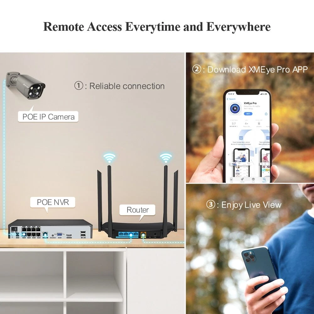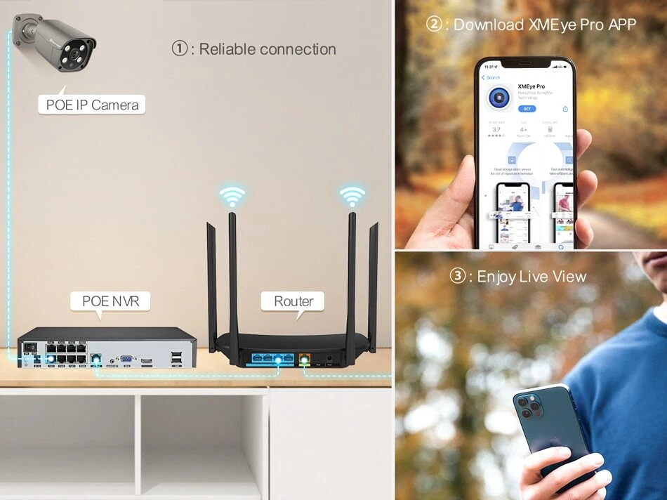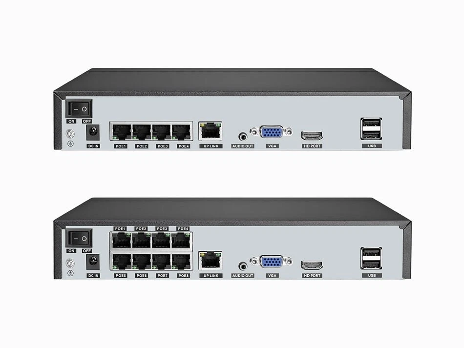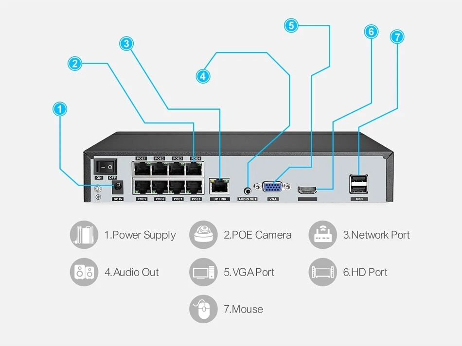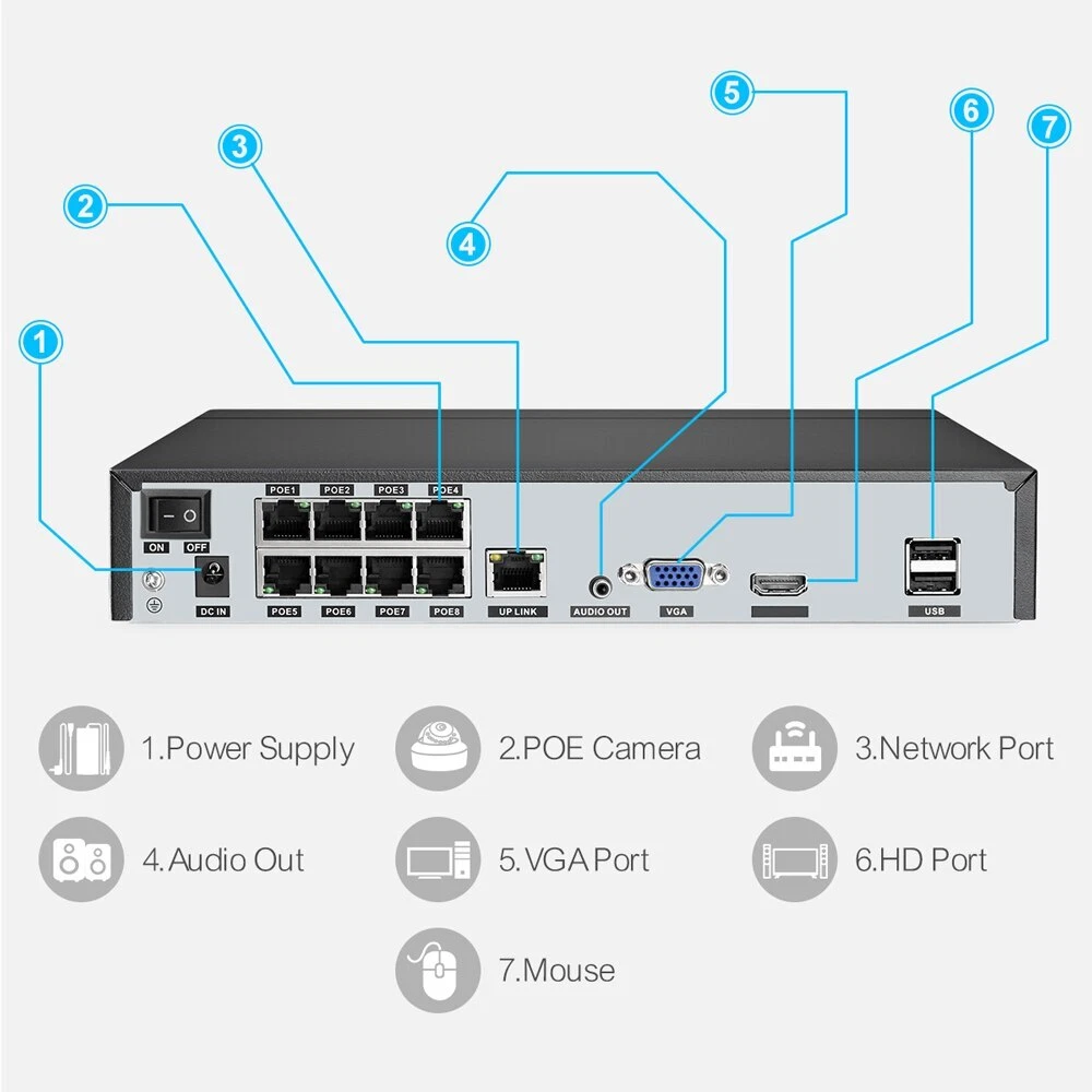 13V/15V Cameras or Cameras without ONVIF protocol cannot be connected for use Sopport Ultra HD 4K Display H.265 POE NVR H.265 More Clear , HD resolution offer you best image qualityin a lower bit rate. Save more storage space,can reduce 40%-50% file size,save your HDD storage space and reduce your purchase cost. H.265 only need a lower bandwidth,speed loading faster,play video more smoothly POE Advantage, Why Choose POE? Don't need extra power cables or adapters or switch.Plug And Play and easy setup. Save Money and Convenient,POE NVR = NVR + POE Switch Support be extended to 8CH/16CH NVR Our 8CH POE NVR Can be Extended to 16pcs POE Camera if use 8CH POE Switch Together 4CH POE NVR Can be Extended to 8pcs POE Camera if use 4CH POE Switch Together If you want to buy 4CH/8CH/16CH POE Switch, please click the picture Techage POE CCTV System Max support 100 meters transmission distance Our NVR Supports up to 14TB HDD Install and Connect it It can be quickly and easily setup by anyone. Instantly see live video using your computer, tablet, or phone from anywhere. Don't need extra power cables or adapters or switch. Support work with third-party cameras Advanced Human Detection Recording The humandetection recording function: when human is detected the NVR will save the footage into hard disk without missing any important events. E-mail Alerts NVR will send you mail automatically if there is any motion detected. Video With Smart Playback Smart playback available with customizable searching area, playback time is greatly reduced by speeding through unimportant videos. Remote Access Anytime, Anywhere Based on P2P (peer to peer) technology, support plug-and-play installation. Access the IP camera through its web interface via Internet Explorer, also comes with a free smartphone App (Android & iPhone) for remotely view from anywhere. Support iOS and Android Device Access. Scan QR-Code to login. Download free app in Apple App store / Google play. H.265 4K/8MP POE NVR(with Audio out) You can use this POE NVR connect Audio Camera! Support Audio Recording H.265 8CH 4K/8MP Support HD output VGA HD output Support ; access third party Support web, CMS, center platform management software MYEYE Support multiple network services (support DHCP, FTP, DNS, DDNS, NTP, UPNP, EMAIL, IP searches, Alarm Center, etc.) System resources :Simultaneous multi-channel real-time recording, playback, network operation, USB backup Display quality :4K/5MP/4MP/1080P Audio compression: G.711A Recording mode: Manual>Alarm>Dynamic Detection>Timing Record storage: HDD Backup mode : Network backup, USB hard disk, USB burner, SATA burner Network interface:8CH POE Port, the standard POE IEEE802.3af/at Protocol P2P Remote View: Support iOS, Android 20+ Languages Available: Russian, English, Italian, Portuguses, Spanish, French, German etc 8CH POE NVR can support 8CH 1080P / 8CH 5MP / 8CH 4K / 16CH 5MP 4CH POE NVR can support 4CH 1080P / 4CH 5MP / 4CH 4K / 8CH 5MP 1, 8CH POE NVR can support 4K/8MP max, you can connect 2MP,4MP,5MP,4K cameras with our NVR. but you need buy our 5MP/4K cameras , then they can work together ! 2, If you want connect 16CH 5MP cameras , you buy to buy a extra 8CH POE Switch , please contact us buy it ! 4CH POE NVR can support 4CH 5MP / 8CH 4MP Package Included: 1 x4CH/8CH 4K POE NVR 1 X USB Mouse 1 xUser Manual 1 X Power Adapter for NVR 1 X Remote Control (No Battery) Note :Our POE NVR include the remote control ( without battery )