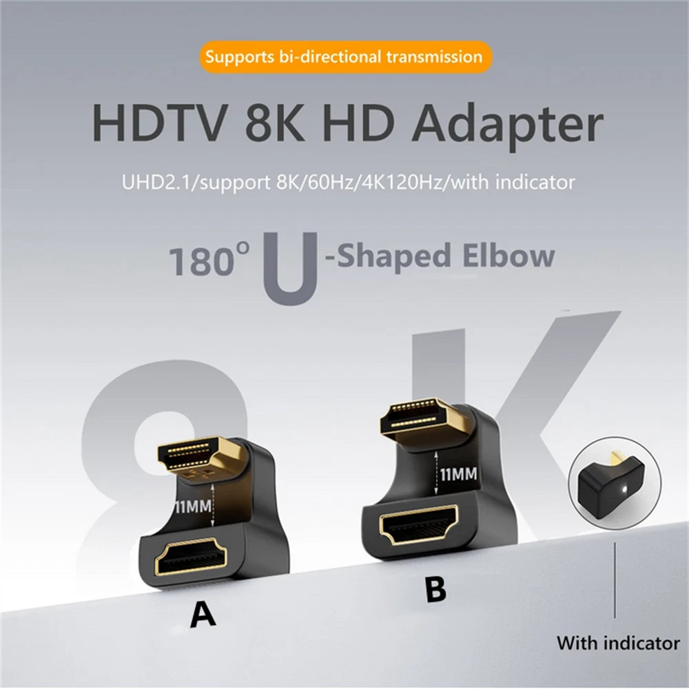 HDMI2.1 U-shaped Adapter HDMI Male To Female Converter 8K60Hz 4K120Hz UHD with Indicator Light for PC Same Screen/Expansion Specification: Material: Aluminum alloy and PVC Style: A, B (optional) Resolution: 7680x4320P Bandwidth: 48Gbps Refresh rate: 8K@60Hz /4K120Hz Version: HDM2.1 (Backward compatibility HDMI 2.0) Size: About 30x23mm/1.18x0.91inch Feature: 1. UHD 2.1 8K Resolution: Supports 7680x4320, 8K/60Hz and compatible with 4K@120Hz, 48Gbps. Offers more dynamic range and image detail, providing a deeper and more realistic viewing experience (Note: The host and display devices must also be version 2.1 to meet requirements.) 2. Stunning 3D Visual Effects: Create a high-definition home theater with 3D imaging technology. Smooth and natural color transitions provide vivid and lifelike images that transport you into the scene 3. Dual Screen Modes: Same-screen/extending dual modes, plug-and-play without drivers. Screen mirroring mode displays the same picture on both screens for a smoother and more enjoyable experience. Extended mode displays different pictures for work and entertainment 4. Compatibility with Various Devices: Suitable for monitors/ TVs/ projectors/ desktop computers/ for laptops/ game consoles, etc. Please check the interface type before purchasing and HD cables are required for use 5. Durable and Long-lasting: Made of aluminum alloy shell material with a matte texture, resistant to pressure and durable, dissipates heat quickly and operates at low temperatures throughout prolonged use Product List: 1x HDMI2.1 U-shaped Adapter