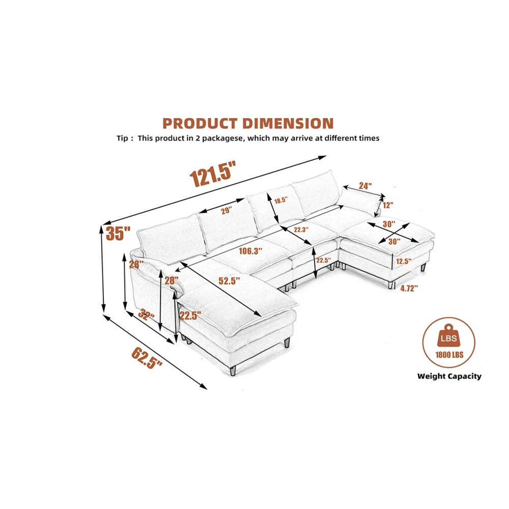 [Comfort Chenille Fabric]: This modern sofa is made of premium skin-friendly fabric, breathable, soft and wearable. With tightly sewn alignment and high elastic sponge filler upholstery to provide enough sitting support, our cloud sofa set can make you relax physically and mentally and snooze anytime! [Reversible Modular Sofa]: You can freely combine and move each unit sofa and footstool to rearrange into a left or right or U-shaped sofa, which can easily adapt to your changing needs. Suitable for large and small rooms. [Strong Structural Frame]: The deep sectional sofa frame is made of wood to ensure robustness and can weigh up to 300 pounds per seat. It is not easy to be deformed and loose, and can extend the service life of the sofa cover. [Versatility And Flexibility]: The modular sofa is completely modular and can be combined into a U-shaped sofa, an L-shaped sofa, a 4-seat 2-foot stool sofa, which can be installed anywhere, and can be configured for movie nights, home visits, and sleeping. [Two Bags With 6-Piece Sets]: Each module can hold up to 300 LBS; Modular sofa, 6 modules are divided into two boxes, greatly reducing your final freight. Flexible Combinations The sofa can change shape according to the number of users in your use scenario. Features Design Modular Sofa, Movable Footstool Sofa Seating Capacity 6 Upholstery Material Chenille Seat Fill Material Foam; Pocket Spring Back Cushion Included Yes,4 included Product Care Lightly brush or vacuum frequently to remove dust and grime. Spot clean using a mild water-based solvent. Pre-test cleaning methods on a hidden surface. A professional cleaning service is recommended for an overall soiled condition. Country of Origin China Product Dimensions Dimension 121.5 "W x 62.5 "D x 35 "H Backrest Height - Floor to Top of Back 28'' Arm Height - Floor to Arm 28'' Seat Height- Floor to Seat 22.5" Seated depth 52.5"/22.3" Throw pillow size 29*18.5"(L*D) Armrest pillow size 24*12"(L*D) Weight Capacity 300 lbs / seat Plastic feet size 4.72" Adult Assembly Required Yes Suggested # of People 6 Notice: 1.Due to the difference between computer display and photography, the color of the pictures and actual products will be slightly different. 2.The packaging of the product package may be updated at any time, please refer to the actual product received. 3. Most of our sofas are hand-measured, therefore the dimensions are for reference only, and may marginally deviate. 4.Due to the vacuum compression of some seats, you need to pat and wait for time to help them return to their original state. On Mar 10, 2025 at 01:21:54 PDT, seller added the following information: