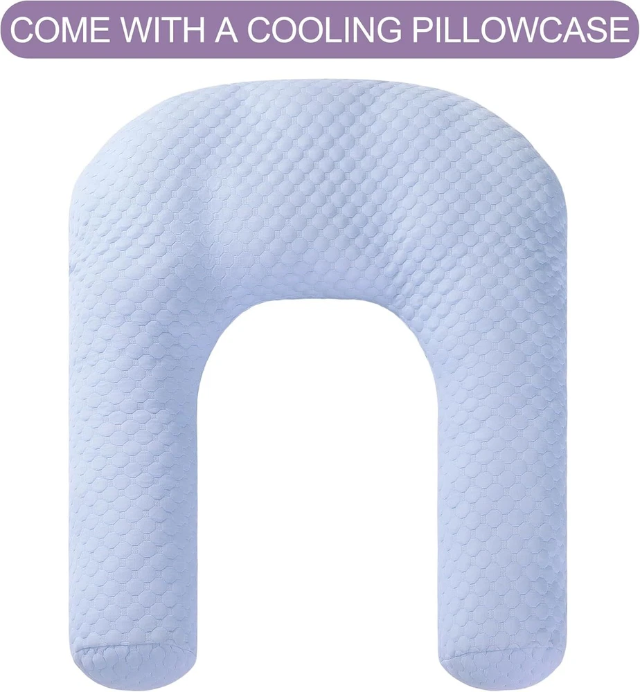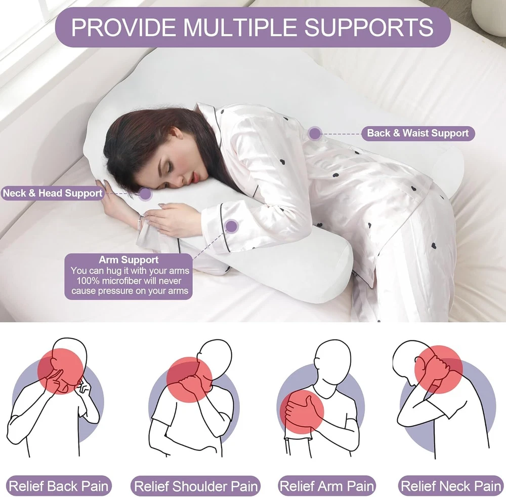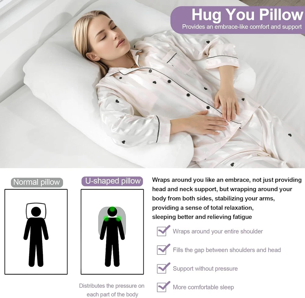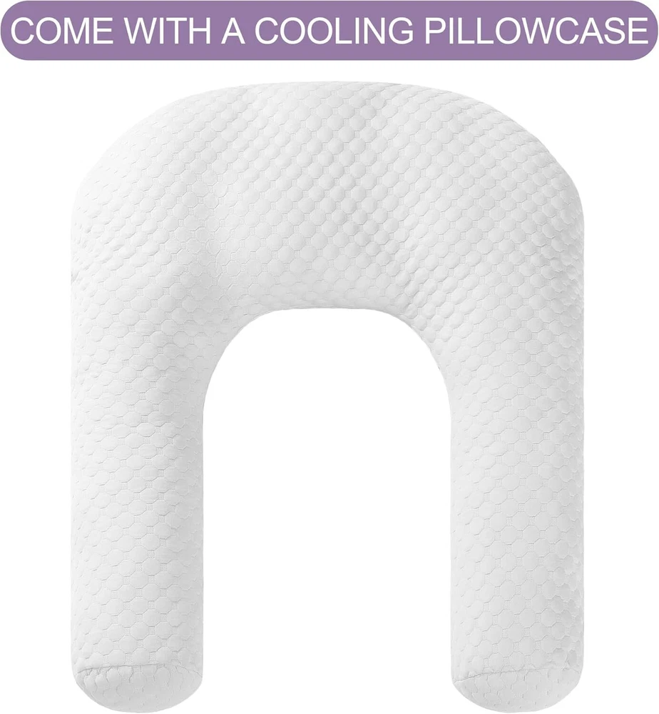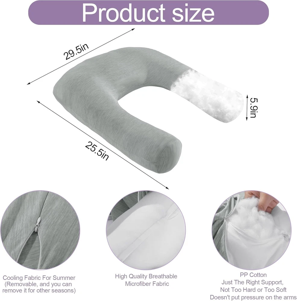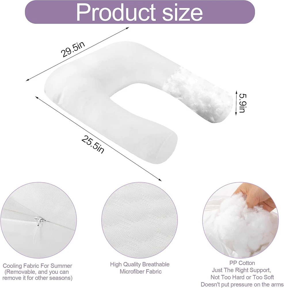 【Product Information】:Adult size body pillow dimensions are 29.5 "L x 25.5 "W x 5.9 "H. Inner shell fabric is made of microfiber with 3D structural breathable design, outer pillowcase is cool-feeling fabric, filling with premium fluffy microfiber 【Cooling & Breathable Pillowcase】: orthopedic bed pillow is designed with 2 pillowcases, inner cover is suitable for all seasons, and special cold outer shell is designed for summer, you can change the cover by your needs. With this cold side sleep pillow, keep you cozy and fresh all night without sweating 【Ergonomic U Shape Body Pillow】:Supportive U pillows for adults just wipe you like a hug, and provide support for your neck, shoulder, arm and back. For a side sleeper whoes shoulder always afford presssure, this bed pillow is an ideal choice to reduce pressure for a better sleep 【Adjustable Cuddle Pillow】: Head, neck and arm areas designed individual pillow insert, with zipper design, the amount of stuffing can be personlized according to your needs. U-shaped design provides arm support, this shoulder sleeper pillow can be moved without affecting the turn over 【Care Instructions】: It's machine washable and easy to care. This pillow is compression packed, leave it for 48-72 hours after opening the package, it will expand and become fluffy 【Widely Application】: pillow is not only a side pillow, it's also a back sleeper pillow and belly sleeper pillow. For side sleeper, it's a pillow to hug while sleeping and provide arm support. Also you can use it as a neck pillow and shoulder support pillow
