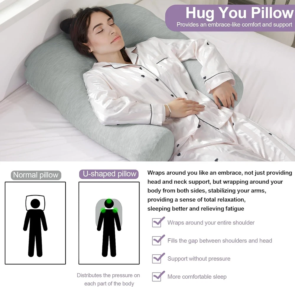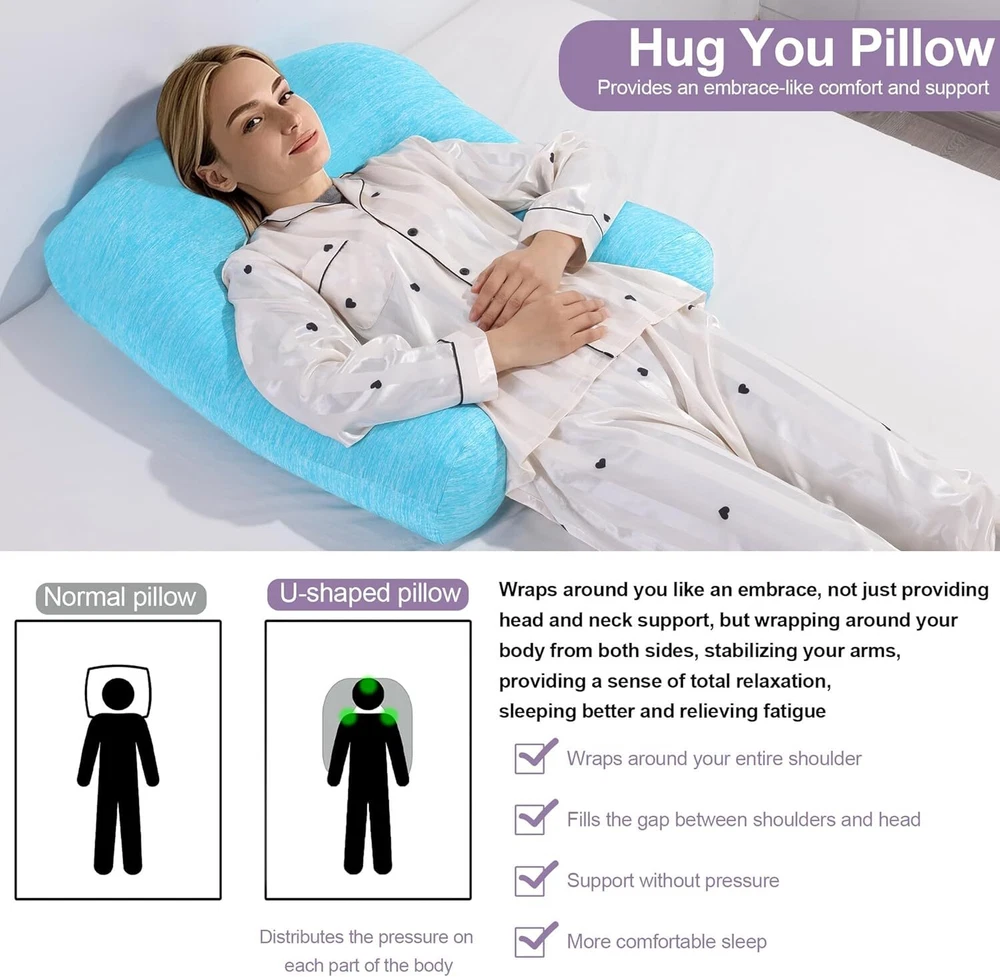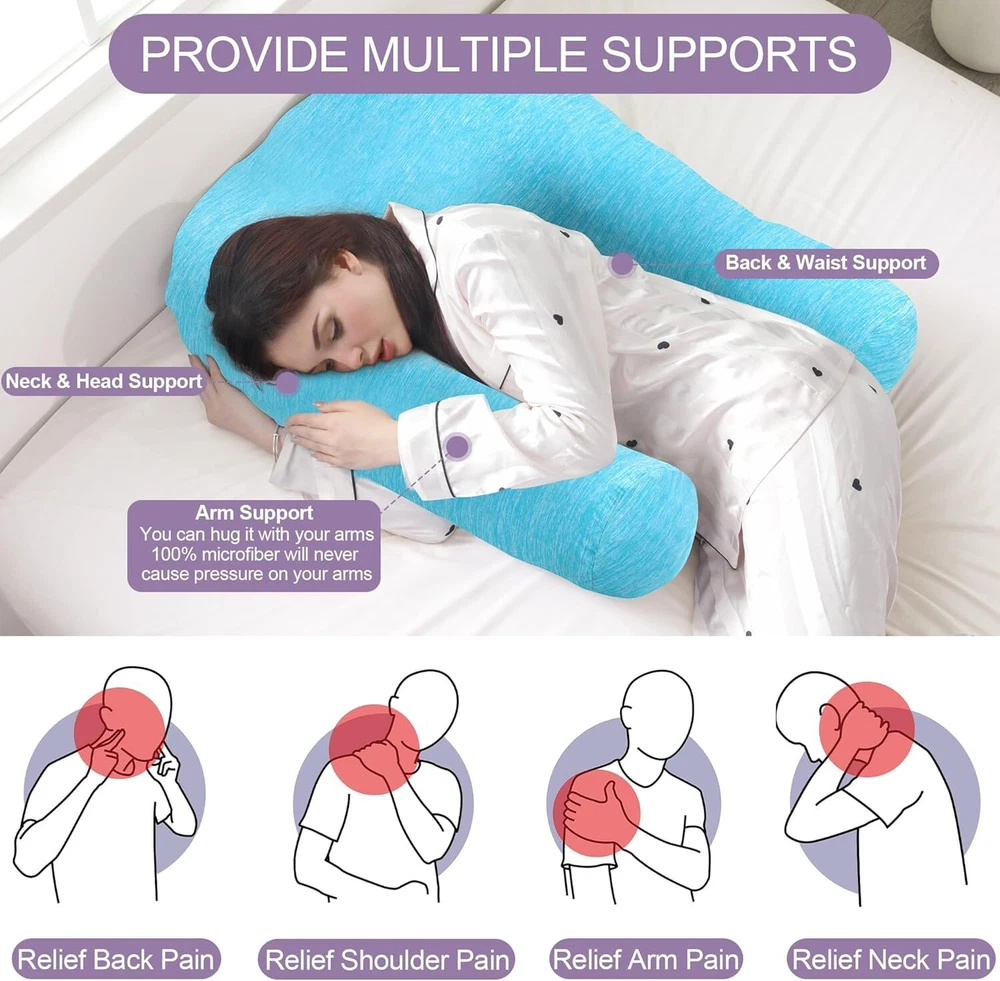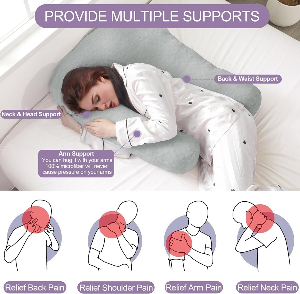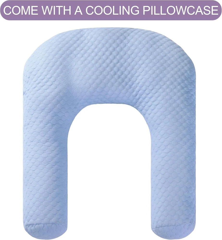 【Product Information】:Adult size body pillow dimensions are 29.5 "L x 25.5 "W x 5.9 "H. Inner shell fabric is made of microfiber with 3D structural breathable design, outer pillowcase is cool-feeling fabric, filling with premium fluffy microfiber 【Cooling & Breathable Pillowcase】: orthopedic bed pillow is designed with 2 pillowcases, inner cover is suitable for all seasons, and special cold outer shell is designed for summer, you can change the cover by your needs. With this cold side sleep pillow, keep you cozy and fresh all night without sweating 【Ergonomic U Shape Body Pillow】:Supportive U pillows for adults just wipe you like a hug, and provide support for your neck, shoulder, arm and back. For a side sleeper whoes shoulder always afford presssure, this bed pillow is an ideal choice to reduce pressure for a better sleep 【Adjustable Cuddle Pillow】: Head, neck and arm areas designed individual pillow insert, with zipper design, the amount of stuffing can be personlized according to your needs. U-shaped design provides arm support, this shoulder sleeper pillow can be moved without affecting the turn over 【Care Instructions】: It's machine washable and easy to care. This pillow is compression packed, leave it for 48-72 hours after opening the package, it will expand and become fluffy 【Widely Application】: pillow is not only a side pillow, it's also a back sleeper pillow and belly sleeper pillow. For side sleeper, it's a pillow to hug while sleeping and provide arm support. Also you can use it as a neck pillow and shoulder support pillow