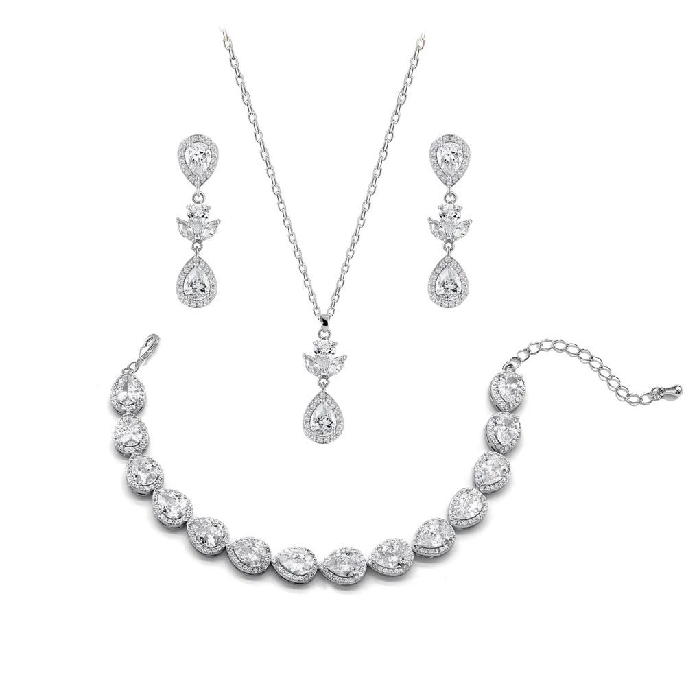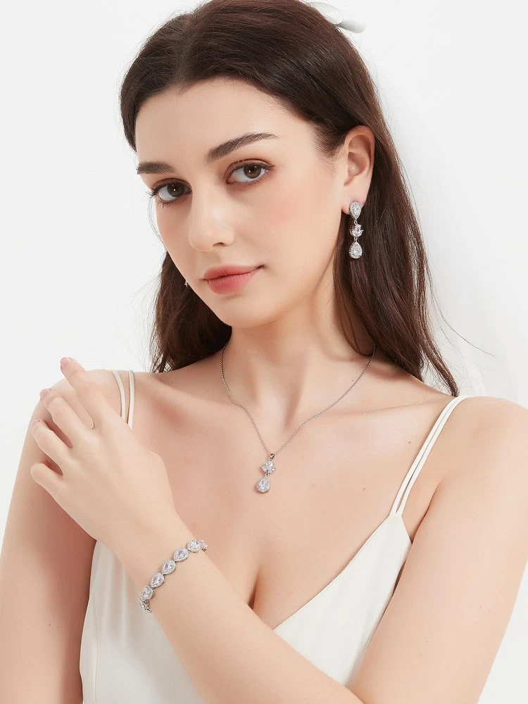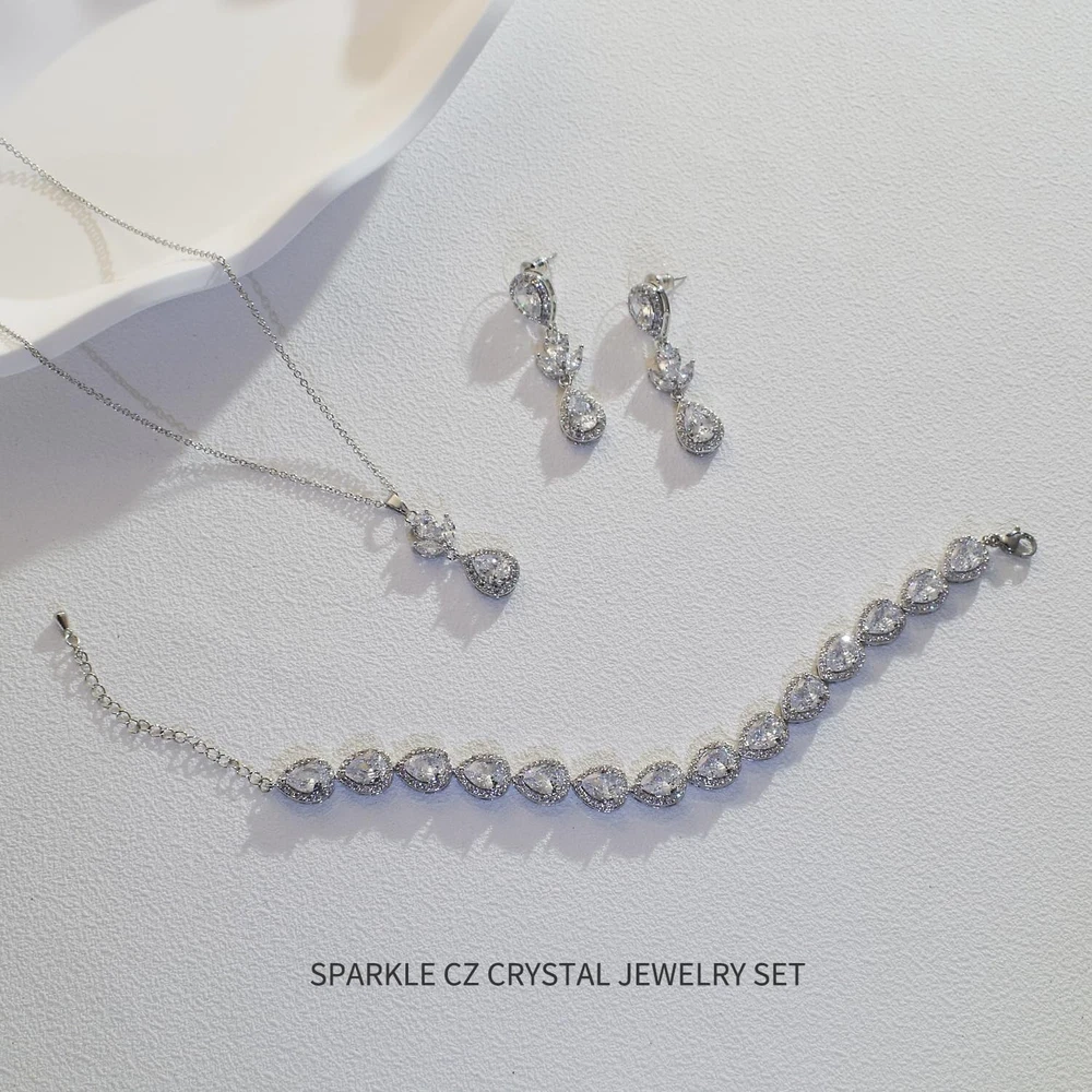 UDYLGOON Cubic Zirconia Crystal Teardrop Bride Bridesmaid Wedding Jewelry Set Earrings Necklace Bracelet Set for Women Party Prom Product Details Color: Silver Brand: UDYLGOON MPN: UD506 UPC: 757603410599 EAN: 0757603410599 Package Dimensions : 3.54 x 3.54 x 0.79 inches; 2.82 ounces Item model number : UD506 Department : womens Date First Available : April 18, 2024 Manufacturer : UDYLGOON Brand, Seller, or Collection Name: UDYLGOON Metal: gold-plated-copper Material: Copper Gem Type: Cubic Zirconia Setting: 4-Prong-Setting Chain: link_chain Clasp: Lobster Clasp Model number: UD506