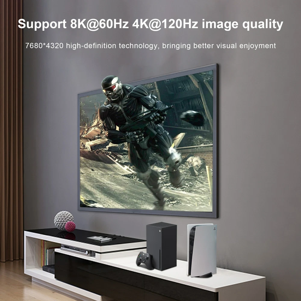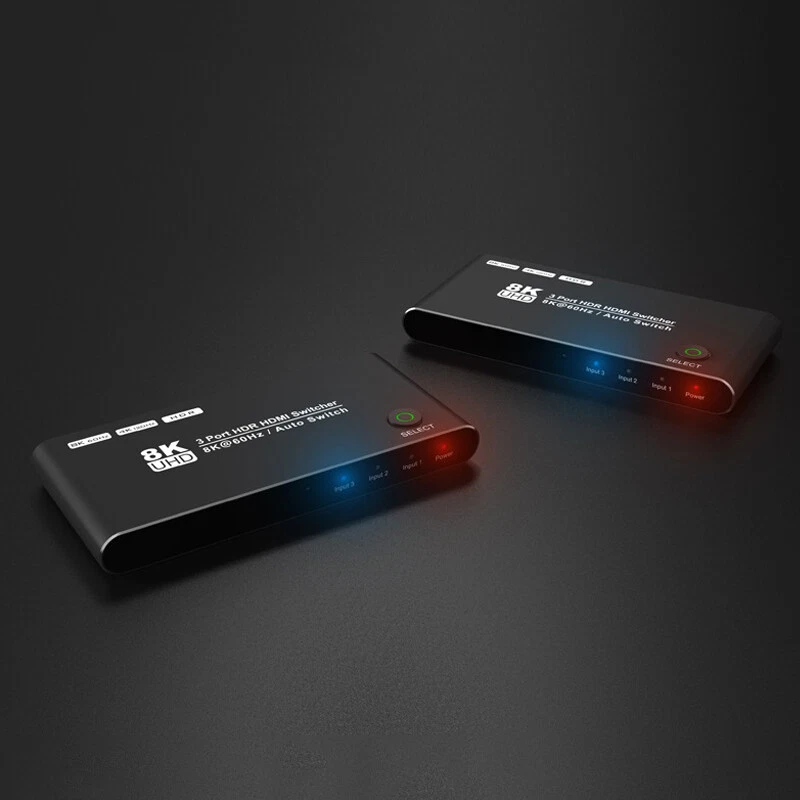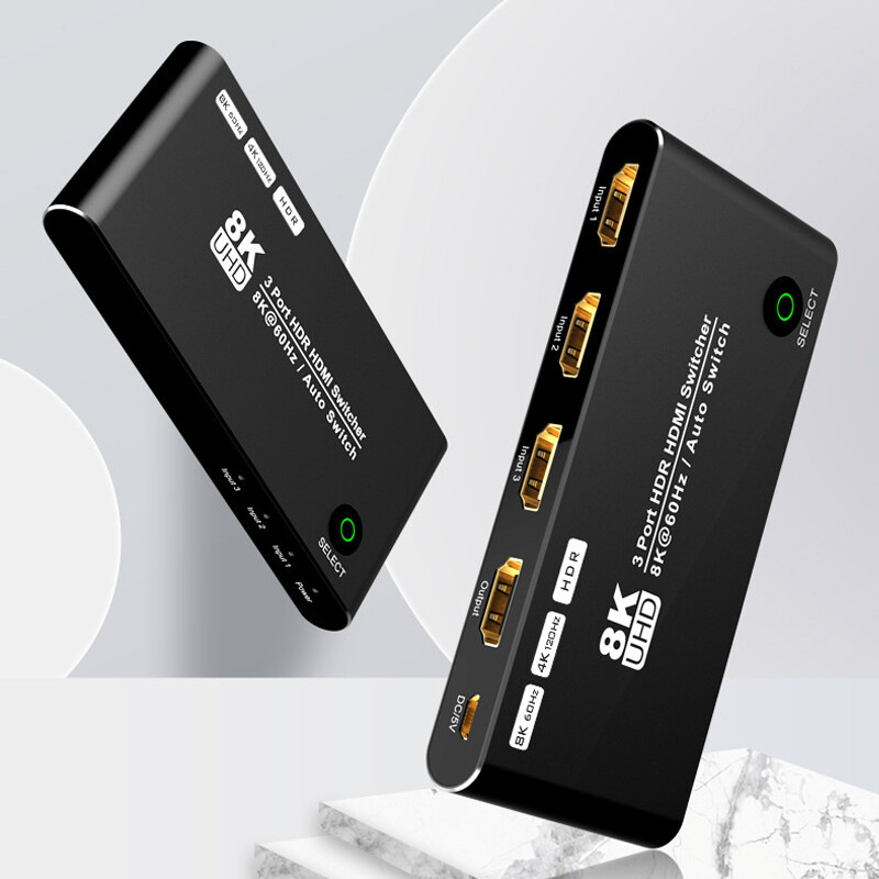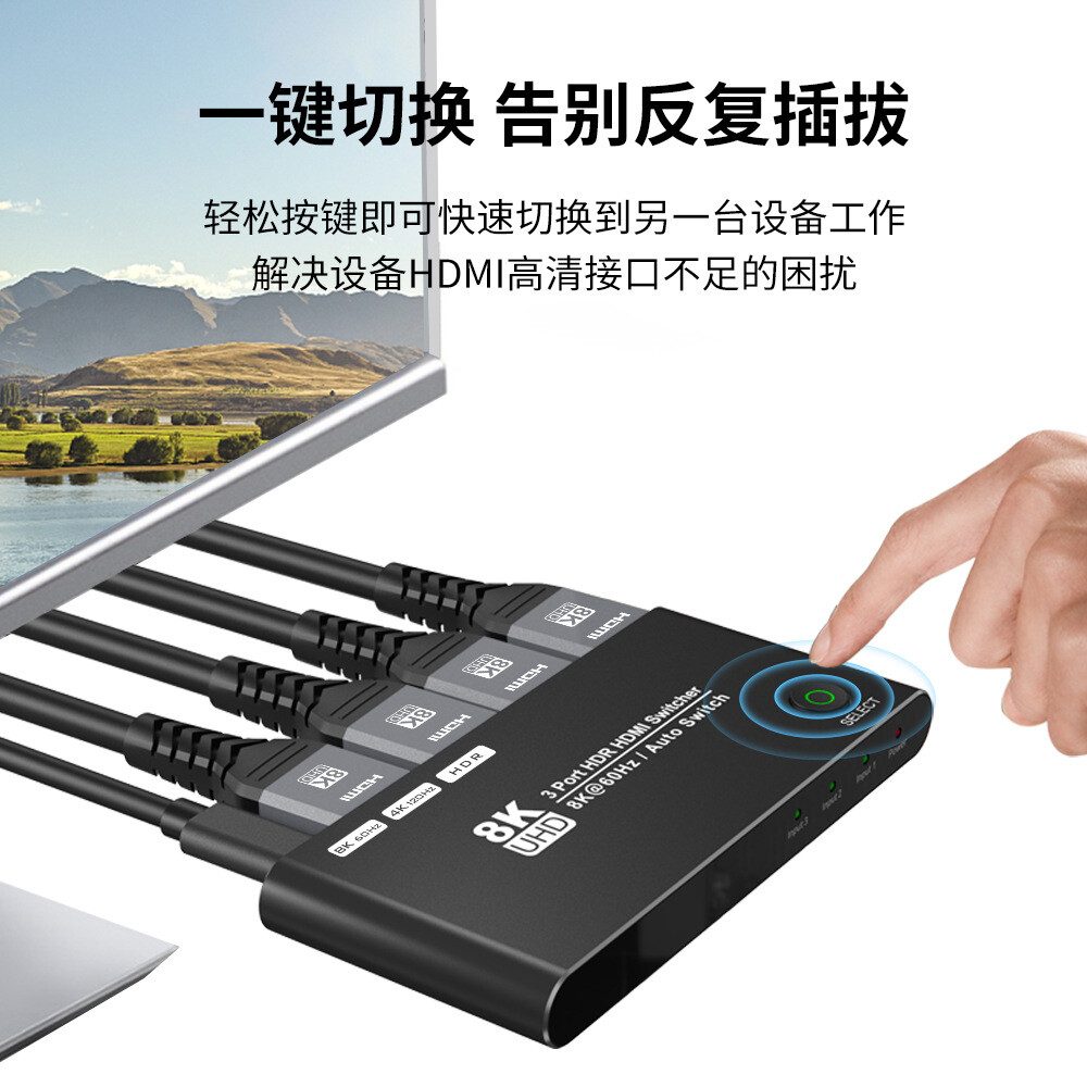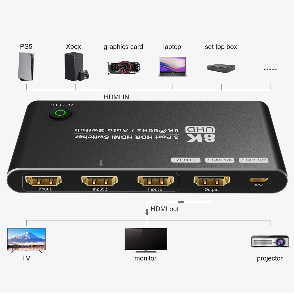 Unidirec tio n a l 3in 1 out 8K HDMI-compatible 2.1 Switch New upgraded HDMI-compatible 2.1 switch 3in 1out, connect 3 HDMI-compatible sources to one display, allowing you to switch between different devices with one key. All ports are designed on the same side which makes the desktop tidier, and the indicator light allows you to easily distinguish the working device. [Tips: Up to the best performance with power supply. Please pay attention that this switcher is not a bi-directional switcher, you can only use from three source to one display, but you can not connect from one source to three displays, only 3in 1out, not 1in 3out.] Automatically Swit ch Signals The HDMI-compatible switch box uses the most advanced chip and has far superior performance. A compact body and stylish appearance can bring you a great experience. In addition, there is a built-in automatic recognition program, which can automatically switch to the latest plug-in device without pressing a button, making it more convenient for you to use. 8K UHD Video& Au dio Transmission Support 7680*4320/8K@30Hz,60Hz, 3840*2160/4K@30Hz,60Hz,120Hz Resolution, Dynamic HDR, eARC, HDCP 2.2&2.3, DTS-HD Master Audio, DTS:X, Dolby Vision. In addition, this switcher up to 48Gbps ultra-high bandwidth which can transmit UHD video and audio data with ultra high speed, make your home theater has a cinema-like audio-visual effect. Aluminum Shell & Widely Compatible The multi-port switch is made of a high-quality aluminum alloy shell that has excellent heat dissipation performance. Compatible with input device: Xbox Series X, PS5 / PS4, Computer, Laptop, 4K & 8K Blu-Ray Player, Roku Streaming Stick , Fire Stick, Apple TV. Output devices: LG/Sony/Samsung 8K UHD/QLED TV, monitors, projectors, and other 4K/2K displays from Samsung, LG, Dell, Panasonic, etc. Pack age 1*HDMI Switch 3in 1out 1*USB charging cable x 1 1*User manual x 1 No te When connecting your PC with graphics cards such as NVIDIA (RTX3060,3070,3080,3090 Series) and AMD(RX 6600,6700,6800,6900 Series) to 8K UHD TV, Remember to turn on the deep color function of TV sets( "HDMI-compatible Ultra HD Deep Color"). For the PC settings, be sure to choose the right Refresh rate: 3840x2160@120Hz and turn on HDR function("Display Setting"→"Advanced Display Settings"→"Windows HD Color" →turn on "Play HDR Games and Apps"→OK), then you can enjoy your 4K@120Hz HDR games and videos.