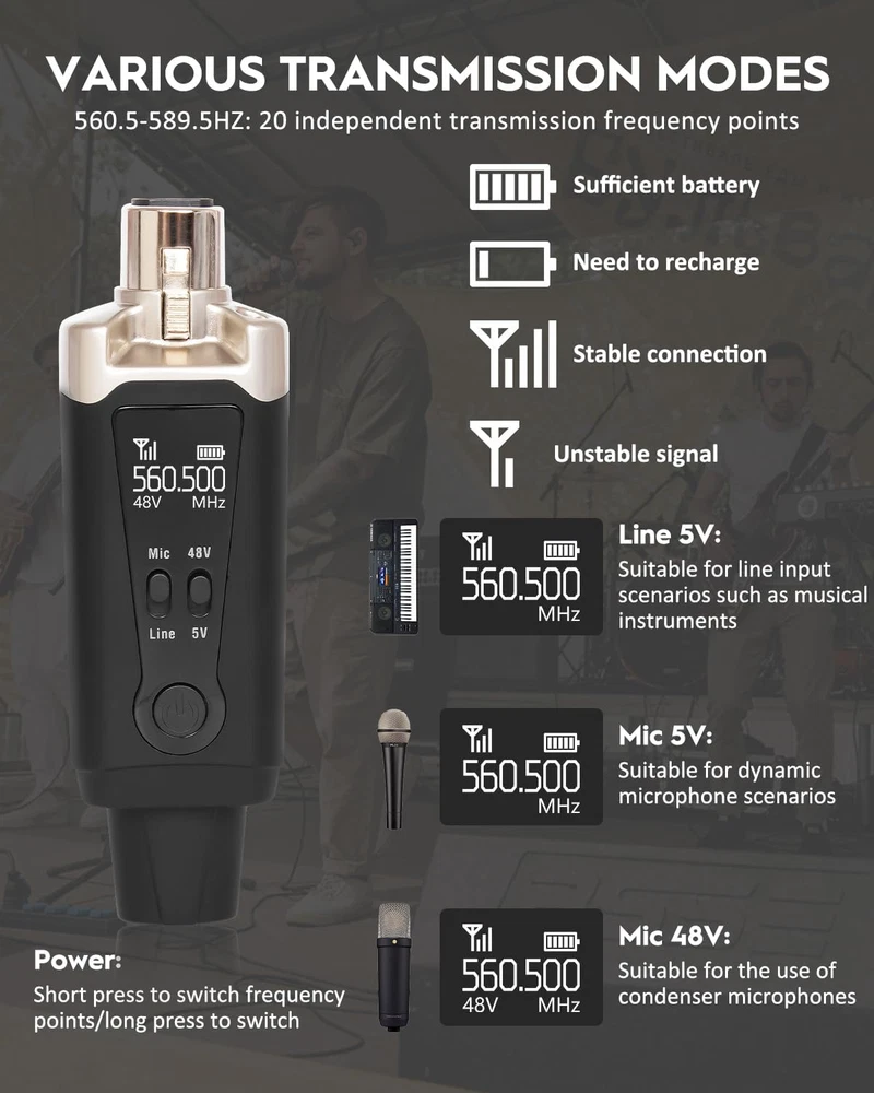 Store New Arrivals Add to Favorite View Feedback Contact UHF Wireless XLR Transmitter and Receiver, XLR Microphone Adapter 16 Channels, Wireless Mic Adapter with 48V Phantom Power for Dynamic Mic, Condenser Mic, Audio Mixer, Electric Guitar Bass, M2 Description Item model number M2 Power Source Battery Powered Product Dimensions 7.28 x 6.3 x 1.57 inches Country of Origin China Compatible Devices Wireless Microphone Connector Type USB Item Weight 13.4 ounces Color Name Rose Gold Is Discontinued By Manufacturer No Support 48V Phantom Power Supply: Cannot be used with high capacitance microphones, such as Behringer BA 19A. Turn off the phantom power switch, the M2 audio transmitter and receiver can be used to connect dynamic microphones. Turn on the phantom power switch, M2 can be used to connect a condenser mic. Normal working hours are 6-8 hours. Ultra Long Distance Transmission: UHF band is optimal for microphone wireless, solid RF connection over a 164 - 262 feet range(normal), uncompressed wireless signal transmission, low noise, and latency. Up to 110 dB signal-to-noise ratio provides clear, detailed audio at any volume. High-resolution 24-bit / 48kbps audio. Broad 40Hz - 20KHz frequency response. Anti-interference: The M2 wireless mic system adopts ultra-high frequency UHF transmission technology, strong anti-interference ability, and ultra-high frequency response range, ensuring that your voice is transmitted stably and clearly to the audio receiving device. Metal XLR Interface: Connect various devices more firmly and stably, such as microphones, speakers, mixers, and PA systems. Comes with an XLR to 1/4 adapter, allowing the M2 wireless XLR microphone transmitter-receiver to be widely used in different usage scenarios. Low Latency / 20 Frequency Points: Support 20 sets in the same place simultaneously. Works with any dynamic/harmonic microphone, Audio mixer, or PA system, and provides stable and reliable wireless transmission.Less than 6 ms latency(normal), Simultaneous broadcasts on 20 channels, perfect for venues, weddings, and mobile DJs. Any question click on "YOUR ORDER" options click the “contact seller". Product Description Transmitter 1. OLED display 2. Power button 3. Mode switch 4. 5V USB-C charging port Transmitter Display 1. Power / Signal status 2. Transmission frequency 3. Volume parameter 4. Transmission mode Receiver 1. Power button 2. 5V USB-C charging port Receiver Display 1. Power / Signal status 2. Transmission frequency 1 Transmitter 2 Transmitter Display 3 Receiver 4 Receiver Display Features of M2 UHF Wireless Microphone System No More Wires Abandon the traditional messy wiring and make your presentation more flexible and free! OLED Display Display your connection status, allowing you to monitor device status clearly, and make your performance more confident. 16 Frequencies You can simultaneously use 16 sets of M2 UHF wireless mic XLR transmitter and receivers without interference. Two Additional Connectors Includes multiple XLR to 1/4" connectors and 1/4" to 1/8" connectors, suitable for a wider range of occasions. Support Multi - device and Multi - application Compatible Partial Devices M2 Wireless Mic System Rechargeable Battery UHF Working Frequency UHF 20 Frequency Channels 20 40Hz - 20KHz Frequency Response 20Hz - 20kHz / Sampling Rate / 95 dB SNR 110 dB < 5ms Delay < 5ms Rechargeable Battery UHF Working Frequency 5.8 Ghz 20 Frequency Channels 4 40Hz - 20KHz Frequency Response 20Hz - 20kHz / Sampling Rate 24-bit / 48KHz 95 dB SNR >140 dB < 5ms Delay < 5ms Rechargeable Battery UHF Working Frequency UHF 20 Frequency Channels 7 40Hz - 20KHz Frequency Response 20Hz - 20kHz / Sampling Rate / 95 dB SNR Higher than 106 dB < 5ms Delay < 5ms M1 M7 M4 Will the M2 guitar receiver charge from the phantom power coming from the mixer? It only can be charged through the 5V USB-C charging port. How long do they work after full charging? Normal working hours are 6-8 hours. ABOUT US We offer the best prices around on high quality products. Our E-store includes media such as books, movies, music and games while offering electronics, toys, sporting apparel, clothing, tools, general home, garden items and more. SHIPPING We are always working hard to ensure your package arrives as soon as possible. Please understand that some factors like weather, high postal traffic, and the performance of shipping companies are outside of our control. We offer free shipping to the lower 48 states and ship within 2 business days of payment, usually sooner. We do not accept P.O. Boxes. Please provide a physical address. For shipping outside of the continental USA, we only use eBay's Global Shipping Program.The item is shipped to KY and then sent to the rest of the world. International customers are responsible for all duties and taxes. Continue to check out in order to calculate costs for shipping the item to your country. Messages regarding eBay's Global Shipping Program MUST be directed at eBay EXCLUSIVELY. RETURNS We offer a 30-Day Return Policy on items which you are not completely satisfied with. You have the option for a full-refund or an exchange of the item. No returns are available on items shipped outside of the USA. PAYMENT We accept PayPal. CONTACT US This page content is yet to come Please ad us to your favorite seller and visit again later Thank You CUSTOMER SATISFACTION We try our very best to make sure every customer is completely satisfied. If there's a problem, message us! We're happy to help. WE ACCEPT Copyright © 2021 AutoDS. | All Rights Reserved