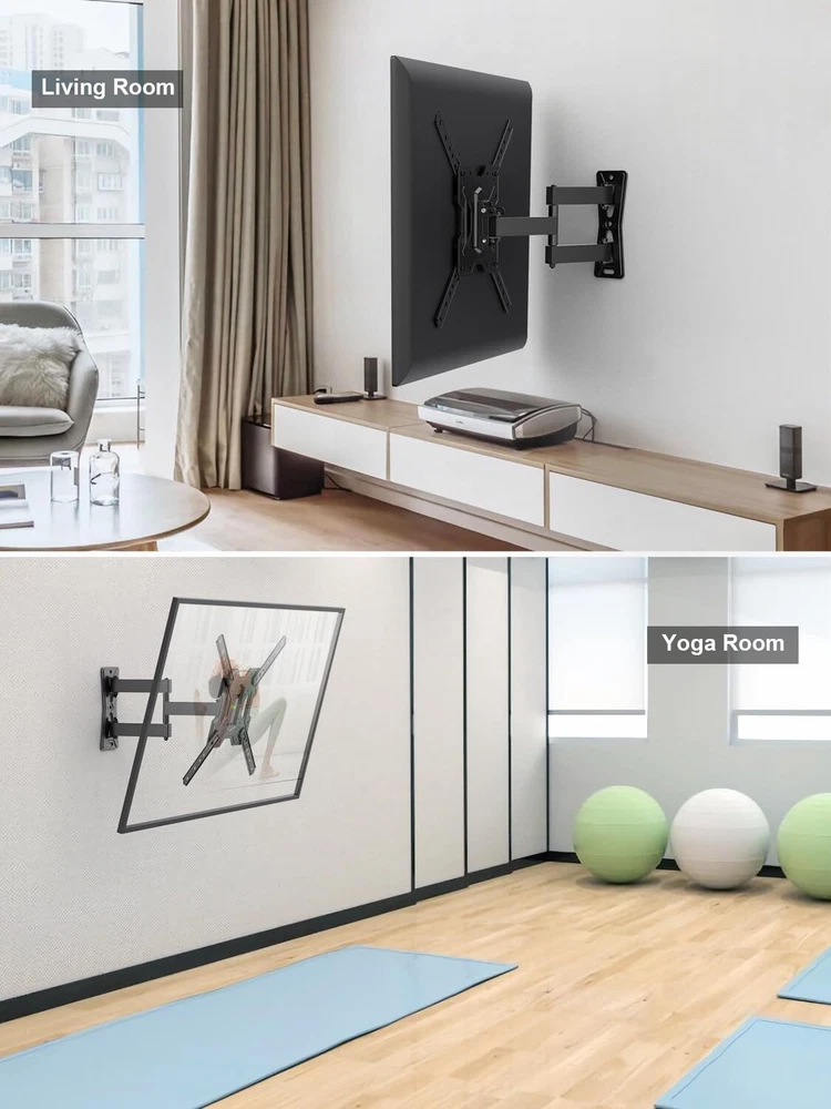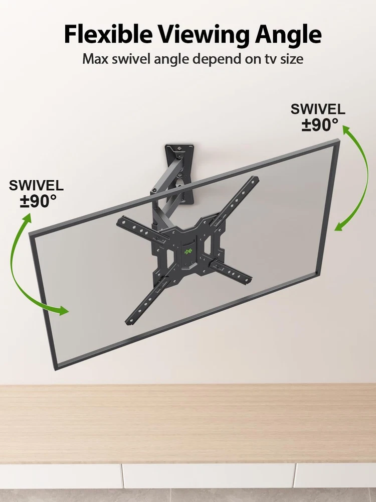 Universal TV Mounts This full motion TV mount fits for most of 26-55inch TVs with VESA size 75*75mm, 100*100mm, 200*100mm, 200*200mm, 300*300mm, 400*200mm, 400*400mm available. This TV mount includes all features you need. Extend out 18.95" and swivel +/-90° to give any seat in the house the perfect viewing angle. Even above the fireplace, you can tilt it up 5° or down 15° to find the perfect position you want. Also, this mount sits only 2.81" from the wall when retracted in, ideal for those large TV. More Wall Mounting Options Concrete wall, single wood stud spacing with piece of wall plate, you have no worries with this mounting system. Easy Installation Install it in 3 Easy Steps: Install this TV mounting bracket on the wall - Mount the brackets on TV - Hang the TV and Screw tight! The job is done! Customer First, Quality First Customer first and quality first are our business principle. Our US-Based customer support are always ready to help. If you have any concerns before you purchase or any installation problems, you can feel free to us. 10 years Guaranteed! Your Safety is Our Priority We have over 20 years TV mounts manufacturing experience. All of our TV brackets are designed, produced and tested with the highest international standards. Trusted by thousands of families and companies who have installed our safe mounts into their spaces. Notice Use 4 side screws if you mount on concrete wall, just use 3 middle screws if you mount on wood stud! TV WALL MOUNT COMPATIBLITY: This full motion TV mount fits for most of 26-55inch TVs with VESA size 75*75mm to 400*400mm available and perfect center design. ADJUSTABLE VIEW COMFORTABLE: This swivel TV mounting bracket with articulating arms includes +5° /-15° tilt, ±90°swivel( maximum TV swivel angle depends on your TV), +/-5° post-installation adjustment allows the perfect TV leveling.The TV wall mount of will make your TV flexibility and better view based on your seat in the room. The TV wall holder also let your TV mounted in the corner. EASY TO INSTALL: Detailed instruction and all included hardware in pre-labeled bags. This TV mount is designed for use in wood stud, solid concrete walls - DO NOT install into drywall alone Warm tips: In order to avoid customer misusing concrete anchors onto wood studs or drywall directly causing any safety issues, we removed concrete anchors from our package. If you need concrete anchors, please us to get it for free which be sent from USA. SAVING SPACE & HEAVY DUTY: This TV wall mount tilt can pull out to 16.7” and retract back to 2.81”, which save some valuable space for you and make your house look neat. The wall mount TV bracket unit is made of heavy duty steel by lots of advanced automatic machines. PRODUCT INCLUDES: Come with bubble level, 3 pieces pack of cable ties and all standard mounting hardware(TV Screws: *12mm 4pcs, *30mm 4pcs, M6*12mm 4pcs, M6*35mm 4pcs, M8*25mm, M8*45mm. Spacers: M6*17mm 4pcs, M8*22mm 4pcs, 10mm 4pcs, 2.5mm 8pcs. Washers: 4pcs, M6 4pcs.), 10-year friendly US-based .