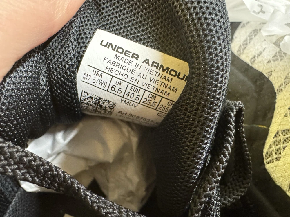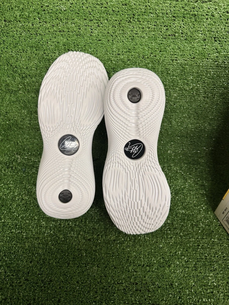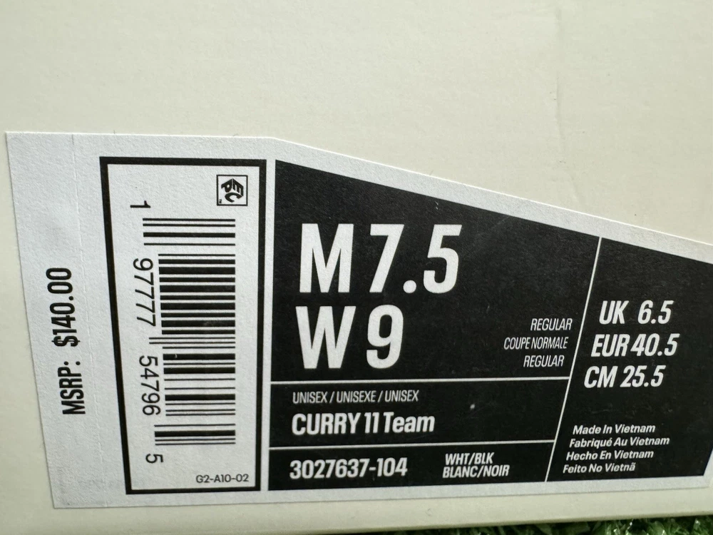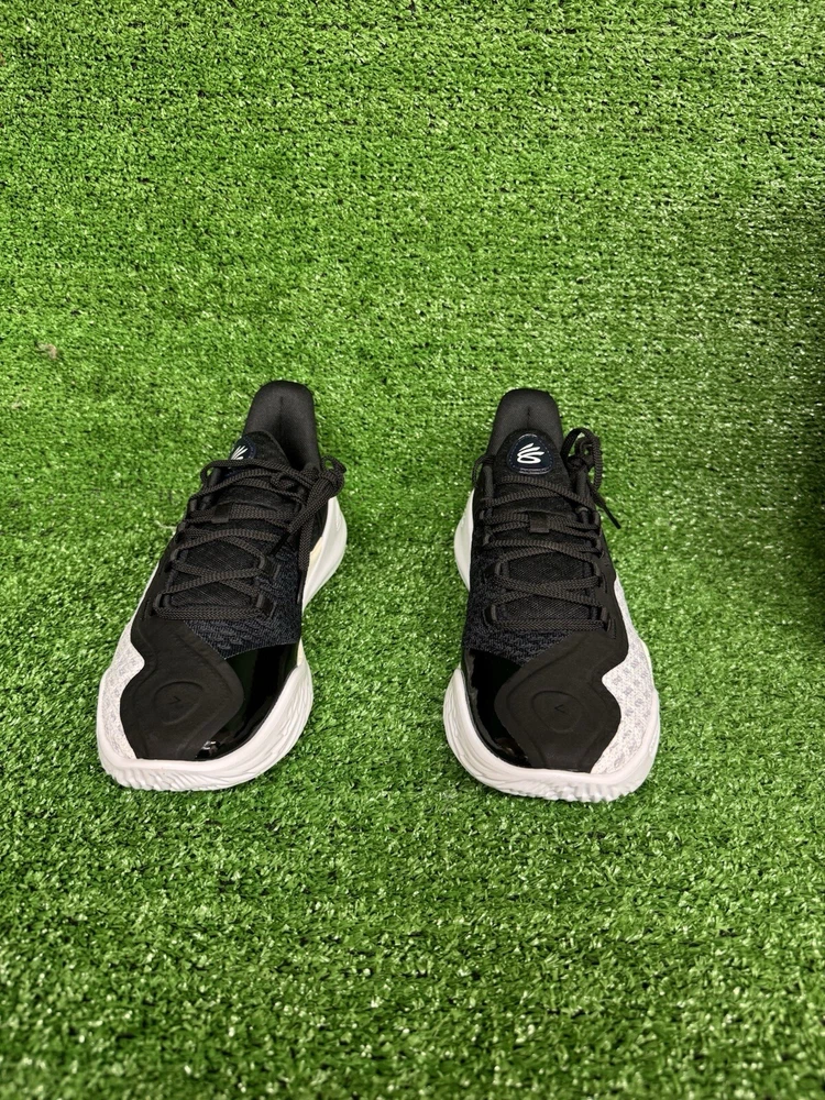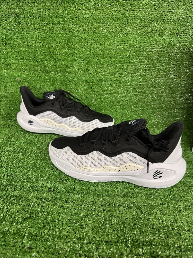 Under Armour Curry 11 Team basketball shoes in white/black, featuring lace-up closure, a low-top shoe shaft style, and a durable UA Flow outsole. The shoes are designed for men in size 7.5 (US) or 6.5 (UK), with a medium width. They include internal midfoot shank, molded sockliner, and external 3D-molded TPU for support and stability. The shoes are part of the Curry product line and have a solid pattern, making them a stylish choice for basketball enthusiasts. SKU: E5 DATE: 1/2/25 LISTED BY: SK, LH CONDITION: NWB SIZE/SHADE: 7.5/ Black