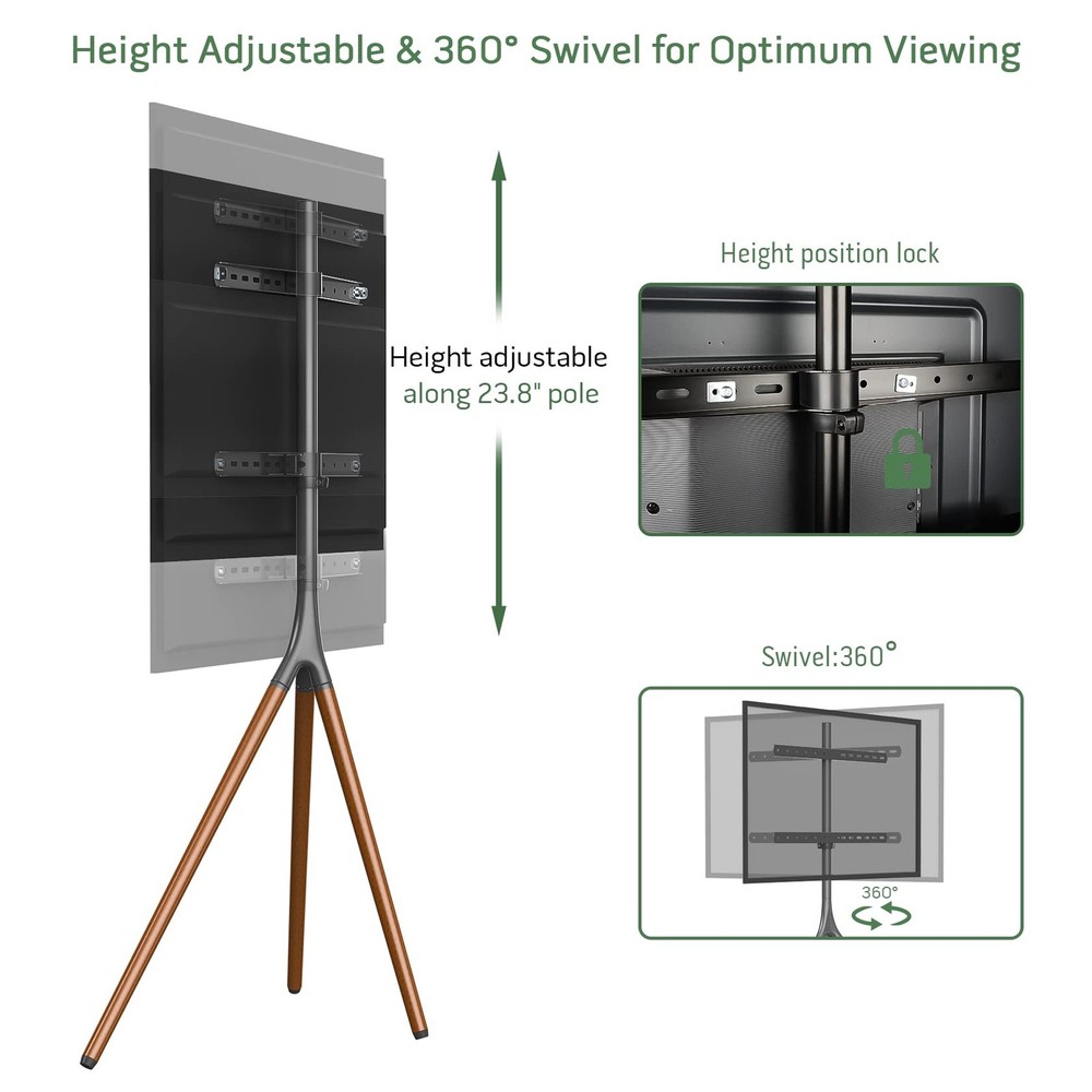 📝 Product Description Wide TV Compatibility: UPGRAVITY easel TV stand fits most 45" 50" 55" 60" 65" LCD LED flat screens weighing up to 77 lbs with VESA patterns 200x200mm, 300x200mm, 300x300mm, 400x200mm, 400x300mm, 400x400mm and 600x400mm. Please confirm the VESA, weight, size specification of your TV before purchasing,Swivel & Height Adjustable: The TV tripod stand features 180°swivel left and right to help you find the optimal viewing angle for all types of TV screen panels. Height adjustment is also provided along the 23.8" center pole by locking the height collar at your desired position,Secure & Stable: Constructed of high quality beechwood with solid tripod legs, this modern TV stand is quite steady and durable. It also comes with anti-tip strap kit to avoid toppling in case of unexpected bump. Anti-scratch rubber feet are designed to protect your carpet and floor,Minimalist, Sleek Design: The low profile TV stand tripod blends well in any room for a cool minimalistic look. Thanks to its chic, slim design, this TV display stand is portable and space-saving, perfect for small apartments, bedroom, living room, patio, office, studio, exhibition hall and more,Easy to Install: Assembly is easy with all the necessary hardware and fixings included in delivery. Cable straps are provided to help organize all the messy wires and cables behind the tripod leg for a neat appearance 📋 Specifications color Black model cg-1964 style modern material Wood itemWeight 13.05 pounds partNumber cg-1964 manufacturer UPGRAVITY productDimensions 10.0 x 5.2 x 35.0 inches ✓ Fast Shipping | ✓ Quality Guaranteed | ✓ Customer Support 30-Day Returns • 100% Satisfaction