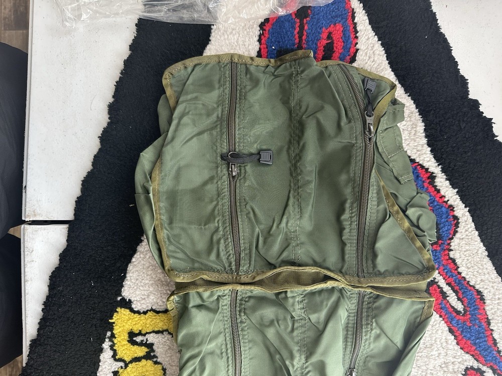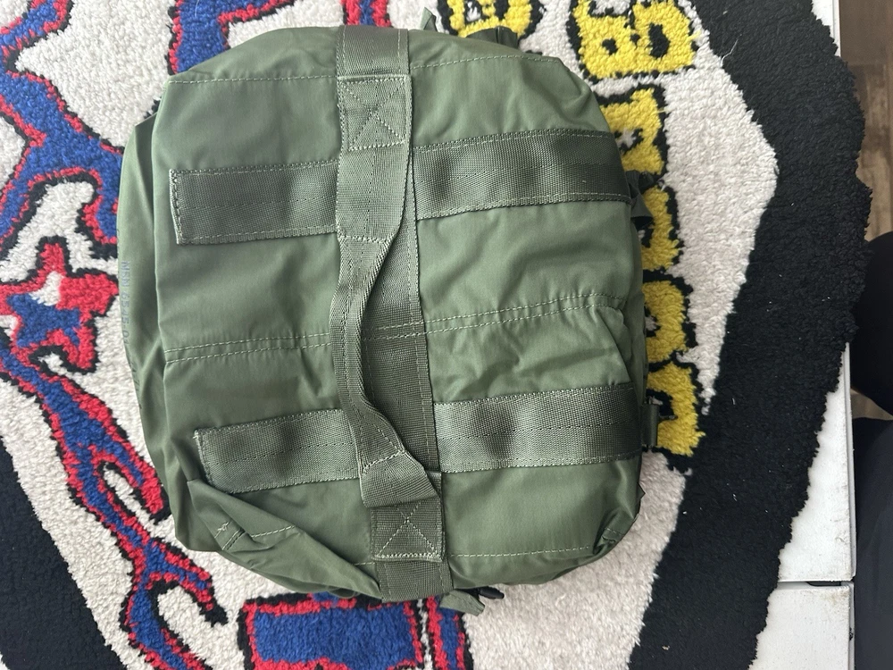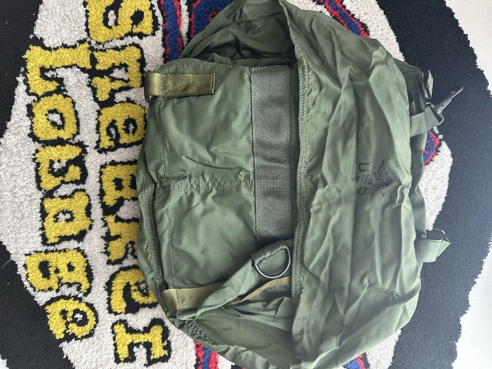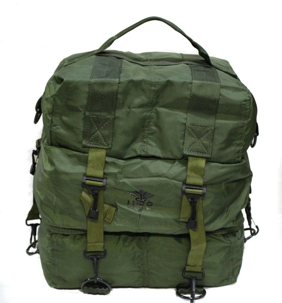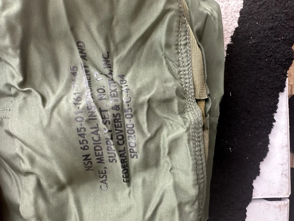 The product is a vintage U.S. Army medical supply case bag in OD green, perfect for creating a military surplus bugout bag. Made in the USA by a military brand, this bag is ideal for collectors of militaria items. The authentic design and theme make it a unique and historically significant piece for enthusiasts of military memorabilia.