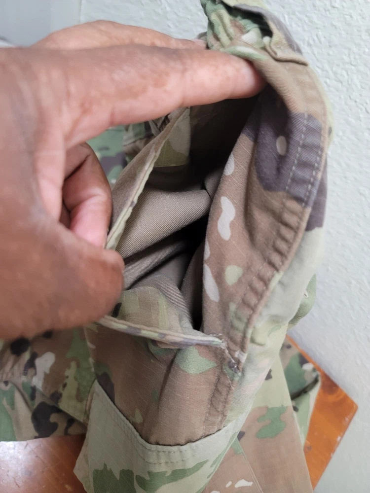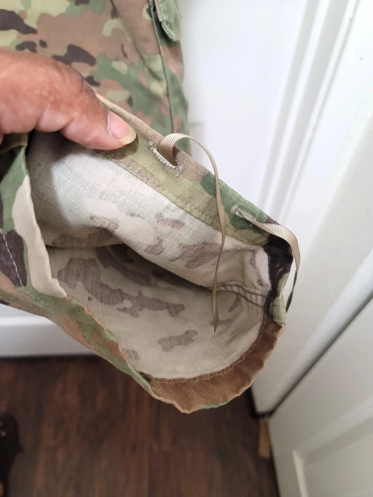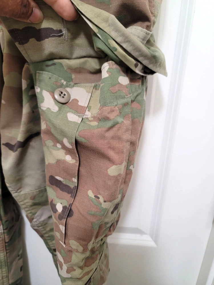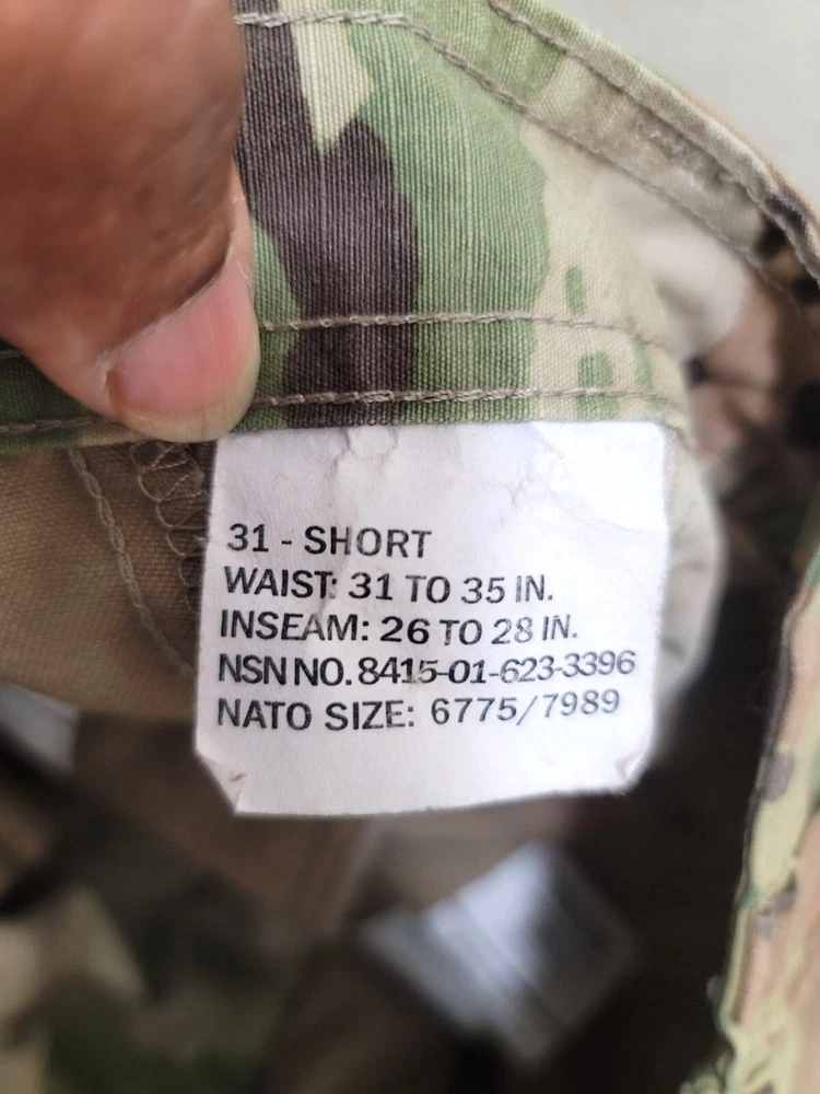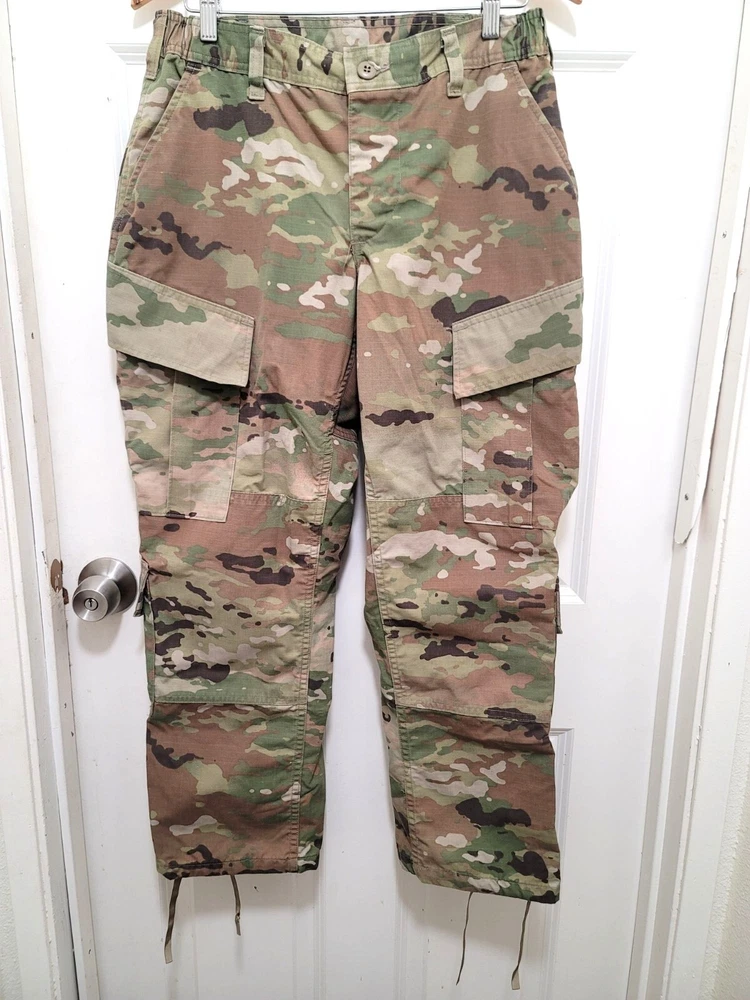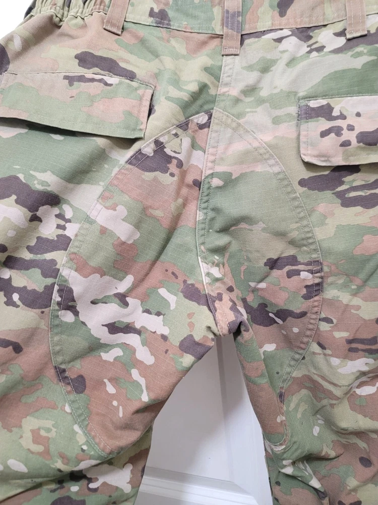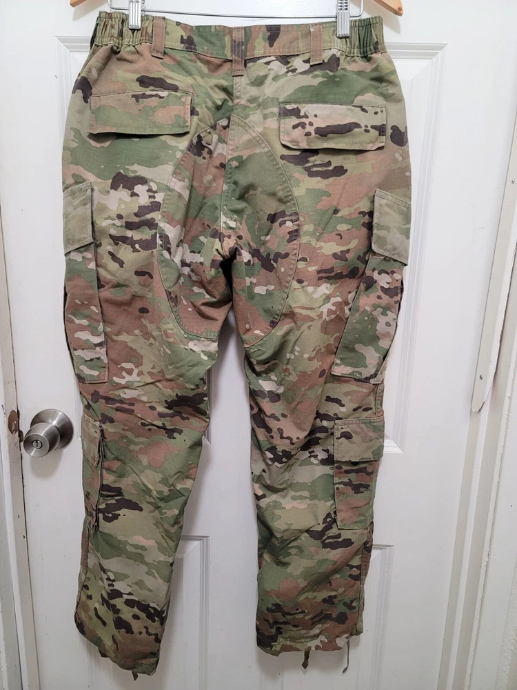 These tactical cargo pants offer durability and functionality for demanding environments. Designed with multiple pockets, they provide ample storage. Reinforced for strength, they are ideal for outdoor activities. • Camouflage pattern • Cargo pockets • Reinforced knees • Button fly • Adjustable waist • Drawstring ankles • Breathable fabric Waist = 34 inches Inseam = 30 inches CONDITIONS use, no visible flaws, good condition see photo for more details.