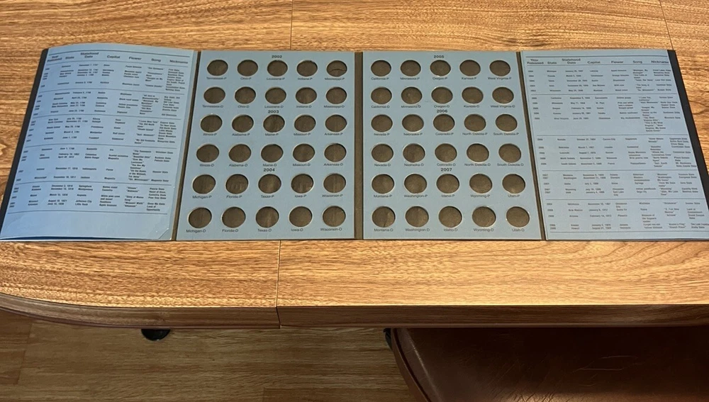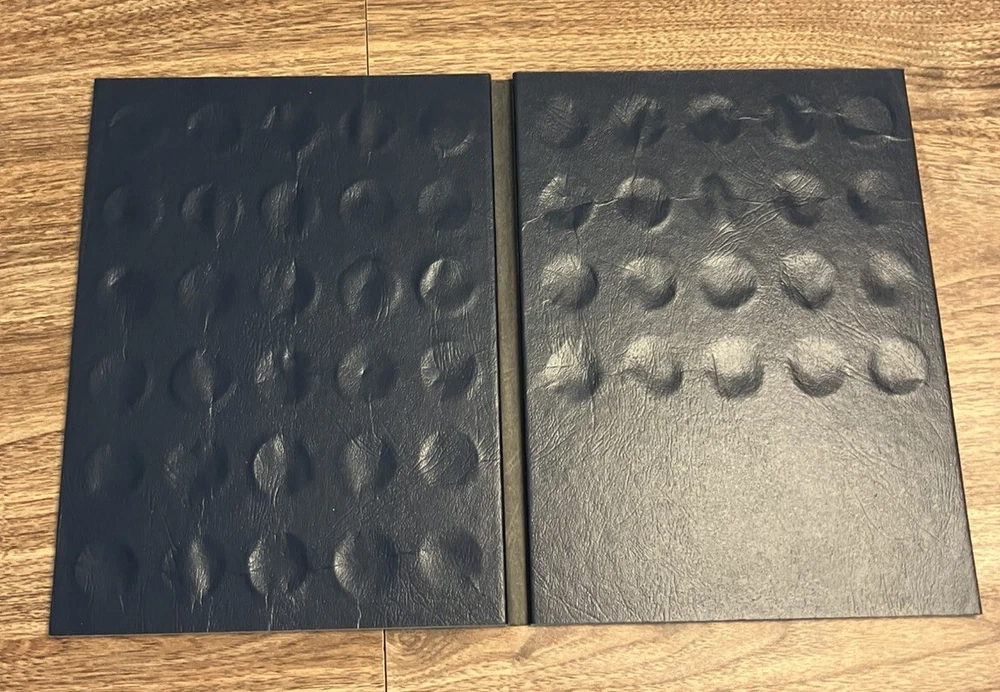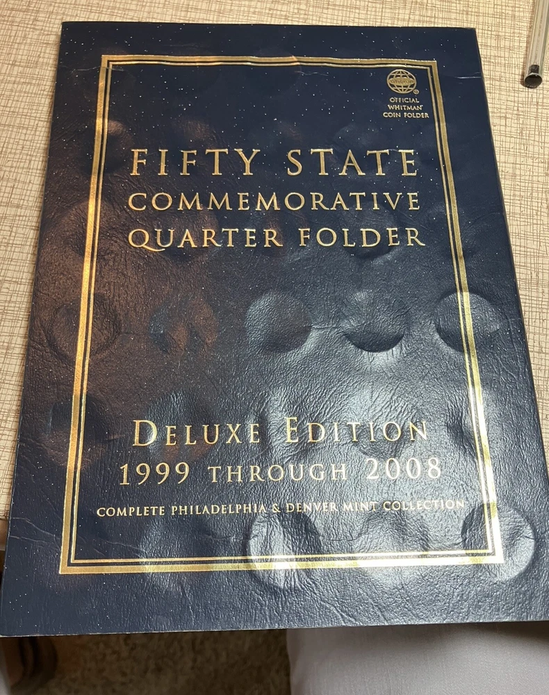 US Fifty State Commemorative Quarter Folder Deluxe Edition 1999-2008 Complete One must be very careful where you store the book. The quarter holes can be damaged when empty. Please see the last 4 pictures. Mississippi-P has the slash on the front cover and Minnesota-D has a bad dent from the back cover. Have questions, please write. Shipped USPS Ground advantage