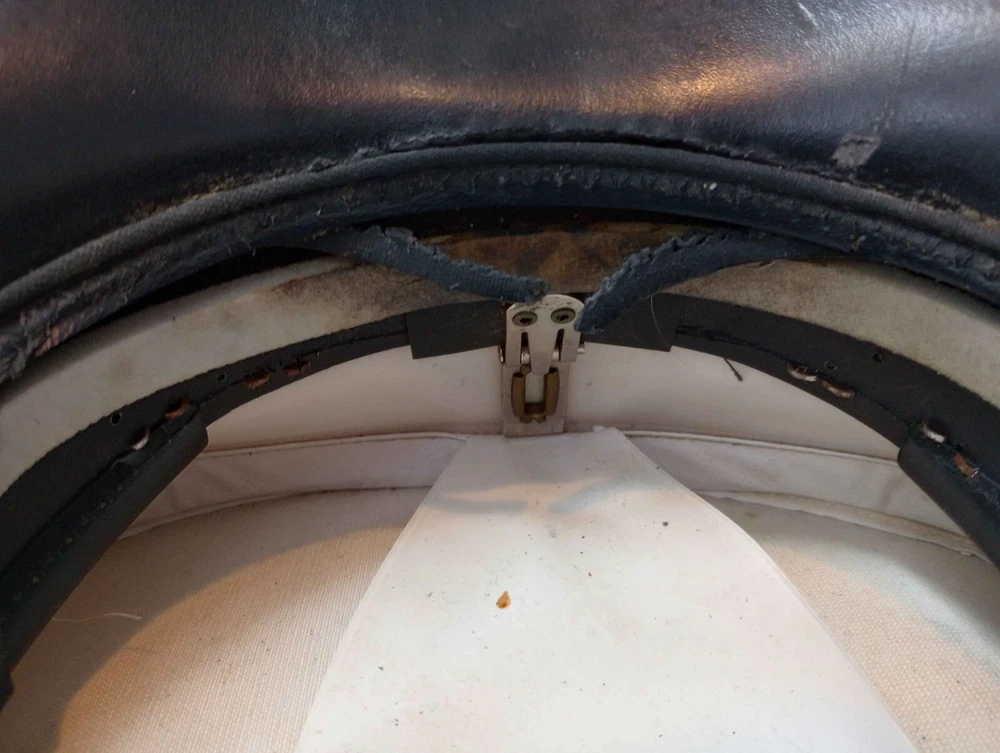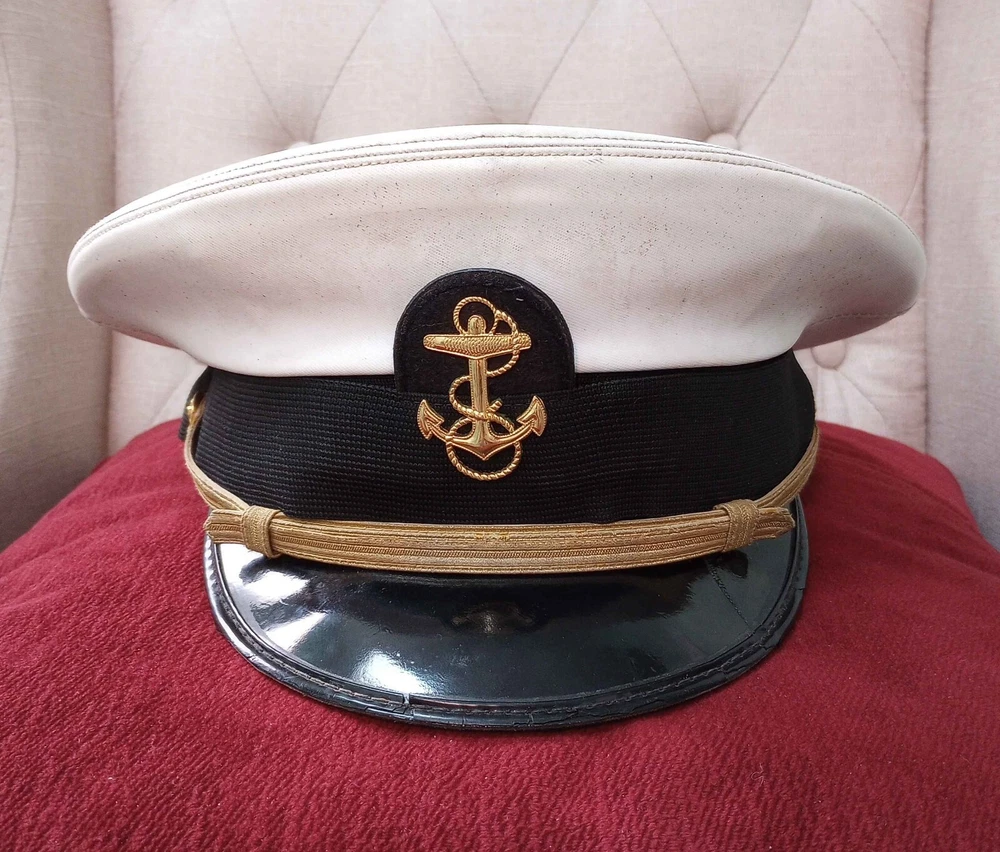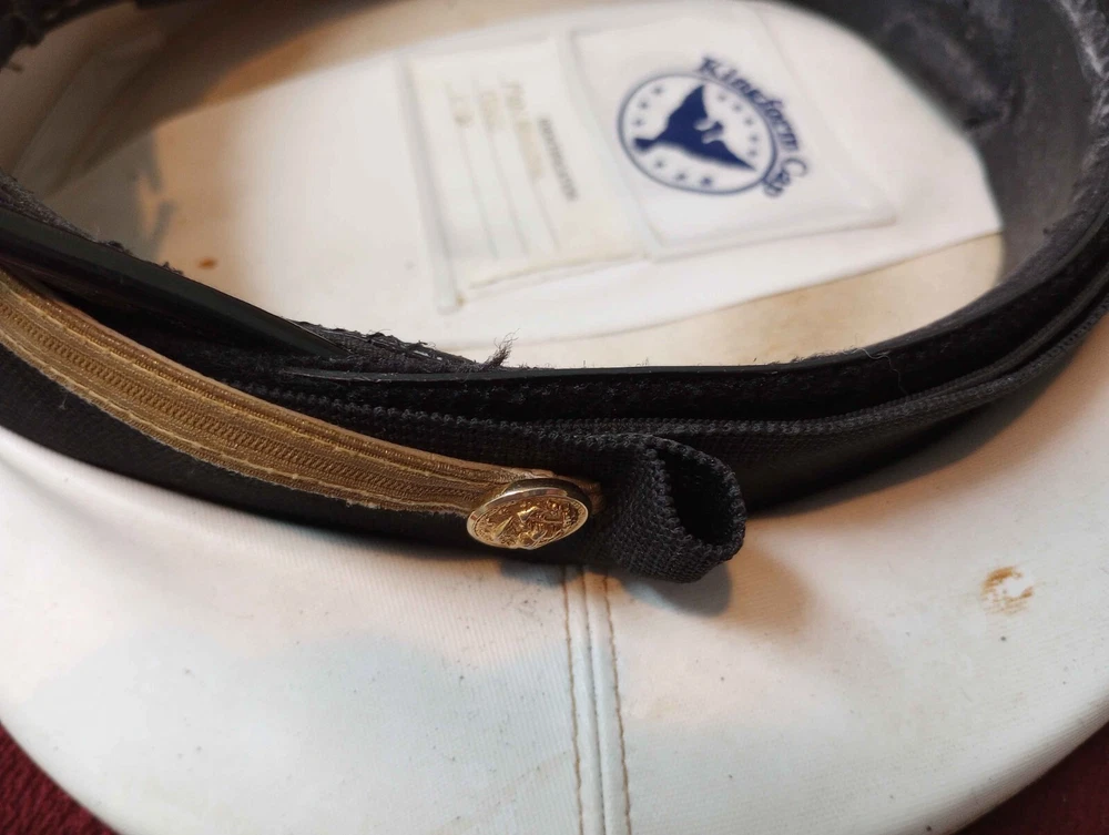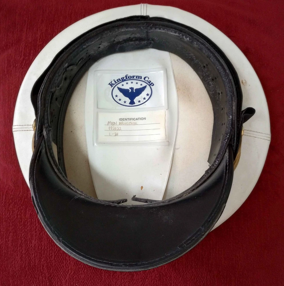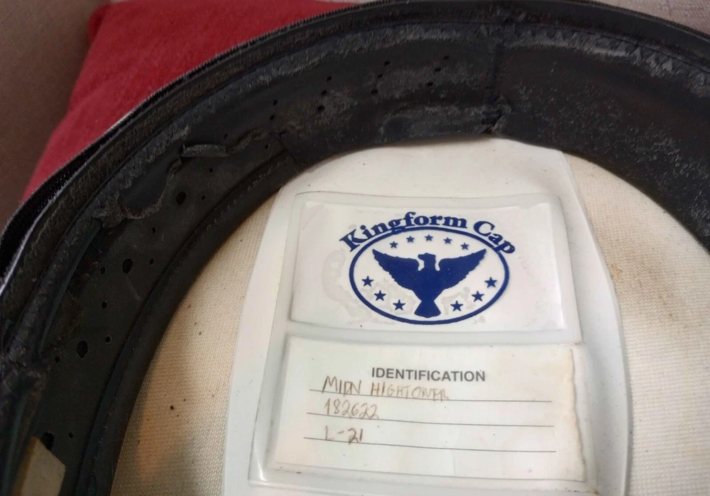 Measurements: 7-1/4 (22-3/4" / 58cm) Medium Poor condition. Parts of sweatband degraded and missing. D egradation on visor rim. Band was over-stretched and has been repaired by folding. Includes chin strap, device and buttons. No size stamp nor manufacturers date. Identification tag below label marked 'Midn (Midshipman) Hightower, 182622, L-21'. Manufactured by Kingform Cap Co , USA. Likely 1990's.
