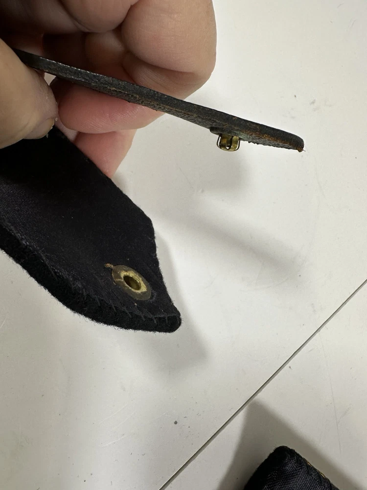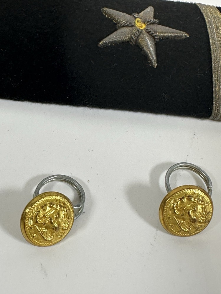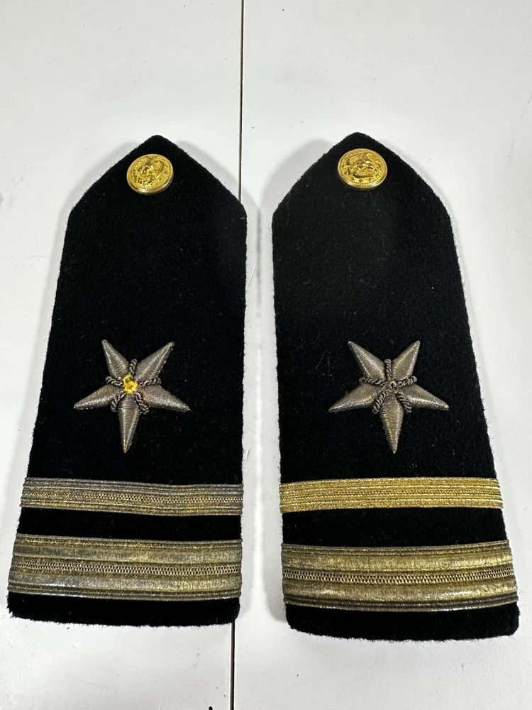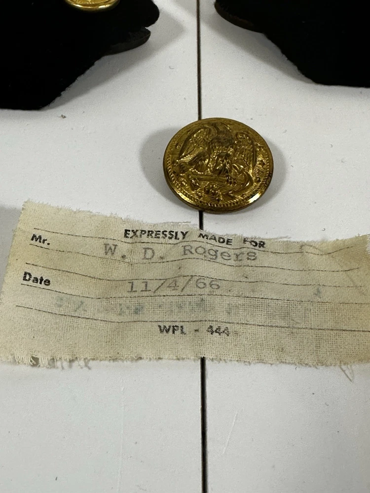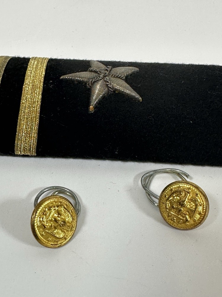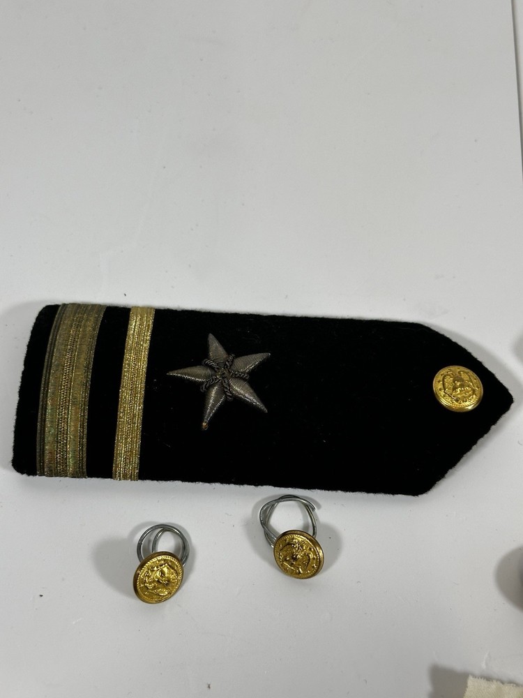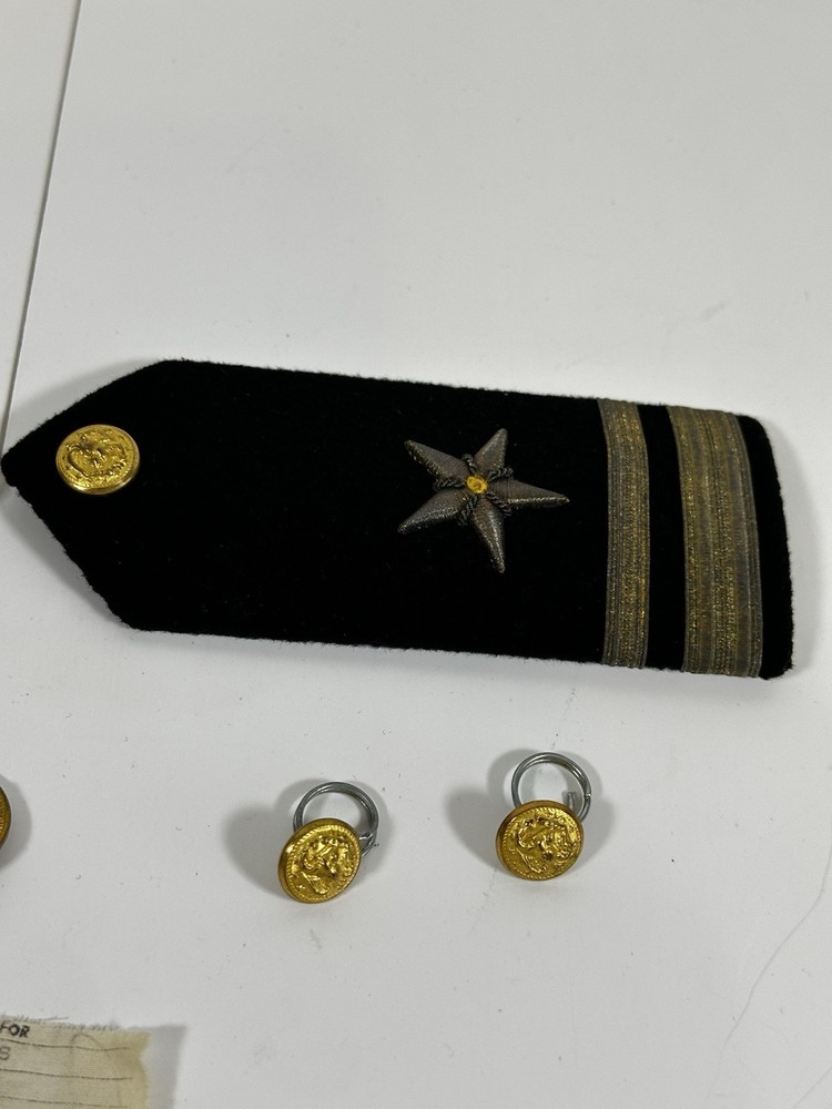 For sale pre-owned and vintage military insignia made for the US Navy in the 1960s. This insignia came from a khaki-colored Navy jacket. There are eight pieces in this bundle. This jacket was issued to the navy officer on November 4, 1966. Following items included in the bundle: 2 shoulder devices which bear the Lt. Junior Grade rank and the line officer star. 4 gold tone buttons which came off of pockets 1 gold tone button that was used to button the jacket up 1 label that was sewn into the jacket at time of manufacturing