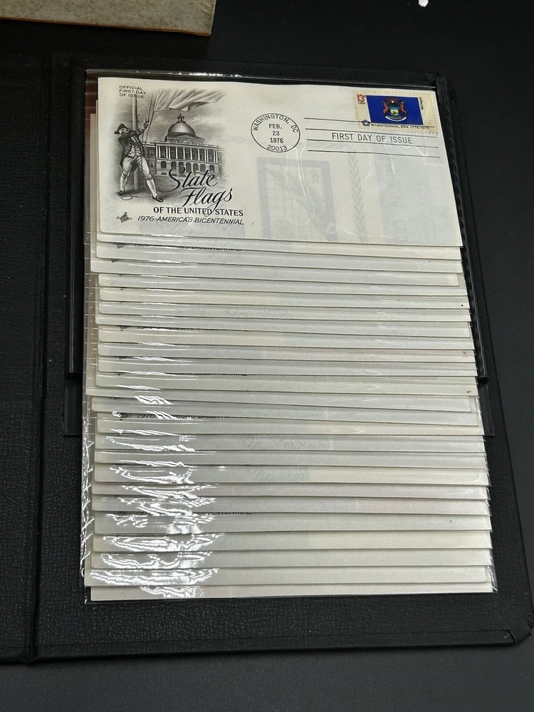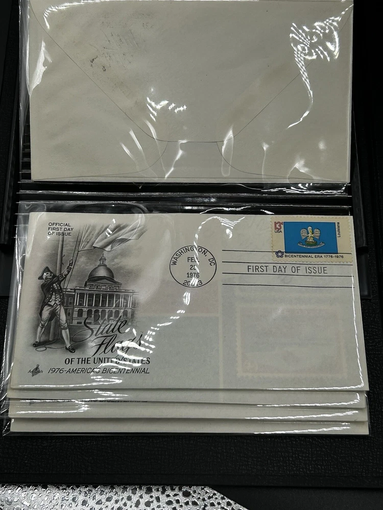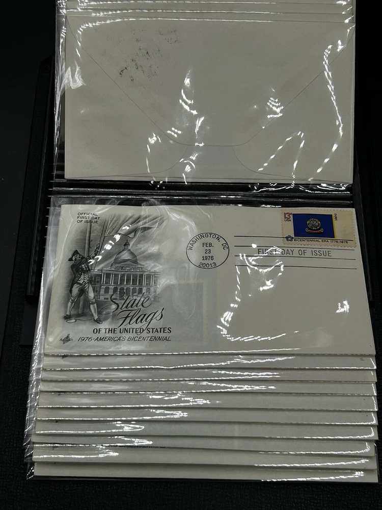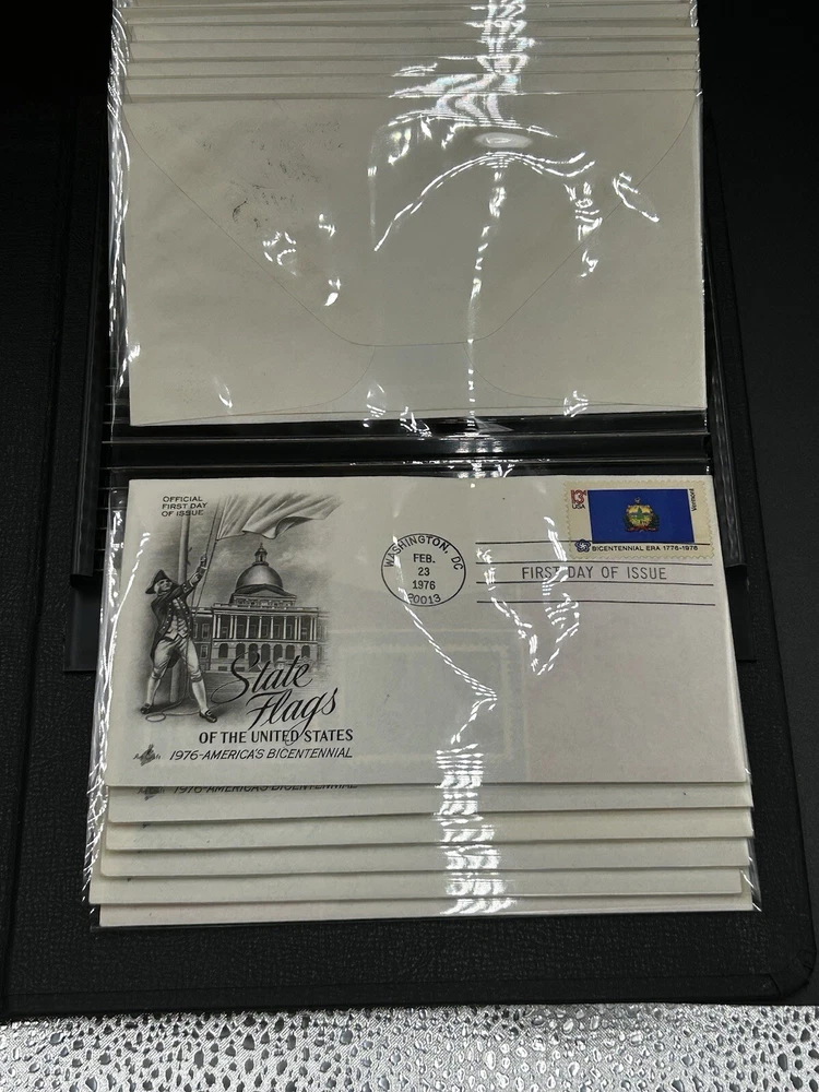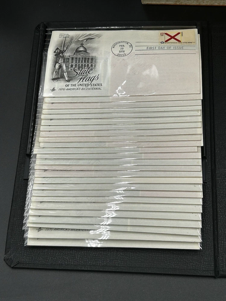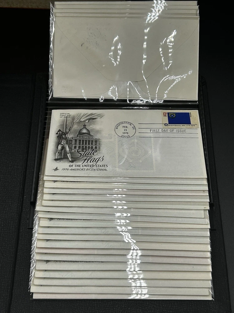 This album of First Day Covers from 1976 features flags and national emblems of all the states in the United States. The covers are canceled with the First Day of Issue cancellation type and are ungraded. The denomination of the stamps on the covers is 13 cents and they are of multi-color. The album is a great addition to any collection for anyone interested in collecting stamps and covers from the United States.