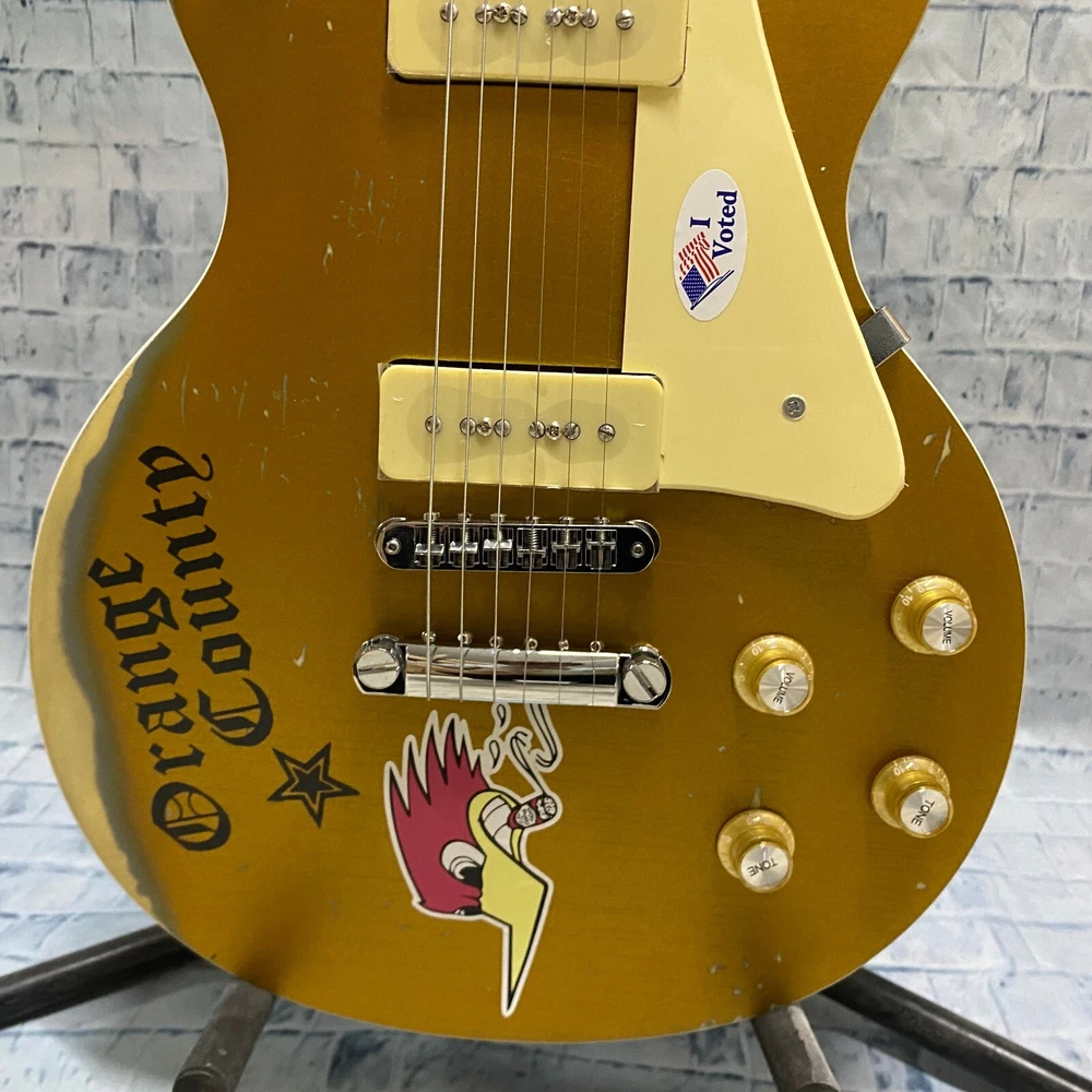 This is a US WAREHOUSE Mike Ness 1976 Deluxe electric guitar in Aged Gold Relics finish. It has a solid Mahogany body and neck, with a Rosewood fretboard and 22 frets. This right-handed guitar features a 6-string configuration and comes with a cable. The model year is 2024 and it is part of the Standard series, suitable for professional level performance. Made in China, this Custom model is a high-quality electric guitar for musicians.
