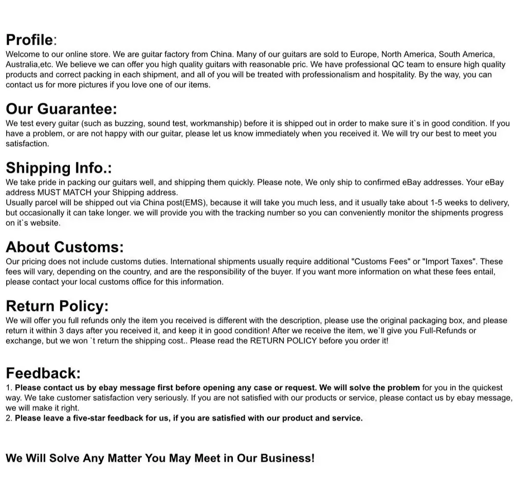 Welcome Here welcome to our shop. We guarantee that you will get what you see and hear, and will be treated professionally and enthusiastically. We are a professional guitar manufacturer and can provide you with the best services and products. If you need more help, please let us know and we will try our best to solve it for you and give you a pleasant shopping experience. If you like one of our products, we will provide you with a detailed answer. Please be assured that we can provide you with high-quality guitars at reasonable prices. ABOUT THE PICTURES The pictures are taken in our factories by ourselves. Each guitar is different from others because of the light in room or some other reasons .So there are maybe some differences between the pictures and the guitar you get. Every guitar cannot be the same in 100%, the pictures of the guitar that you see is just one of them. If you want some details about the guitar, please contact me. OUR GUARANTEE We test every guitar is in good condition before it is shipped out. When you receive the guitar, if you meet some problems (such as buzzing, sound test, workmanship) or you are not happy with our guitar, please let me know immediately and we will try our best to meet you satisfaction. FEEDBACK Communication is the best way to solve problems. If you have any questions or dissatisfied items to buy, please contact us before submit neutral or negative feedback, we will help you solve the problem as soon as possible until you are satisfied. Qualified transactions worthy of positive feedback from each other. When you are satisfied with your purchase, we sincerely hope that you can provide us with positive feedback. After everything is completed, we will immediately leave positive feedback for you. RETURN POLICY What should I do if there is a problem? If your order has a problem, you first have to send a message to your sales engineer. Anyway, he or she will take care of you. Our unique policy is that we will solve all the costs of all costs and let you be satisfied. What should I do if I receive a defective product? When you receive the product damage or defective product, send us the photo to verify, then we will provide you with a full refund, please return them within 3 days, and keep the same state when we send it, After we receive the project, we will provide you with a full refund or reissue. How to return the item? If the product you receive is not up to your expectation, I am sorry, the project must return to the state of receiving it, including all accessories, files, and packaging materials. Please use a traceable delivery method, such as federal express or UPS or USPS We recommend that you buy your own transport label and assure your package when you send us back. Sometimes things will be damaged during the way. If this happens, we hope that you will be protected. ( If you buy a finished product such as guitar, there is no quality problem after you receive the product, we will not pay the return shipping. If you want to replace it, we can send you new, if it is due to the quality of accessories, we can send your parts for free. ) Thank you very much for your coming our store, wish you have a good shopping !