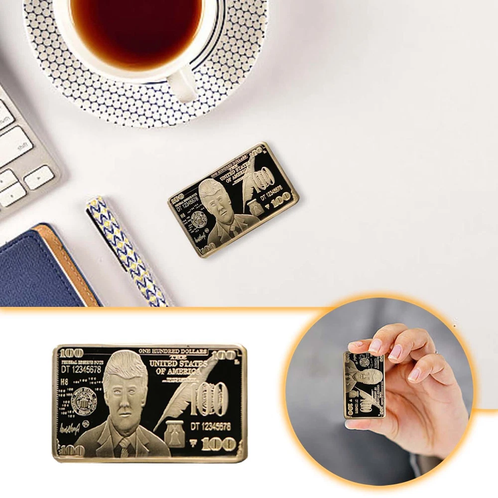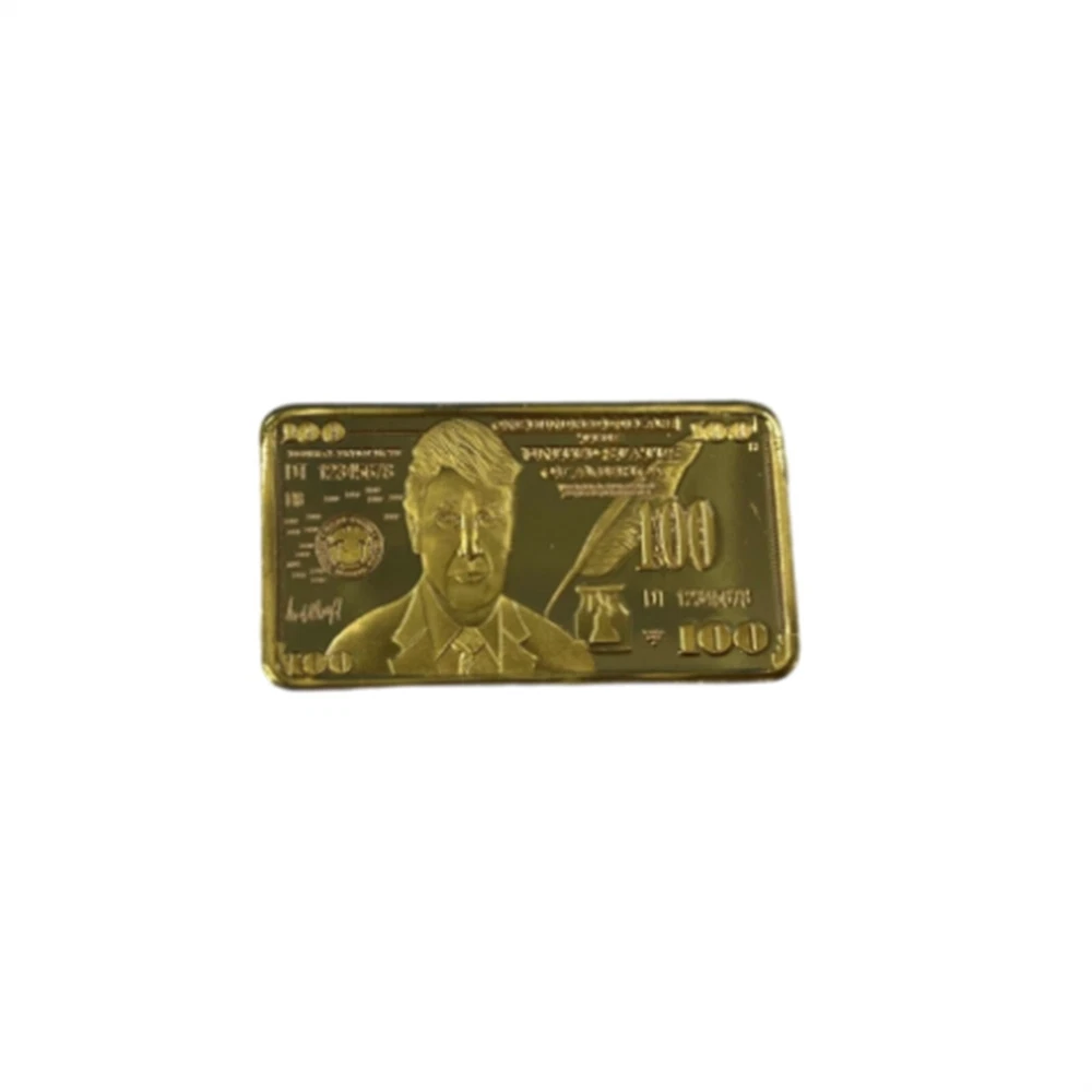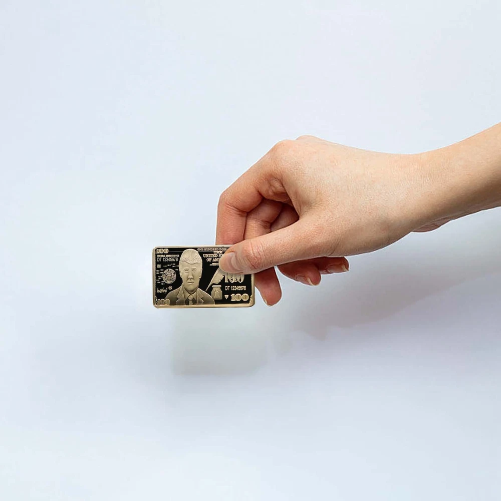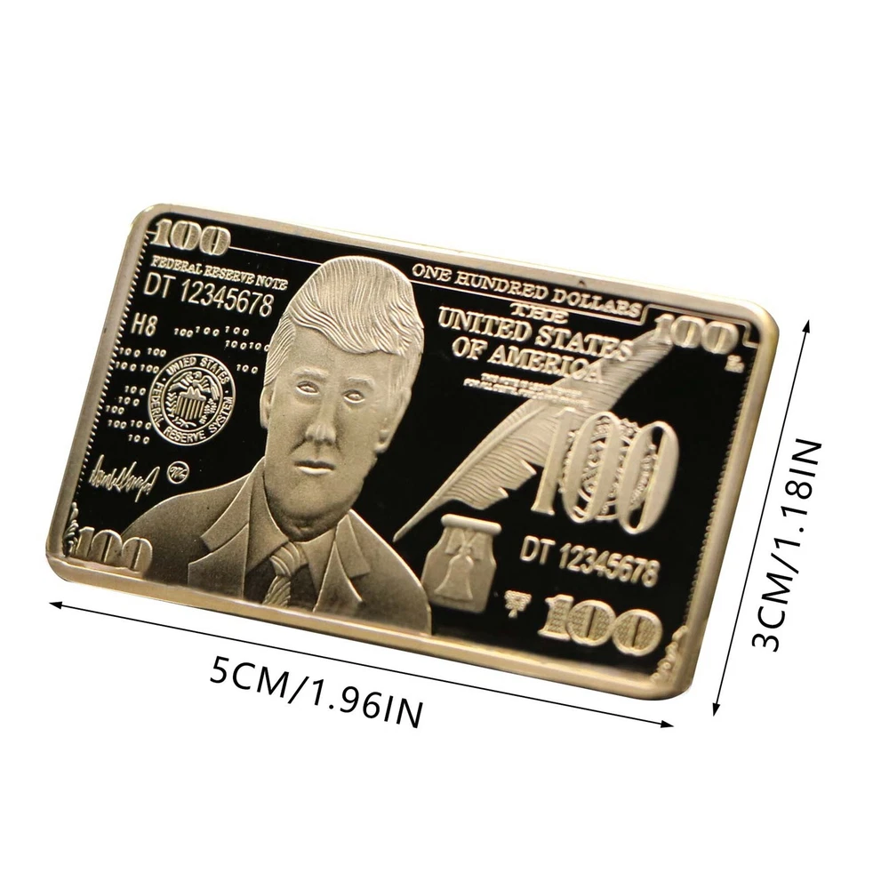 USA 2024 President Donald Trump $100 Gold Colored Commemorative Bar Collectible Features: Material:gold color. Size: 5 x8 x 3 cm. Weight: approx. 40g. Crafted with exquisite workmanship, it is a perfect accessory for your collection It is a great gift for your friends or family members. package: 2 pieces packed with premium capsule and opp bag Product Description: $100 Gold Colored Commemorative Bar Collectible Souvenir Material: Color: as the picture shows, (Due to the difference between different monitors, the picture may have slight color difference. please make sure you do not mind before ordering, Thank you!) Package weight: 80g Package size: 4x2x2cm,(Please allow 1-3mm error due to manual measurement. please make sure you do not mind before ordering.)
