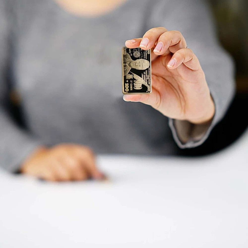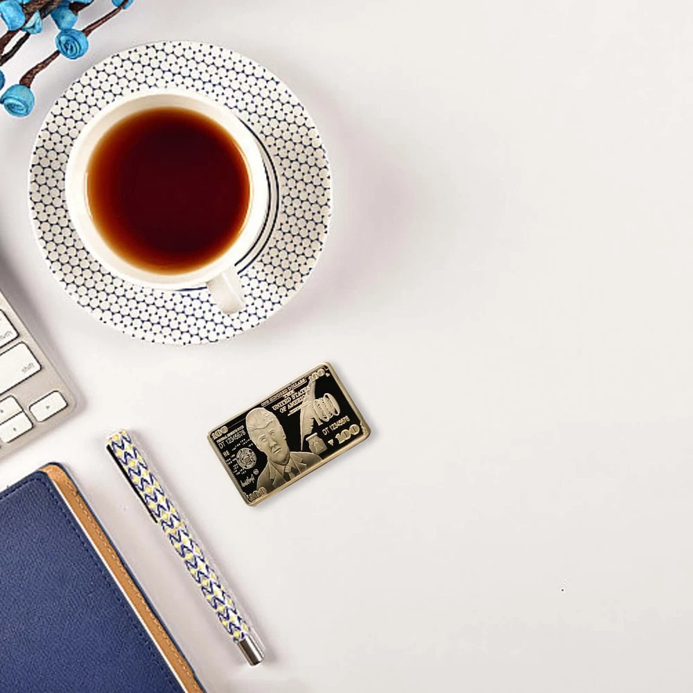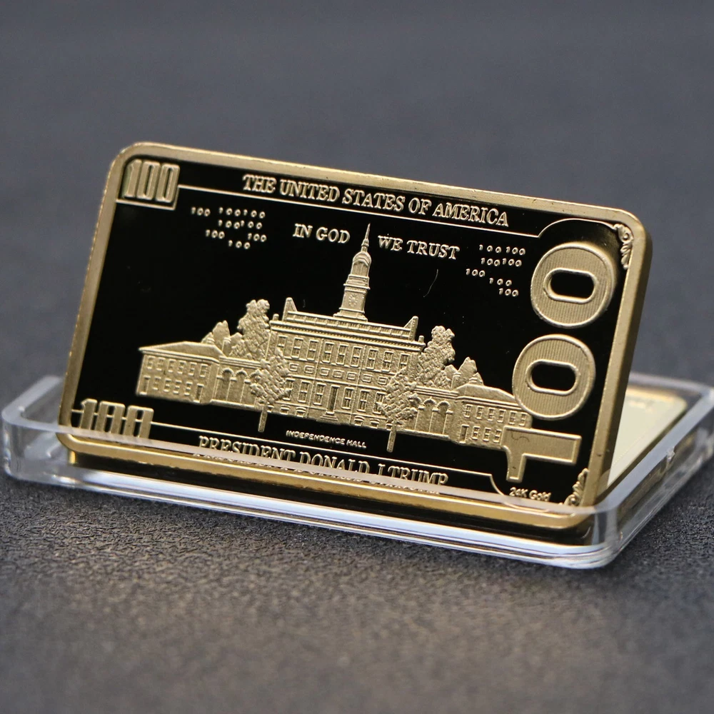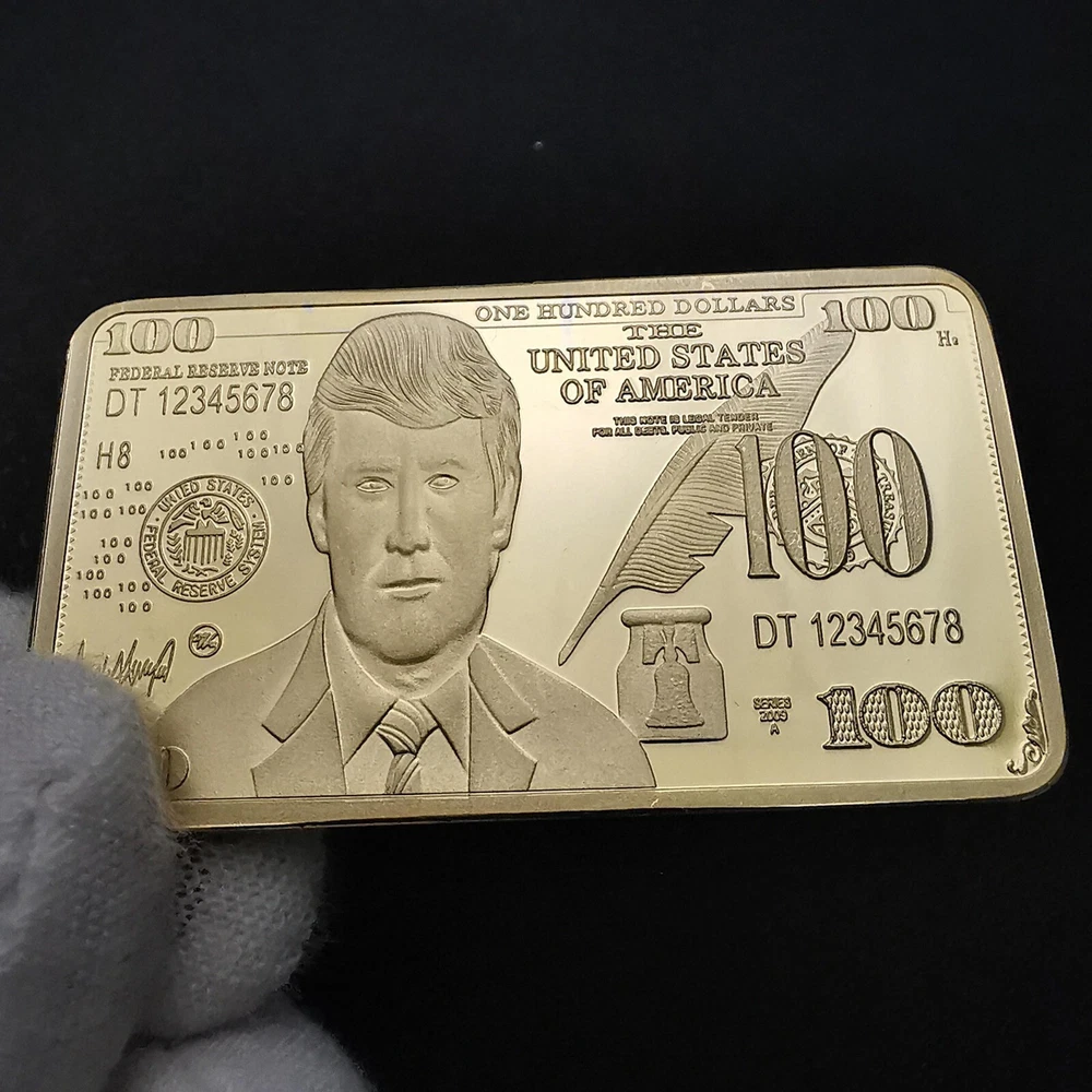 USA 2024 President Donald Trump $100 Gold Colored Commemorative Bar Collectible Features: Material:gold color. Size: 5 x8 x 3 cm. Weight: approx. 40g. Crafted with exquisite workmanship, it is a perfect accessory for your collection It is a great gift for your friends or family members. package: 2 pieces packed with premium capsule and opp bag Product Description: $100 Gold Colored Commemorative Bar Collectible Souvenir Material: Color: as the picture shows, (Due to the difference between different monitors, the picture may have slight color difference. please make sure you do not mind before ordering, Thank you!) Package weight: 80g Package size: 4x2x2cm,(Please allow 1-3mm error due to manual measurement. please make sure you do not mind before ordering.)