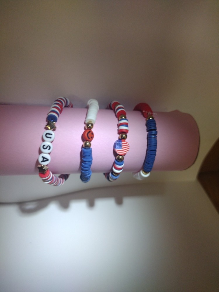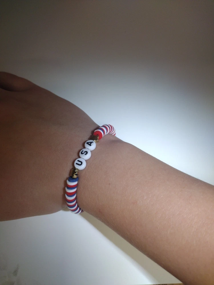 These USA flag themed clay bead bracelets are handmade in the United States, making them a unique and patriotic accessory for kids on fourth of July day! The beaded style and stackable feature add versatility to the design, allowing for personalized style. With a charm type of bead and no stone as the main stone, these bracelets are perfect for those looking for an inspirational or awareness-driven piece of jewelry. Made from clay beads these bracelets offer a natural and meaningful addition to any jewelry collection.