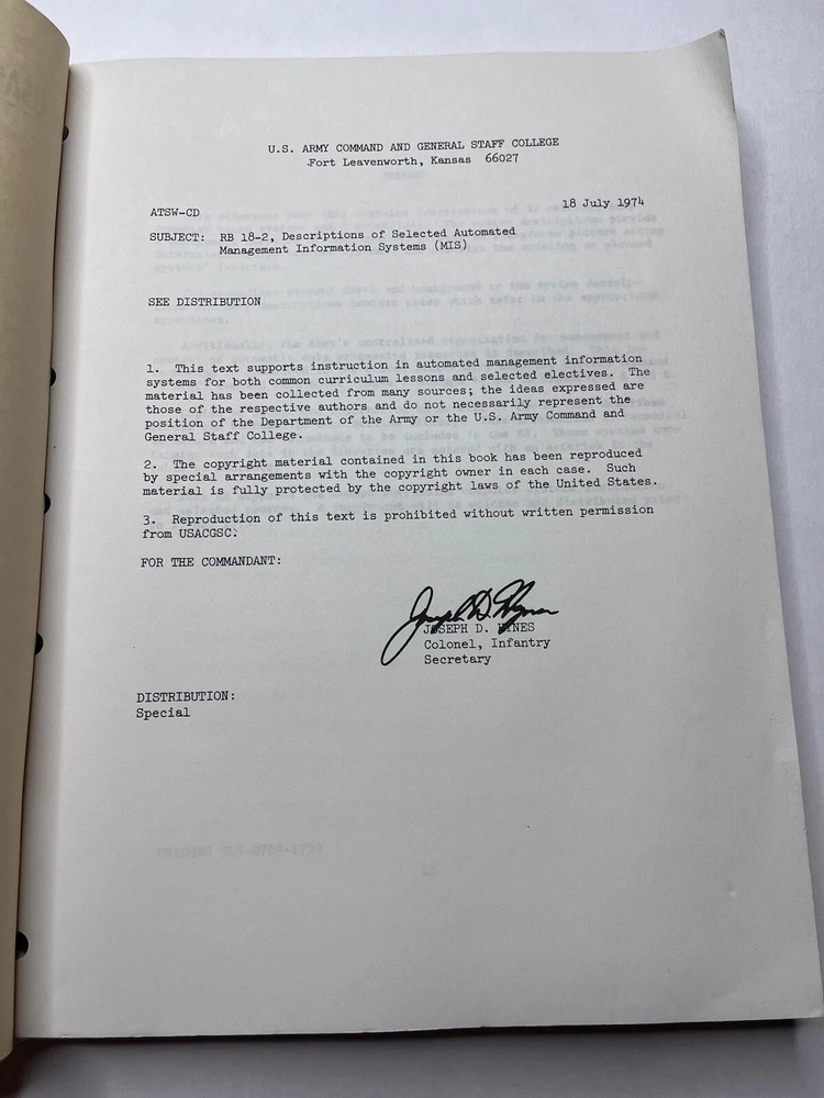 May contain wear consistent with age and use. Selected automated Management Information Systems RB 18-2, 1974 Fort Leavenworth