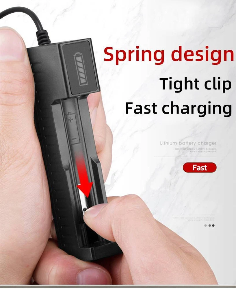 USB 1-Slot Smart Battery Charger for 16340 26650 Rechargeable Lithium Batteries Features: 1. With adjustable electrode, this single slot portable battery charger can charge many types of batteries. 2. This lithium polymer battery charger contains current and Vmax detection program to prevent your batteries from overcharging. 3. Using a usb port to charge,you can charge your batteries in the office using your computer or use a battery bank to charge while you on metro. 4. When you load the battery reverse or load a short-circuited,the battery chager won't work, keep you from possible danger. 5. Small size and light weight, the 18*65*O single slot battery charger can be put in your bag, pant pocket. 6. Intelligent IC control, output short circuit, anti-reverse protection The LED light is red when charging , it is green when full charged or empty . Specifications: Power Supply mode: USB DC5V Input Voltage: DC 5V 1-2A Output Voltage: DC 4.2V 500mA Product Size: 106*27*23mm/4.17*1.06*0.91" Compatible battery: 10440/14500/16340/16650/14650/18350/18500/18*65*O/26650 etc Package Includes: 10x Li-ion Lithium Smart Battery Charger 1-Slot On Jan 6, 2025 at 06:11:25 PST, seller added the following information: