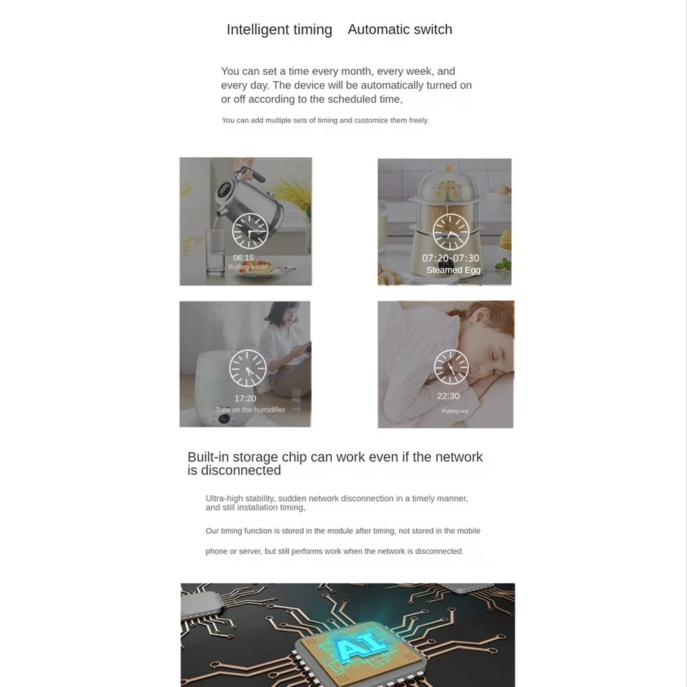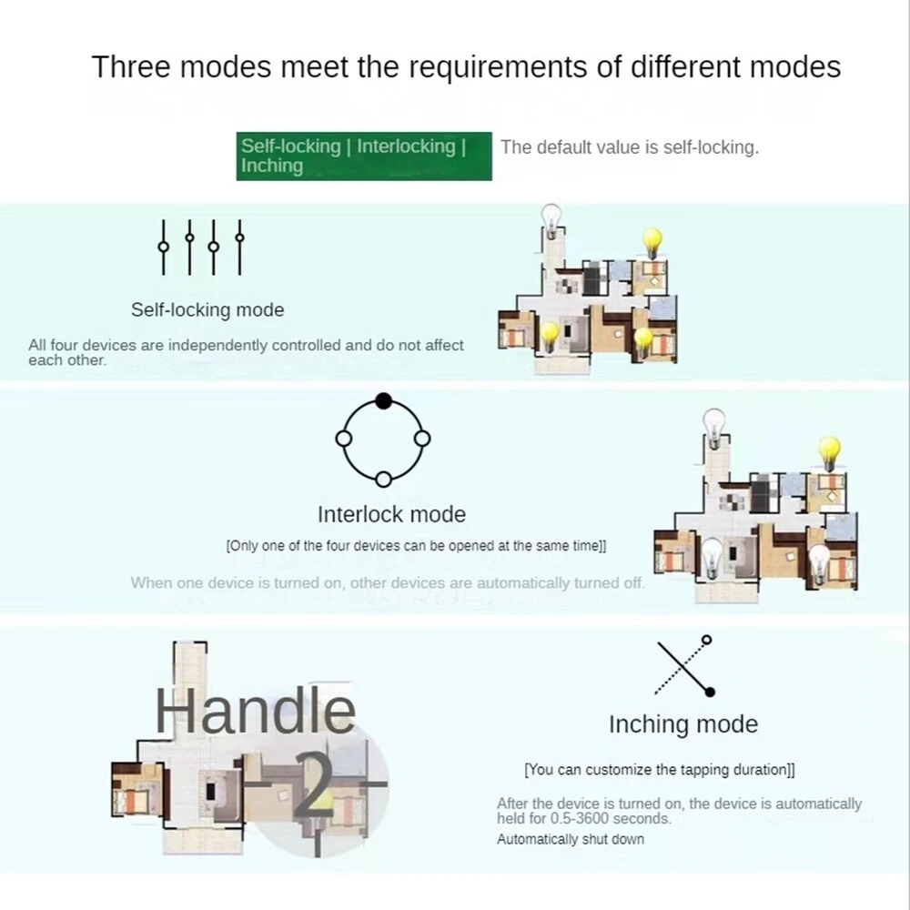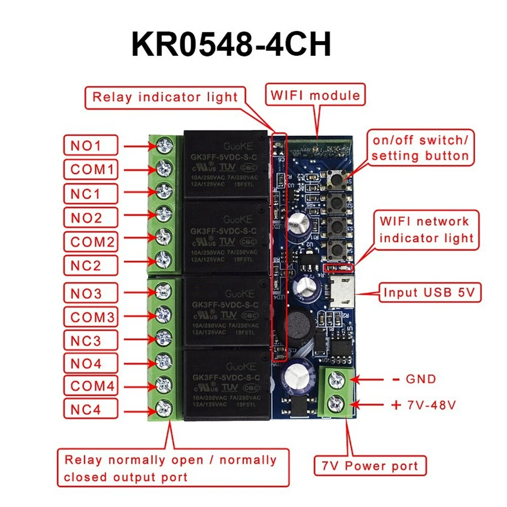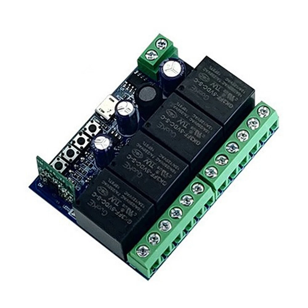 USB 5V DC7-48V für Wifi Switch Universal-Relaismodul 4CH Switch T6060 {LIS_PIC} Idiotisches WLAN-Steuermodul, keine Programmierung erforderlich, nur eine APP herunterladen, WLAN verbinden, um die integrierte Cloud zu steuern. Solange das Modul mit WLAN verbunden ist, kann das Handy überall im Land gesteuert werden. Arbeitsmodus: Dieses Produkt ist ein drahtloser Schalter, der momentane (Tippen) / selbstverriegelnde / verriegelte Arbeitsmodi unterstützt. Benutzer können das Gerät zur APP für hinzufügen, um angeschlossene Haushaltsgeräte oder Stromkreise fernzusteuern. Hinweis: Die Relais sind Schalter ohne Ausgang, der Stromversorgungseingang (AC/DC) nur für die PCBA. Tippen Sie manuell auf die Arbeitsmodus-Einstelltaste, das Produkt kann den Arbeitsmodus ändern. Im Tippmodus können Sie zwischen Verdrahtungsmethoden wählen: -1s einschalten und dann automatisch ausschalten -1s ausschalten und dann automatisch einschalten. Im Selbstsperrmodus können Sie angeschlossene Geräte aus der Ferne ein- und ausschalten. Im Interlock- (nur 2-Gang- und 4-Gang-Unterstützung) können Sie AC/DC-Motoren fernsteuern. Das Produkt ermöglicht die Fernsteuerung von Haushaltsgeräten über die mobile Anwendung für , die sowohl für Android als auch für iOS verfügbar ist. Funktionen des Moduls: 1.Standard-Jog-Funktion: Das Telefon wird zum Öffnen gedrückt, das Relais wird schnell geschlossen (das Standardintervall ist 1S) und es wird getrennt, und es hat auch die Funktion des Timing-Sharings 2. Drücken Sie die Selbstverriegelungs-Auswahltaste und das Statuslicht leuchtet. Zu diesem Zeitpunkt ist es selbstverriegelnd. Das Mobiltelefon drückt, um das Relais zu öffnen, um es einzuziehen, und drücken Sie, um das Relais zu schließen, um es zu trennen. Betriebsspannung: USB 5V/DC7-48V Micro-USB-Port-Stromversorgung ist bequemer Spannung der gesteuerten Geräte: DC7-48V Unterstützt die Steuerung verschiedener Spannungsbereiche Kontrollleuchte: mit Signalkontrollleuchte, Relai