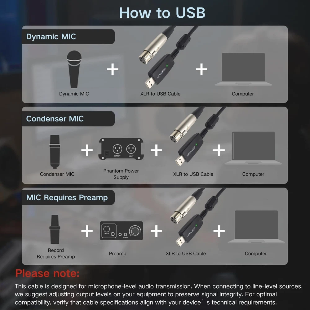 XLR to USB Cable for Microphones, 48V Phantom Power Required for Condenser Microphones, Plug-and-Play Audio Adapter with Built-in DAC for Podcasting Recording Streaming and Karaoke, 10 Feet 🎙️ Plug-and-Play Simplicity: Connect your XLR microphone to any USB device with ease. Designed for dynamic microphones, the XLR to USB Cable is truly plug-and-play. For condenser microphones, please use an external 48V phantom power supply to ensure proper functionality. Perfect for podcasting, streaming, and music recording. 🎧 Studio-Grade Audio with Built-in DAC: Featuring a premium 16-bit/48kHz DAC chip, this cable ensures low-noise, high-fidelity audio for studio-quality recordings. Experience clear and natural sound, whether you’re recording vocals, instruments, or podcasts. 🛠️ Superior Durability for Everyday Use: Built to withstand the demands of daily use, this cable features 24K gold-plated connectors, a reinforced PVC jacket, and 20,000+ bend-tested durability. Trust it for years of reliable performance. 📱 Universal Compatibility: Compatible with Windows, macOS, and Linux, this cable integrates seamlessly with popular software like Audacity, GarageBand, and OBS Studio. It supports dynamic microphones and works perfectly with condenser microphones when paired with a 48V phantom power supply. 🔒 Lifetime and Peace of Mind: Backed by a lifetime and responsive customer service, the XLR to USB Cable ensures a worry-free recording experience. Create, stream, or record with confidence, knowing you’re supported every step of the way. 🎙️ Take Your Audio Setup to the Next Level The XLR to USB Cable bridges the gap between professional XLR microphones and USB-enabled devices, providing seamless connectivity for podcasters, musicians, streamers, and more. Whether you’re setting up a home studio or enhancing your live-streaming setup, this cable delivers studio-quality audio in a plug-and-play design. 🎧 Crystal-Clear Audio for Every Recording Equipped with a built-in 16-bit/48kHz DAC chip, this cable minimizes noise and distortion while preserving the full depth and clarity of your recordings. From rich vocal tones to detailed instrumental soundscapes, your audio will stand out with professional-grade fidelity. 🔌 Important Note for Condenser Microphones While this cable is plug-and-play for dynamic microphones, condenser microphones require an external 48V phantom power supply to function properly. This is a standard requirement for condenser microphones due to their power needs and not a limitation of the cable itself. Ensure you have a compatible phantom power supply for optimal performance. 🛠️ Built for Reliability and Versatility Designed for long-term use, the XLR to USB Cable features 24K gold-plated connectors for superior conductivity and corrosion resistance. Its reinforced PVC jacket ensures flexibility and durability, while its compact 6-foot length makes it ideal for both home and studio setups. 📱 Broad Compatibility for Maximum Flexibility Compatible with Windows, macOS, and Linux, this cable works effortlessly with most recording software, including Audacity, GarageBand, Pro Tools, and Zoom. Whether you’re recording your next podcast episode, streaming live, or capturing vocals in the studio, this cable has you covered. 🔒 A Lifetime of Confidence is committed to quality and reliability. With a lifetime and dedicated customer support, this cable is built to exceed expectations and support your audio needs for years to come. Shipping We offer FREE shipping on all orders! We ship within Three business days of payment, usually sooner. We use a selection of shipping services such as UPS, FedEx, USPS etc. We only ship to the lower 48 states, no APO/FPO addresses or PO Boxes allowed. Local pickups and combined shipping options are not provided at this time. Return You can return a product for up to 30 days from the date you purchased it. Any product you return must be in the same condition you received it and in the original packaging. Please keep the receipt. Payment We accept payment by any of the following methods: PayPal Please pay as soon as possible after winning an auction, as that will allow us to post your item to you sooner! Feedback Customer satisfaction is very important to us. If you have any problem with your order, please contact us and we will do our best to make you satisfied. Contact Us If you have any queries, please contact us via ebay. We usually respond within 24 hours on weekdays. Please visit our eBay store to check out other items for sale! Thank you for shopping at our store.
