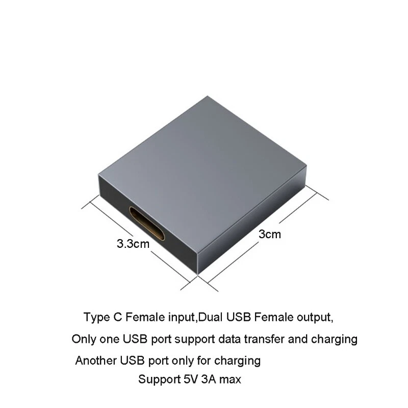 USB C Female to Dual USB Female Splitter Convter Adapter Extension Connector Features: and high Not only for charging,but also can transfer data USB Port for data and charging ,another USB Port only with charging function. Type C female port for Type C to Type C or USB to Type C male Data Cable,USB female for USB cable or USB keyboard and more.Need to use your own USB C Male cable to this Adapter,then become a USB Female Powered convertor. Type C female port input function,Dual USB Female port with output function,if use USB to Type C male cable to this adapter,will become USB male to female extension cable. USB C female to dual USB female adapters. Simple Plug and for Play, No Needed. Specifications: for Shell Metal Type: Accessories Color: Gray Size: 3x3.3cm Quantity: 1 Pc Package Includes: 1x USB C Female to Dual USB Female convertor note: Please allow 0-1cm error due to manual measurement. pls make sure you do not mind before you order. Due to the difference between different monitors, the picture may not reflect the actual color of the item. Thank you!