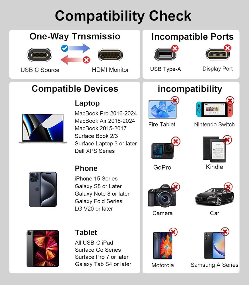 About this item 【Top Technology - Reborn USB C to HDMI 8K Cable】The Reborn USB C to HDMI 2.1 Cable adopts state-of-the-art technology. It supports 8K@60Hz/30Hz, 4K@120Hz/60Hz and 2K@240Hz/144Hz/120Hz, making every detail vivid and every signal precisely processed. With its unique Dynamic HDR and 12 Bit color processing technology of 8K HDMI, each video scene is enhanced. Every frame shows improved depth, brightness, detail and contrast, plus a wider color gamut 【Seamless Device Integration】Connect with ease! This USB C to HDMI 2.1 Cable is designed to effortlessly bridge the gap between your TYPE C-enabled device and any HDMI display. It's the perfect companion for laptops, tablets, and more, ensuring a smooth transition from USB C HDMI to a world of high-definition entertainment and productivity 【Plug and Play, Super Easy!】No hassle, instant amazing results! Our Reborn USBC to HDMI Cord is incredibly simple to use. Just insert it into the corresponding interface and watch your device come to life on the big screen. Whether you're a tech newbie or a seasoned pro, you'll love the effortless operation of this converter. *Note: Only Android phones with video output are supported 【Reliable and Durable Design】The Reborn USB Type C to HDMI Cable flaunts a premium nylon braided exterior and sleek aluminum shell, exuding high-end elegance. With a cutting-edge chip, it promises stable, high-speed connections, ideal for vital presentations, captivating movie nights, and thrilling gaming, built to endure and impress 【Compatibility Check】The Reborn 8K Thunderbolt 4 to HDMI Cable directly links laptops with USB-C/Type C/Thunderbolt 3 ports to HDMI monitors, TVs, or projectors. It's compatible with MacBook Pro (2016 - 2022), MacBook Air (2018 - 2022), iMac (2017/2020), Mac Mini (2016 - 2021), iPad Pro (2018 - 2022), iPad Air (2020 - 2022), Apple M1/M2 devices, Surface Book 3/Pro 7/Laptop 3, Chromebook, Dell XPS 13/15/17, Galaxy S9 - S22, iPhone 15/Pro/Plus/Max and more Product Description Reborn USB C to HDMI 2.1 cable (8K@60Hz, 4K@144Hz, 2K@240Hz). The TYPE C/M is the signal input port. The HDMI output resolution is 7680*4320@60HZ and is downward compatible with resolutions such as 3840*2160@60Hz、 120Hz、2560*1440@60Hz、120Hz、1920*1080@60Hz、120Hz, etc. (To achieve 8K resolution, both the graphics card and the display need to support 8K). Connector: Input: USB-C Output: HDMI2.1 Specification: Shape: Small, lightweight, and easy to carry. Installation method: Plug and play, no driver or software required. Gold-plated connector: Optimized performance and corrosion resistance. High-quality aluminum alloy: Excellent heat dissipation effect. Ultra-high speed: Supports up to 8K@60Hz resolution. Package contents: 1X Reborn USB C to HDMI 2.1 cable 6 FT Shipping We offer FREE shipping on all orders! We ship within Three business days of payment, usually sooner. We use a selection of shipping services such as UPS, FedEx, USPS etc. We only ship to the lower 48 states, no APO/FPO addresses or PO Boxes allowed. Local pickups and combined shipping options are not provided at this time. Return You can return a product for up to 30 days from the date you purchased it. Any product you return must be in the same condition you received it and in the original packaging. Please keep the receipt. Payment We accept payment by any of the following methods: PayPal Please pay as soon as possible after winning an auction, as that will allow us to post your item to you sooner! Feedback Customer satisfaction is very important to us. If you have any problem with your order, please contact us and we will do our best to make you satisfied. Contact Us If you have any queries, please contact us via ebay. We usually respond within 24 hours on weekdays. Please visit our eBay store to check out other items for sale! Thank you for shopping at our store. Disclaimer We are working with different suppliers in USA to deliver the item to your doorstep. If you have any issues regarding the item, Feel free to ask.