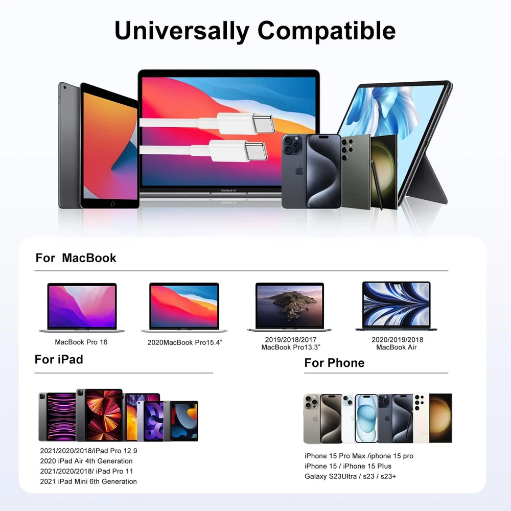 USB C to USB C Cable for MacBook Air MacBook Pro Charger, for iPad Pro 12.9 11 inch, Pad Air 5 4, Mini 6, 6FT&10FT Fast Charging Cable Compatible with iPhone 15/Plus/15 Pro/Pro Max/Mac Air and More 100W USB C to Type c Cord Charger for MacBook Pro 16, 15, 14, 13 inch, MacBook Air 2020/2019/2018,iPad Pro/Air, Compatible All USB C PD Charger macbook pro charger cord mac air charging cable 【100W 2M and 3M combination】: Combination of different lengths for flexible use. For shorter distance usage scenarios, you can use a 2M Macbook pro charger usb c cable with a PD wall charger to charge your device, which can meet daily usage needs at a desk and other short-distance scenarios without the hassle of a long charging cable. For longer distance usage scenarios, you can use a 3M type c charger cord to charge your macbook air, which can meet your needs for charging your device while lying on the couch or in bed 【Universal Compatibility】This type to type c cable Compatible with 65W/61W/45W/35W/30W/25W/22.5W/20W/18W/15W/12W/5W All USB C charger.Compatible with iPhone 15/15 Plus/15 Pro/15 Pro Max, MacBook Pro 13 inch, Macbook Air 13 /m1 Inch, MacBook 12 inch, Pad Pro 12.9/11 inch, Pad Air 4/5, Pad Mini 6, Google Pixel 6/6 Pro/5/5a, Galaxy S24/S23/S22/S21/S20/S20+/S20 Ultra, Galaxy A53/A73/A71,Galaxy Note 10/10+/20 Ultra, Switch, PS5 and other USB-C port devices 【Super Fast Charging and Data Transfer】: Experience super-fast charging with our 100W mac charger cord that outperforms 60W c cords by 58%. Safely charge your laptop in just 1.5 hours and get your phone from 0% to 80% in just 20 minutes. Plus, enjoy high-speed data transmission up to 480Mbps while charging 【Resistant Material Casting High Quality】: Experience ultimate resistant with our type c charger fast charging cord featuring a laser-welded 3D aluminum connector that's resistant to breaking and rusting, and a robust TPE sheath that's flame-retardant and safe to use 【Certified Safety】: Ensure the safety and stability of your electronic devices with our Macbook Pro charger USB-C cable. It has passed standard electronic safety certification and features an intelligent current fast and stable input. Plus, its built-in E-marker chip provides a secure and snug fit Shipping from the USA All of our products are shipped from the USA, ensuring quick delivery to your destination. Payment We offer the following payment methods: PayPal, credit card, bank transfer, and eBay's secure payment system. Free Shipping & Free Returns Shipping within the USA is FREE. Additionally, any return is absolutely free for you. Risk-Free Purchase You have the option to return an item within 30 days without any justification. We cover the return shipping costs! Fast Shipping We ship immediately upon receipt of payment. Generally, the package is delivered within 2-3 days in the USA. If it takes longer, we will contact you. Quality and Costs Made in Europe, USA, China No customs fees or additional charges Total satisfaction guarantee Invoice with declared VAT available upon request in .pdf format Feedback Your feedback is very important to us. After you pay for your purchase, you will automatically receive positive feedback from us.