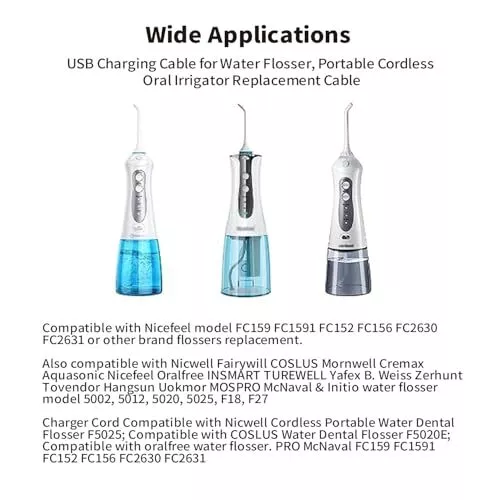 [Wide Compatibility] Specifically designed to be a replacement charger for popular water flosser brands, including Nicwell, Fairywill, Aquasonic, Nicefeel, Oralfree, MOSPRO, Cremax, Tovendor, Hangsun, Insmart, and Zerhunt. Perfect fit for various cordless oral irrigators. Compatbile with Nicefeel model FC159 FC1591 FC152 FC156 FC2630 FC2631 or other brand flossers replacement. [Wide Compatibility] Also compatible with Nicwell Fairywill COSLUS Mornwell Cremax Aquasonic Nicefeel Oralfree INSMART TUREWELL Yafex B. Weiss Zerhunt Tovendor Hangsun Uokmor MOSPRO McNaval & Initio water flosser model 5002, 5012, 5020, 5025, F18, F27; Charger Cord Compatible with Nicwell Cordless Portable Water Dental Flosser Nicwell F5025; Compatible with COSLUS Water Dental Flosser F5020E; Compatible with oralfree water flosser [Durable & Reliable] Made with high-quality materials, this USB charging cable ensures a stable and secure connection, providing consistent power to your water flosser. Built to withstand frequent use and offer long-lasting durability. [Portable & Convenient] With its compact and lightweight design, this charger is perfect for travel or daily use. Simply plug it into any USB port, such as your laptop, power bank, or wall adapter, for quick and easy charging anywhere you go. [Fast Charging] Equipped with fast-charging technology, this cable significantly reduces charging time, ensuring your water flosser is ready to use when you need it. Experience a full charge in less time, making your oral care routine more efficient. [Safe & Secure] Designed with multiple safety features, including over-voltage, over-current, and short-circuit protection, this USB charging cable safeguards your device from potential damage, providing peace of mind during charging.