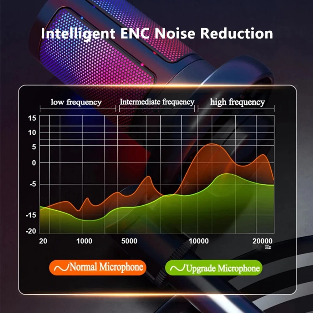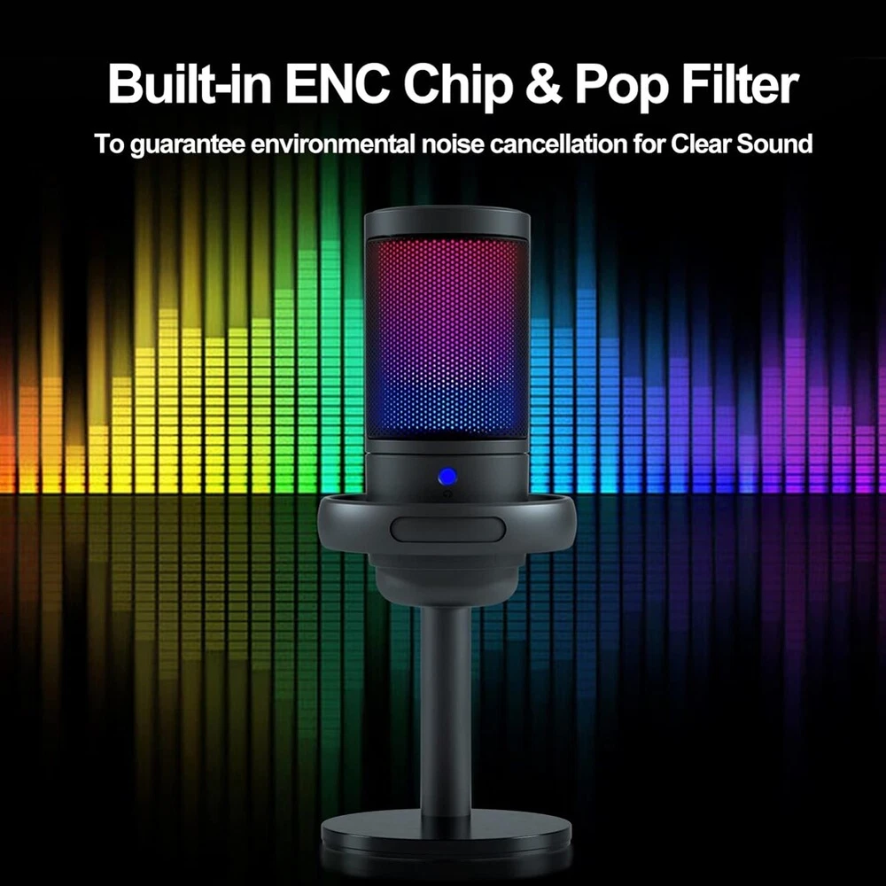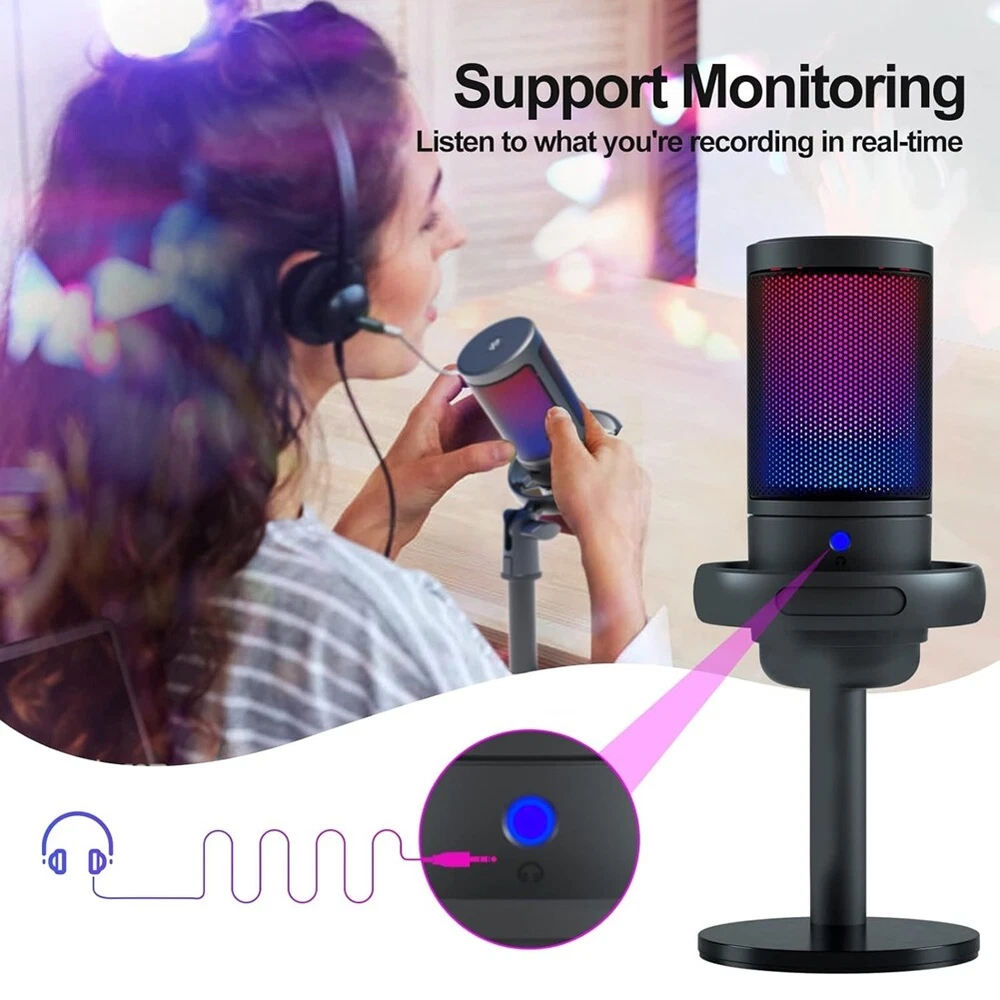 USB Condenser Metal Microphone Professional Recording Streaming with RGB1860 Plug and play USB Microphone that connects to your computer or laptop directly via USB port(work with for and Vista, XP), recording your music or podcast effortlessly. A recording microphone with dedicated gain volume knob itself, for louder output and more sensitive, your voice would be heard crispy and clean when using it in gaming , skyping or voice recording. USB microphone with cardioid pattern for recording, captures your voice clearly and smoothly when the microphone is pointed towards you. The rugged body and robust stand come in handy when you're dubbing or broadcasting for . The microphone can be connected to the 3.5mm headphone jack, allowing you to directly monitor the sound in real time without delay, or listen and record at the same time. -touch mute button on the top allows you to prevent audio accidents, as much as you can control Material: Metal+Plastic colour: Black Package Contents: 1 x Gaming RGB Microphone