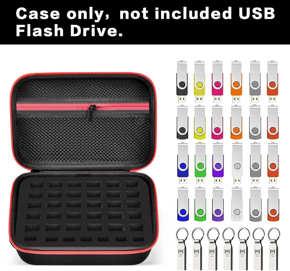USB Flash Drive Case 37 Slots SD Cards Thumb Memory Card Holder red Product Details Package Dimensions: 10.59 x 6.61 x 3.19 inches Item Weight: 4.6 ounces Special features: Heavy Duty Protection, Lightweight Form Factor: Case Color: red Whats in the box: 1 Manufacturer: PAIYULE Brand: PAIYULE Compatible Devices: Memory Cards Shell Type: Hard Large Capacity USB Memory Stick Case- Holds 48pcs: USB flash drive storage case design for SanDisk/for Samsung /for INLAND/for PNY/for Netac/for TOPESEL/for MECHEER/for Mosdart/ for SamData 64GB 16GB 128GB 256GB 32GB and more USB drives, thumb drive, memory card, ssd card, coins. Keep all electronic accessories well-organized and protected.(CASE ONLY NO USB FLASH DRIVE INCLUDED) Great Material USB holders: Made of waterproof PU leather, shockproof EVA inner. Hard material protect your USB flash drive from scratch and damage like bumps, minor drops, humidity, dust, etc. Strong 360 degree zipper with nice smooth and sturdy design, easy opening and closing. The USB flash drive case can hold your USB without any worry. Great Construction: Comfortable insert foam with different slot fits your multiple USB drives of various sizes, 0.75’’*0.4’’can fits for SanDisk/for KOOTION/for Exmapor/for RAOYI/for Samsung bigger size flash drive, 0.5’’*0.25’’fits for small size USB like for KEXIN, Stand up design fits your flash drive snug and safe. Not too tight, easy to put in and out of the case. Electronic Accessories Pocket: Inner mesh pocket offer you more space for ssd cards, SD SDXC SDHC Card, MP3 players, micro sd cards, headphone cords and external hard drives. Zipper design protect your accessories not easy fall off. Keep all set safety. Compact & Lightweight:Portable size 7.5*2.75*5.25 inches with strong hand strap. Easy to take your USB flash drive out and no more loss your small USB sticks. Best present for family and friends.