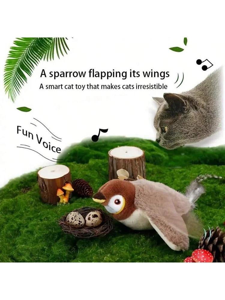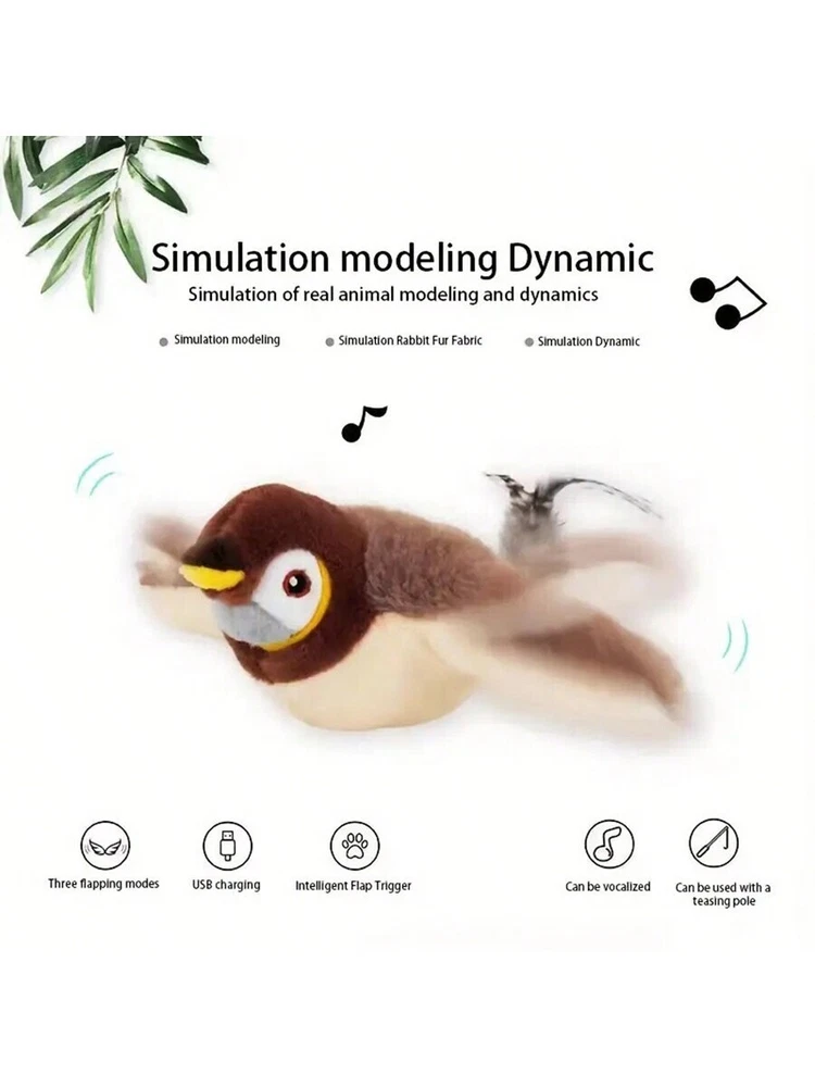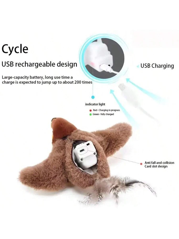 USB Interactive Flying Bird Cat Toy - Electronic Pet Simulation Sparrow Toy USA Keep your cat entertained with this fun, interactive flying bird toy! Perfect for encouraging your cat's natural hunting instincts, this electronic sparrow toy flaps its wings and moves around, providing hours of entertainment for your furry friend. Features: Interactive Flying Action : Bird flaps its wings and moves around, mimicking real-life flight. USB Rechargeable : Convenient charging via USB cable, no need for batteries. Durable & Safe : Made from non-toxic, pet-safe materials for your cat’s safety. Perfect for Play : Engages your cat’s natural hunting and chasing instincts. Great for Indoor Fun : Ideal for keeping your cat active and entertained indoors. Realistic Design : Looks like a real sparrow, adding excitement to playtime. Easy to Use : Simple operation with easy-to-follow instructions. Ideal Gift for Cats : A fun and unique toy for your cat to enjoy. Bring endless fun to your cat with this USB-powered, interactive flying bird toy! Package Contains 1x Flying Bird Cat Toy