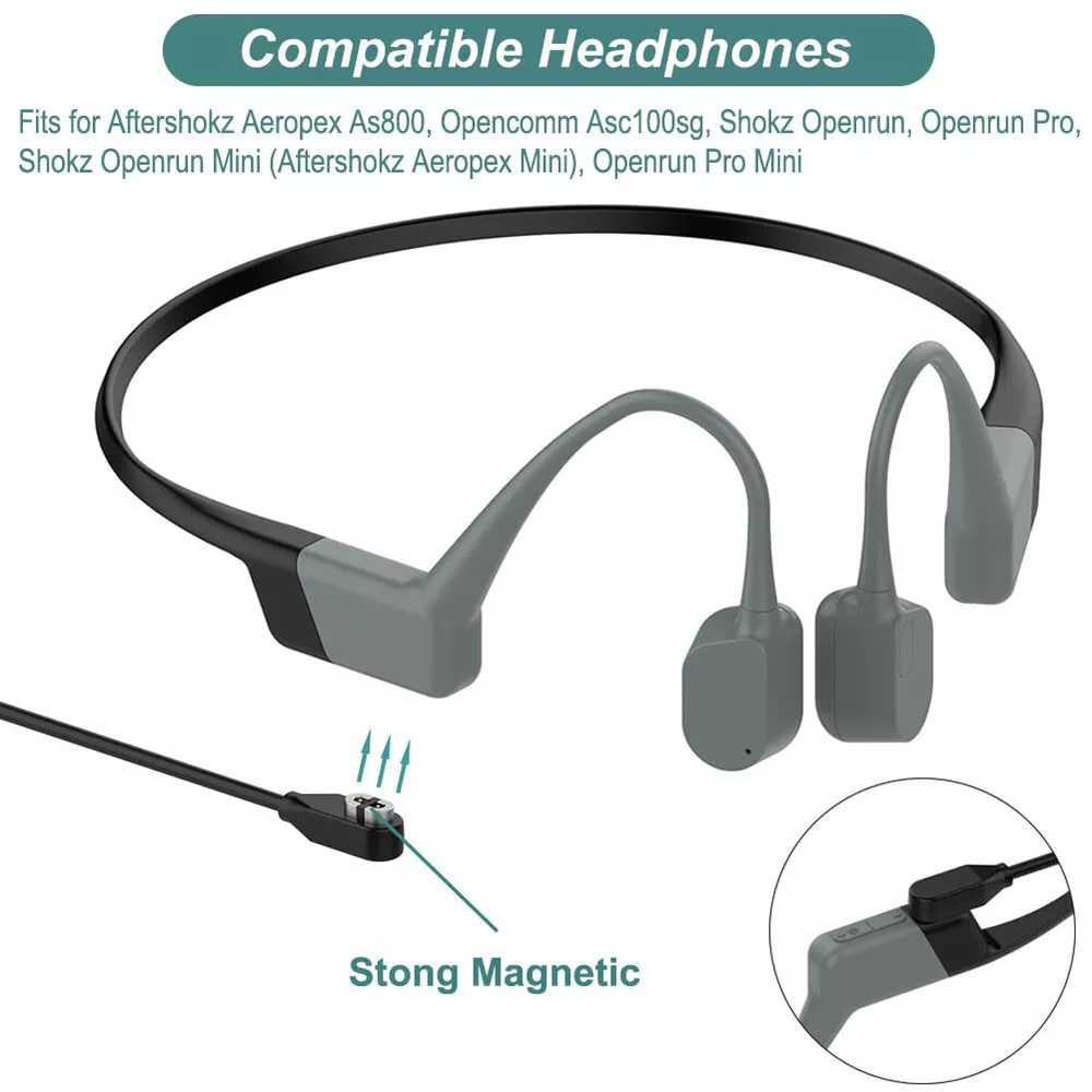 Description: Quick Charge with Magnetic Charging Cable. Lost your OpenRunPro/OpenRun/Aeropex charger? No worries, we’ve got your back. The magnetic cable allows you to quickly charge your OpenRunPro/OpenRun/Aeropex headphones on-the-go. Wide Compatibility: Replacement Charging Cable Compatible With Aftershokz Aeropex As800, Aftershokz Opencomm Asc100sg, Shokz Openrun Pro, Shokz Openrun, Shokz Openrun Mini (aftershokz Aeropex Mini), Openrun Pro Mini Durable & Premium Quality: Made of high quality wire; ensure the excellent charging experience for your Device. Durable High-quality ABS + PVC Material and Copper Wire ensures Stable Current Transmission, which assures the quality of the charger Fast Charge, Stable Performance: You can connect with the power adapter, car adapter, power bank, laptop and so on, those charging method can provide high efficiency and high stability charging experience for you Magnetic Charging: Built With Strong Magnetic Charging Module, Can Easily Connect To Your Headphones,convenient To headphones and chargers,no Need To Worry About Suddenly Loosening When Charging. Dimension: 3.3ft/1 Meter Package Includes : 1x Fast Magnetic USB Charger for Shokz