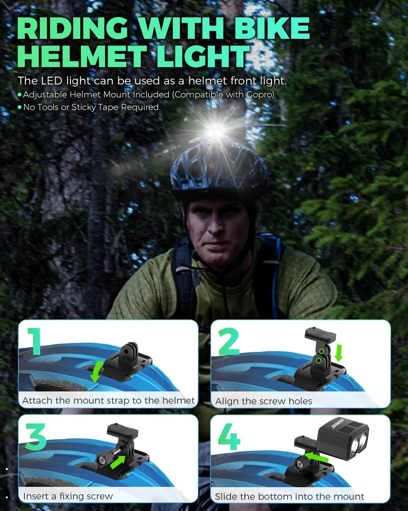 Description: Product Name: bike helmet light Lighting Modes: 5 modes of High-Medium-Low-Strobe-SOS Battery: 1200mAh rechargeable battery Lumens: 1000 Weight: 93g Package Include: 1*helmet light 1*instruction manual 1*helmet mount 1*handlebar mount 1. Brighten up every ride with our premium Rechargeable Bike Helmet Light, your essential cycling companion designed for safety, visibility, and convenience. 2. Equipped with a powerful LED light, this bike helmet light accessory ensures you’re always seen, whether you’re commuting through city streets or tackling evening trails. 3. Our helmet light features a USB-rechargeable 1200mAh battery that offers up to 6 hours of reliable illumination, keeping you covered for longer rides. With 5 modes of High-Medium-Low-Strobe-SOS—this light adapts to any cycling environment, enhancing safety in all conditions. 4. The bike helmet light is controlled with a single button for easy, on-the-go adjustments, so you can focus on the road ahead. 5. The secure, quick-mounts fits most helmets/handlebars and installs in seconds, staying firmly in place without adding bulk. Can be used as a helmet light and bike front light. 6. IP65 waterproof rating, this helmet light is built to withstand rain, snow, and mud, making it the perfect companion for year-round cycling. Choose reliability, visibility, and safety—ride with confidence every time. Ultra-Bright LED Visibility: Stay safe on the road with bike helmet light of high-intensity 1000 lumens LED lights that offer superior visibility in low light and nighttime conditions. Ensures you're seen by pedestrians and other cyclists or drivers. Rechargeable & Long-Lasting Battery: This bike helmet light is USB rechargeable with 1200mAh battery and delivers up to 6 hours of illumination on a single charge. Eco-friendly design with power-saving modes for extended usage. 5 Lighting Modes for Versatility: The bicycle helmet light offers 5 light modes of High-Medium-Low-Strobe-SOS to adapt to various riding conditions and maximize visibility. Easy one-button control for switching modes. Quick & Secure Mounting: The bike helmet light offers 2 simple and secure mounts. One is to install on the helmet and another one is to install on handlebars. You can decide to use is as a helmet light or a bike front light. Waterproof & Weather-Resistant: Designed to withstand all weather conditions, this mountainbike helmet light or bike headlight is IP65 waterproof, keeping it reliable and effective even during rainy rides or rugged outdoor use.